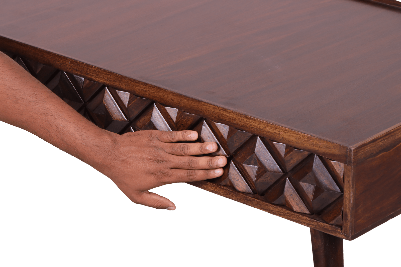 Design: Mid-century modern style with tapered legs and a geometric 3D carved front panel for visual interest