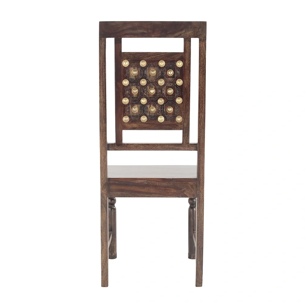 With its warm walnut finish, ornamental brass inlays, and hand-turned wooden legs, the Bakra Dining Set creates a visually engaging centerpiece for any dining room. It fits effortlessly in both classic and contemporary spaces, making it an ideal choice for homeowners who value quality, tradition, and elegance in equal measure.