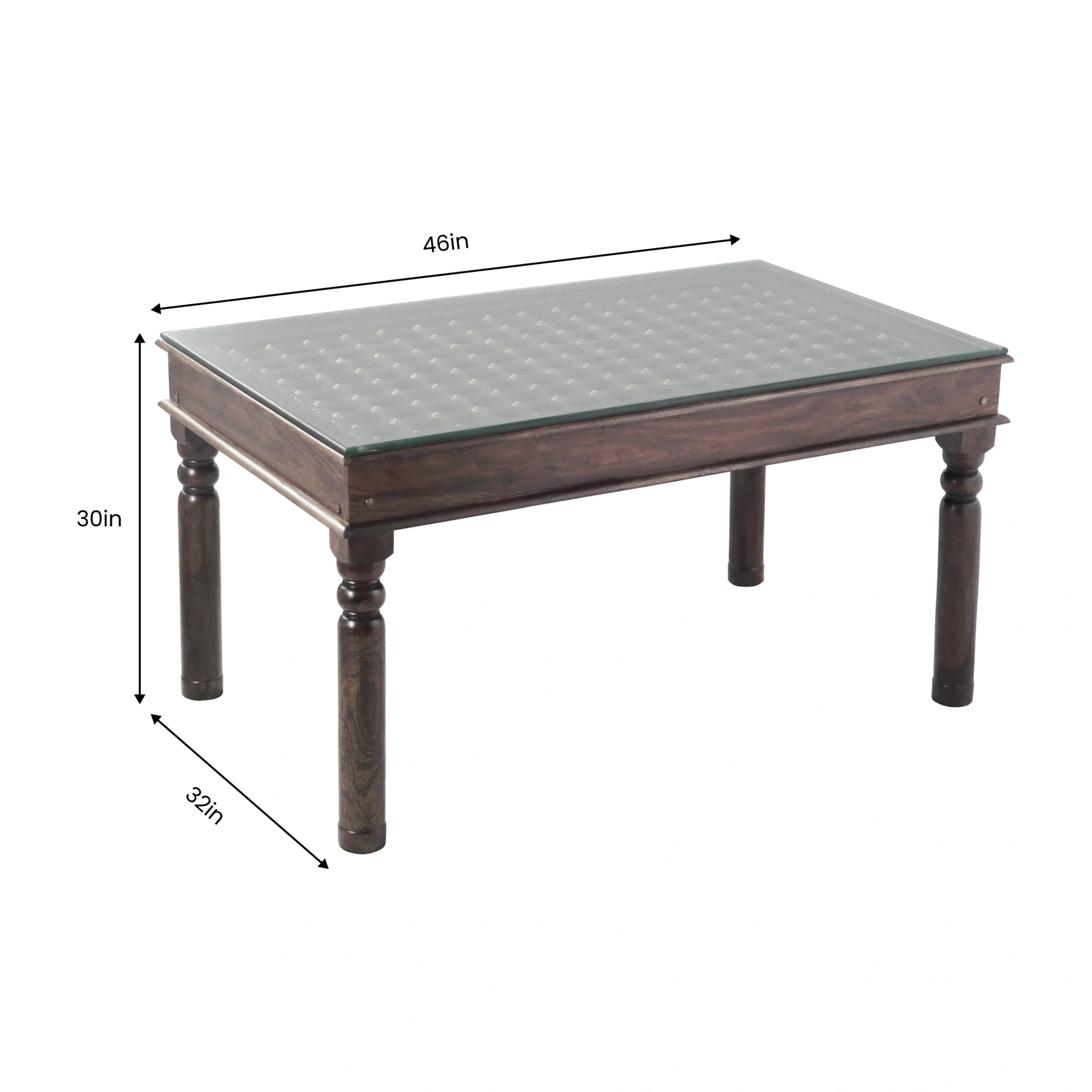 At the heart of this set is a rectangular dining table with a smooth, transparent glass top, revealing the intricate artistry beneath. The tabletop is accentuated with detailed brass studded embellishments, giving it a touch of regal sophistication and reflecting the craftsmanship of traditional Indian décor. The glass surface enhances visual appeal while also offering practicality for daily use and easy maintenance.