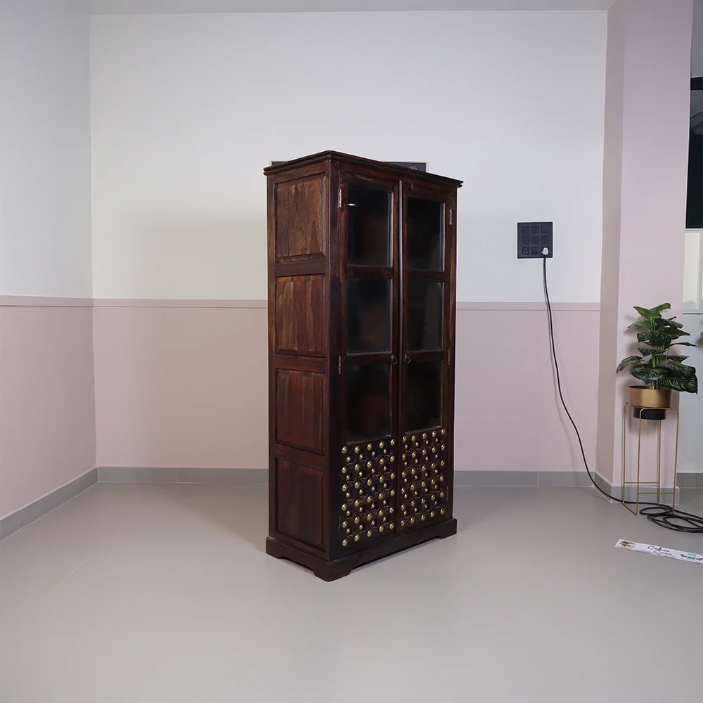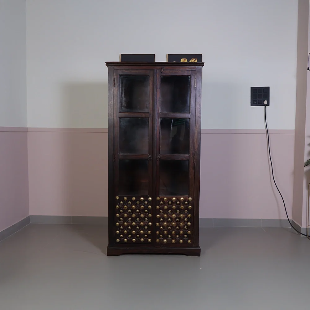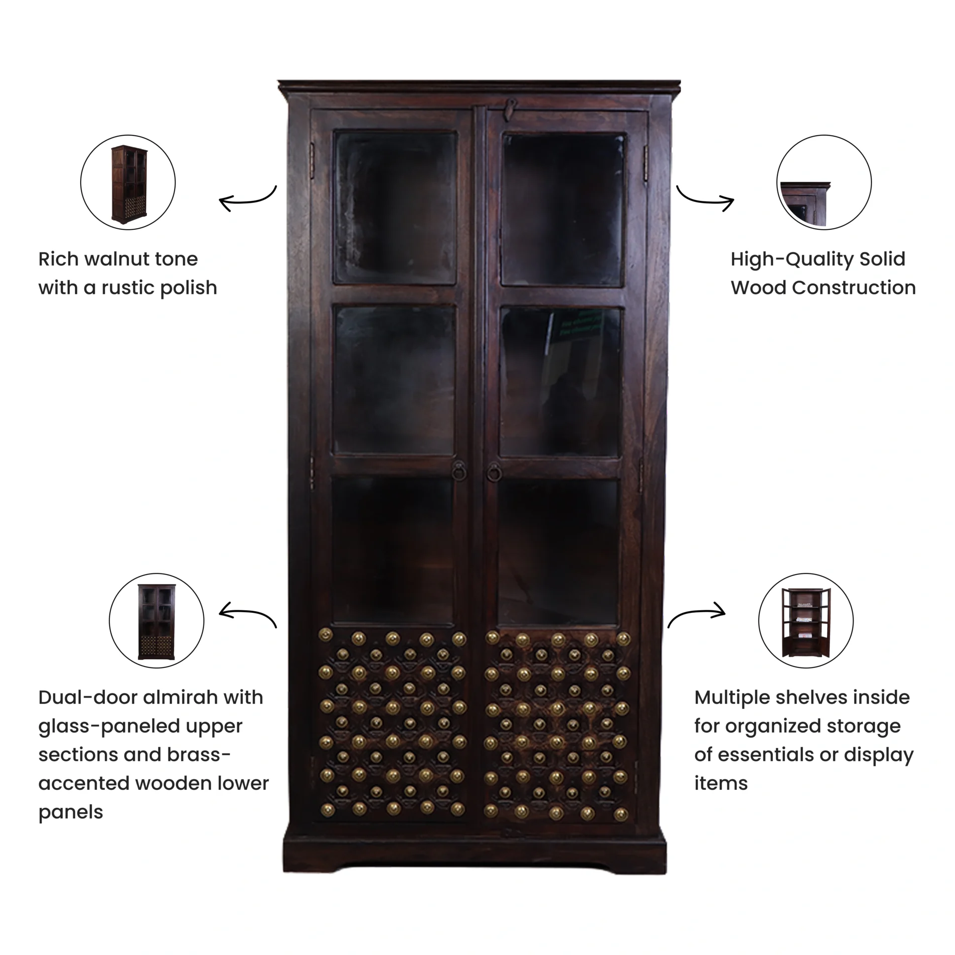 Design: Dual-door almirah with glass-paneled upper sections and brass-accented wooden lower panels