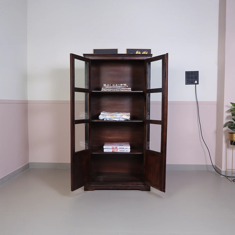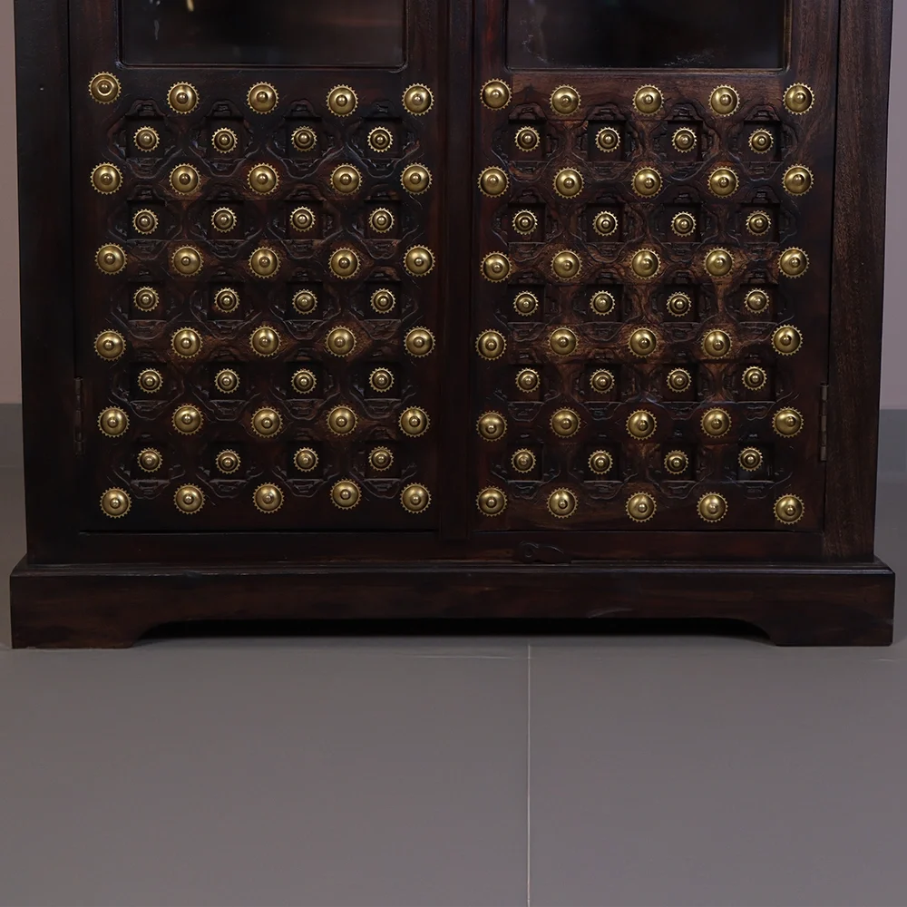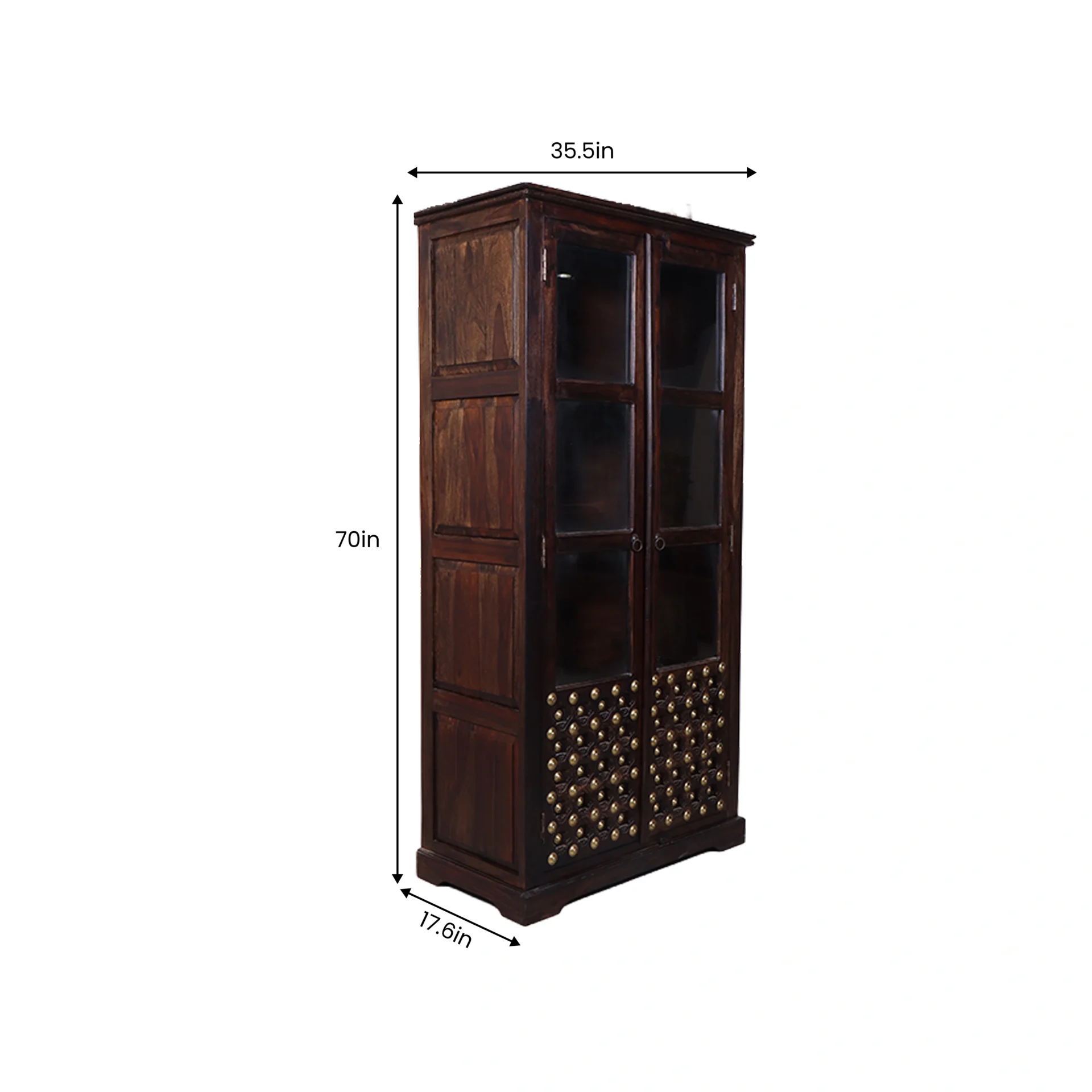 Design: Dual-door almirah with glass-paneled upper sections and brass-accented wooden lower panels