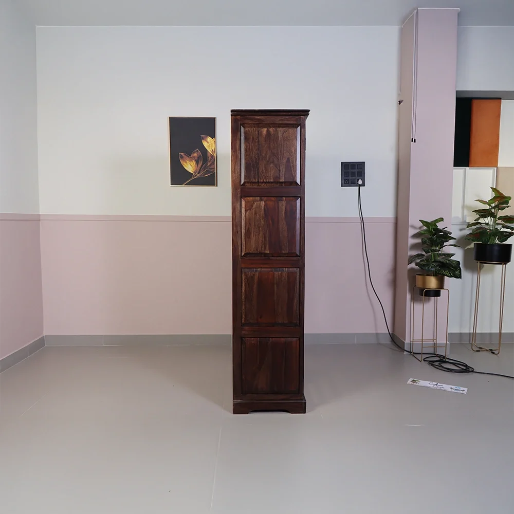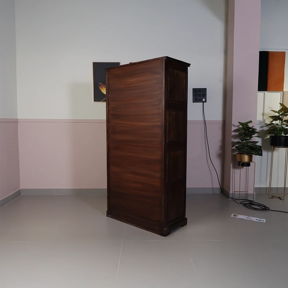Add a regal touch to your interiors with the Bakra Glass Wooden Almirah a statement piece crafted from premium Sheesham wood and designed to exude old-world charm. The upper glass panels offer a peek into the contents inside, perfect for showcasing crockery, books, or collectibles, while the bottom half features intricately carved brass-fitted “bakra” knobs that bring a traditional aesthetic.