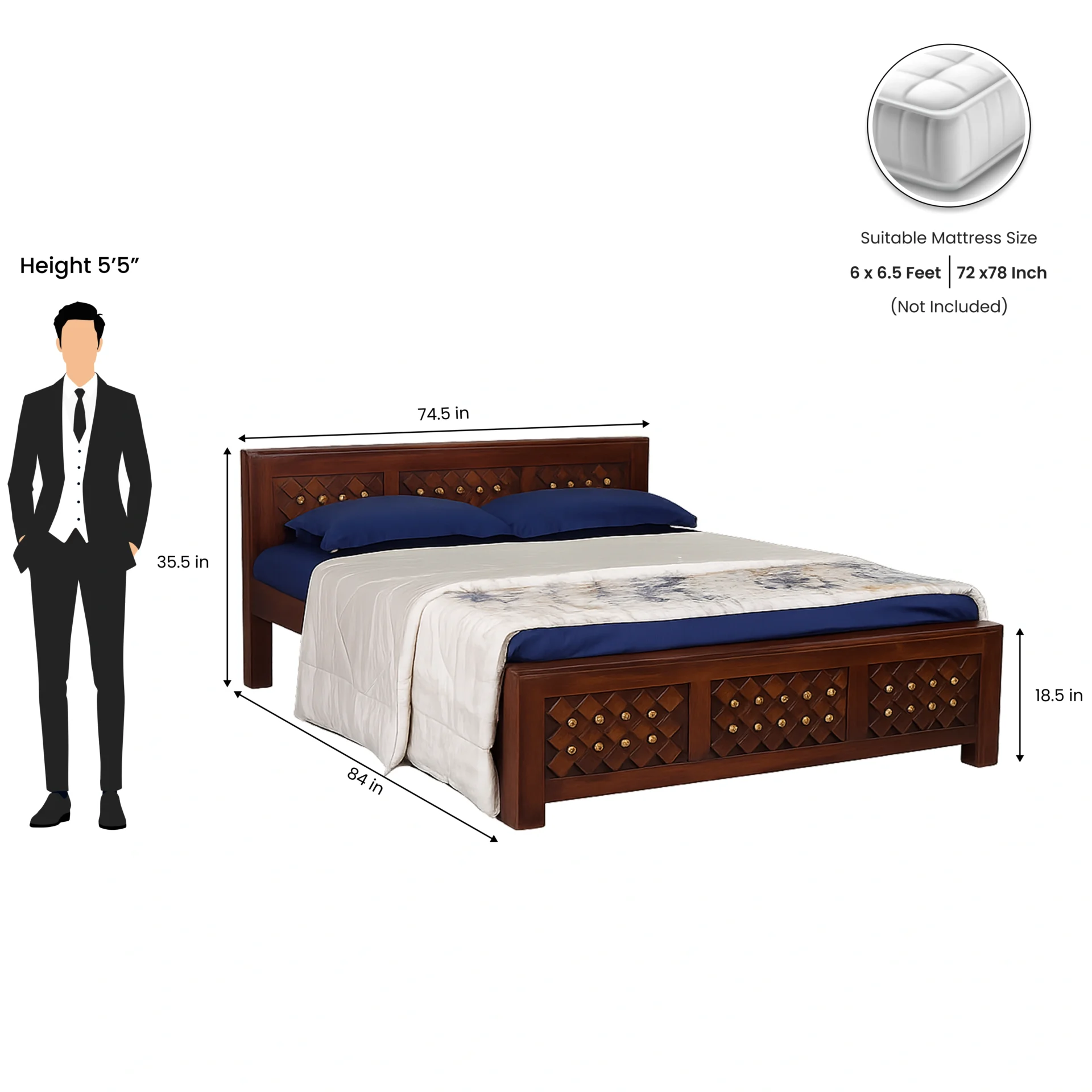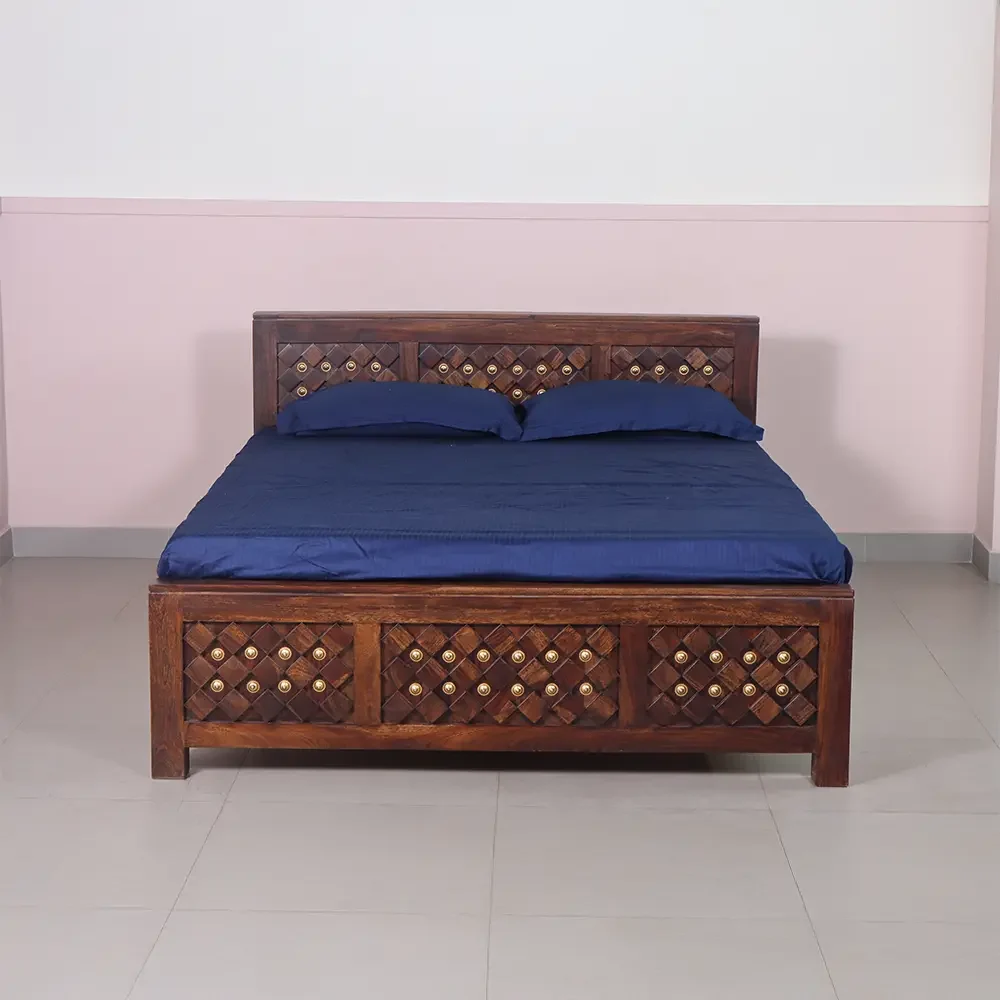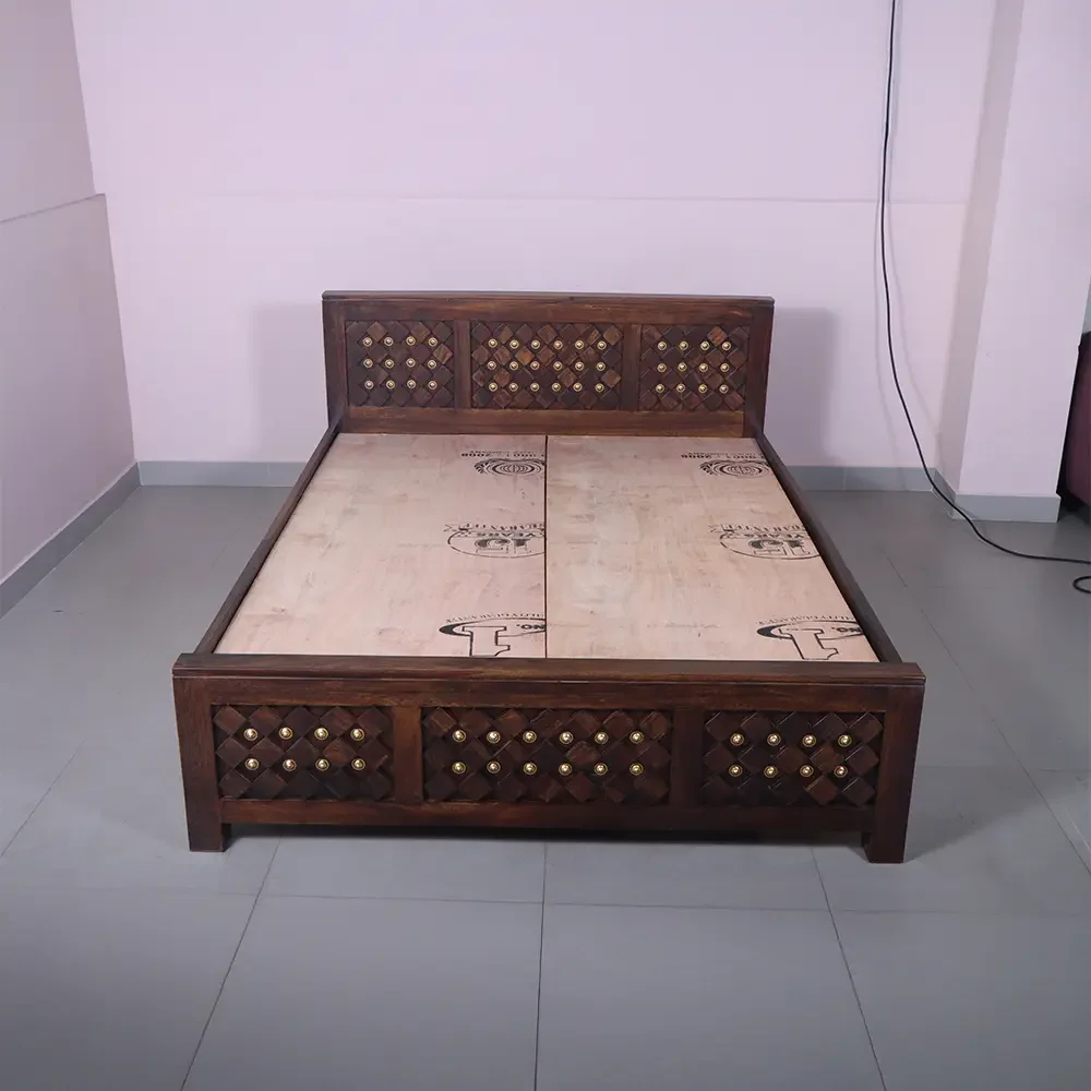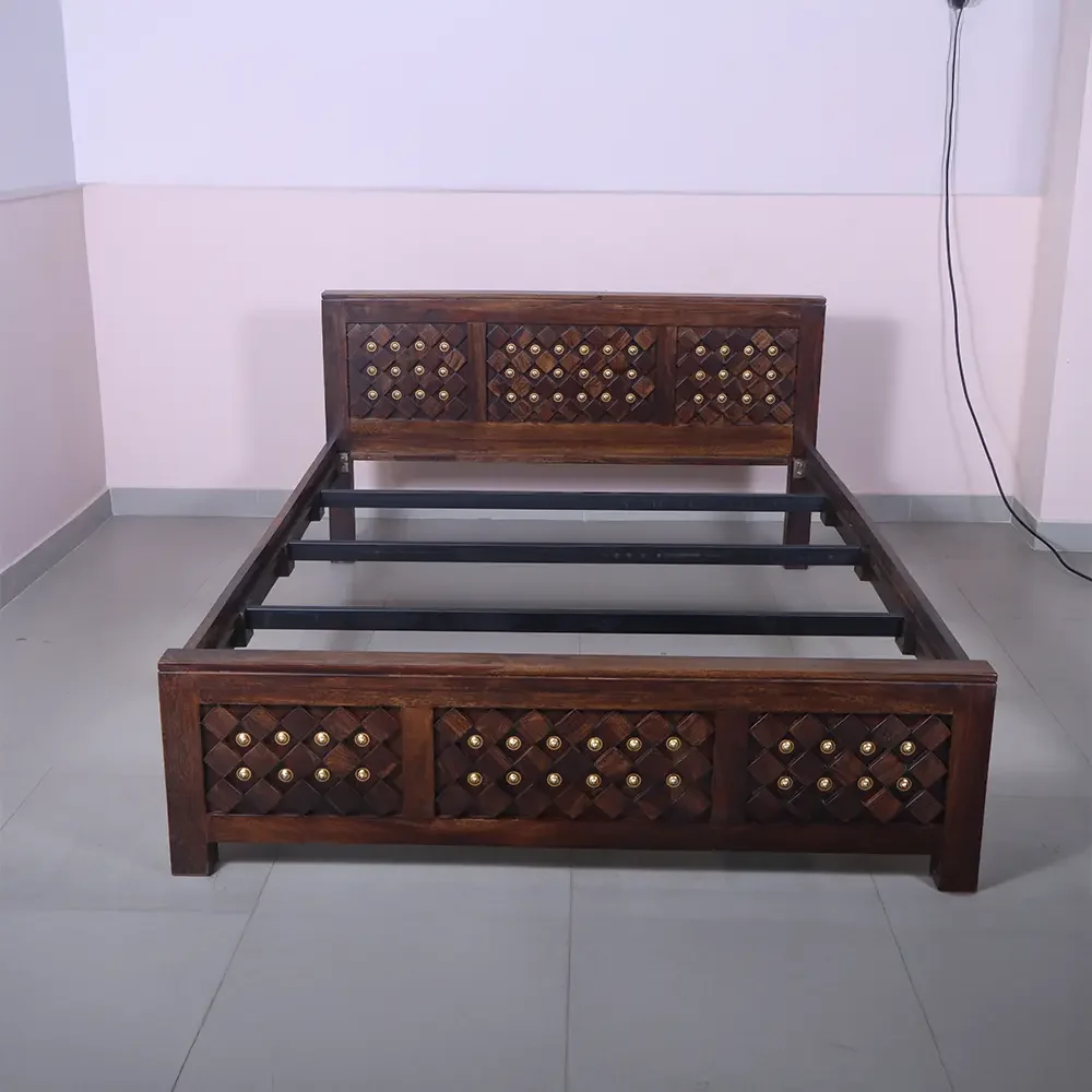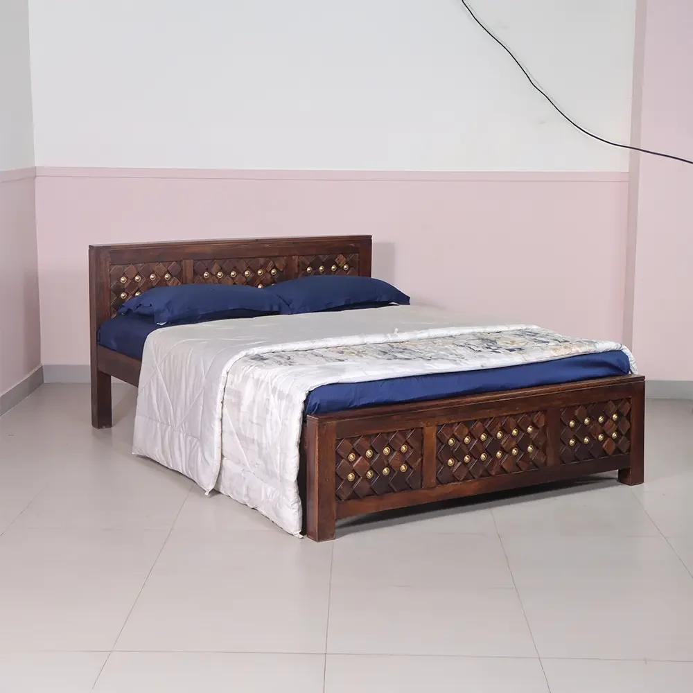 Bring a blend of tradition and timeless elegance to your bedroom with the Beas Barfi Cot, a King size bed crafted from premium Sheesham wood. Accented with delicate brass buttons on the headboard and footboard, this non-storage bed exudes a regal charm and artisanal detail that makes it truly one of a kind.