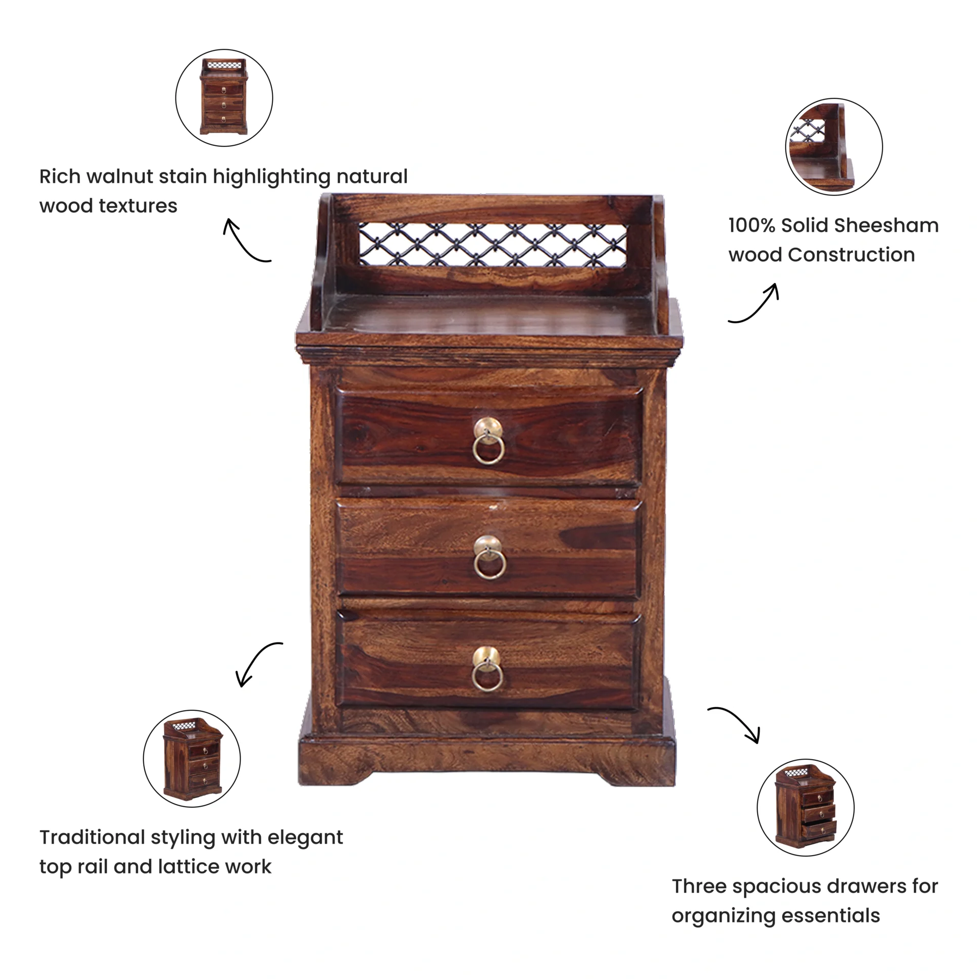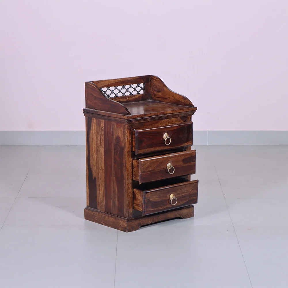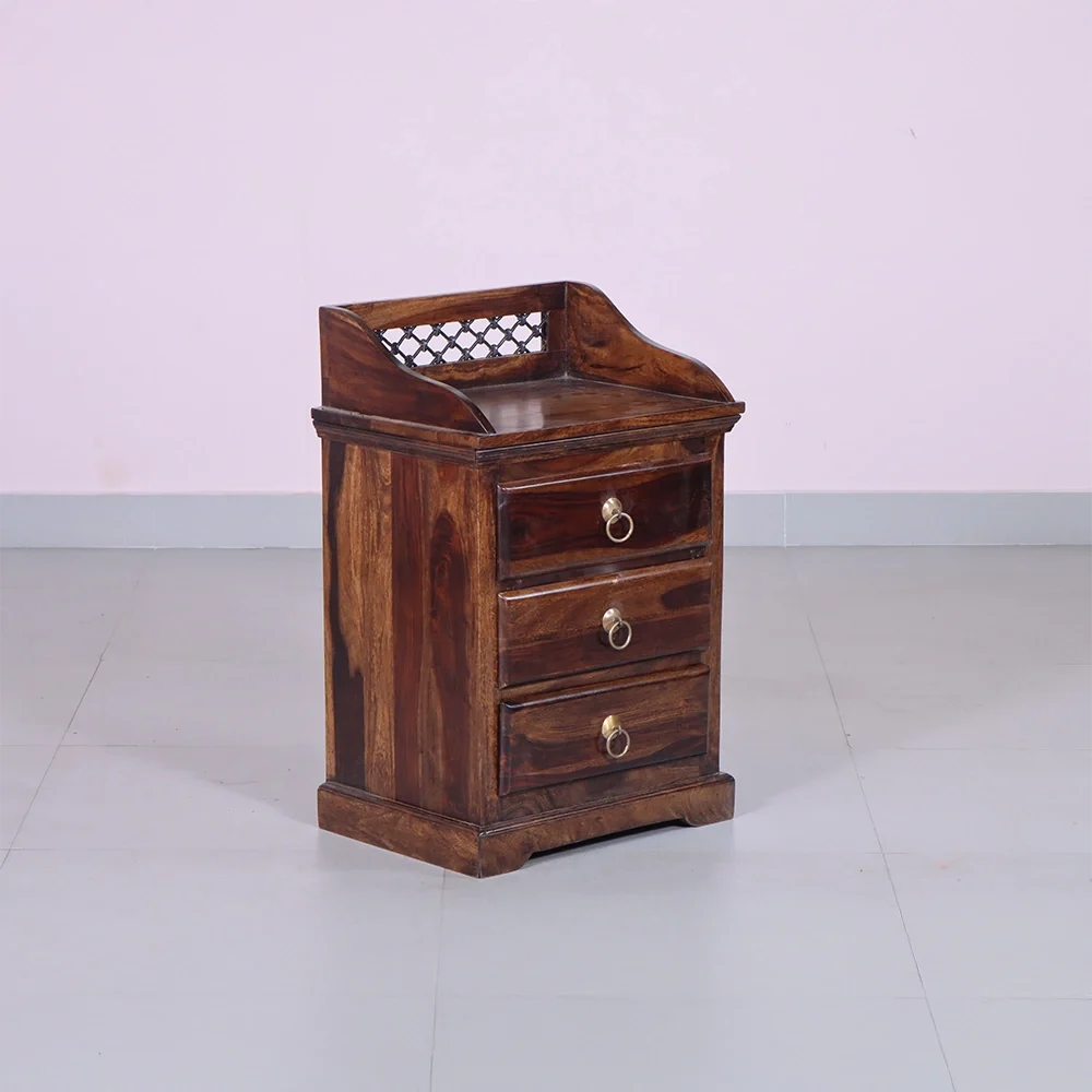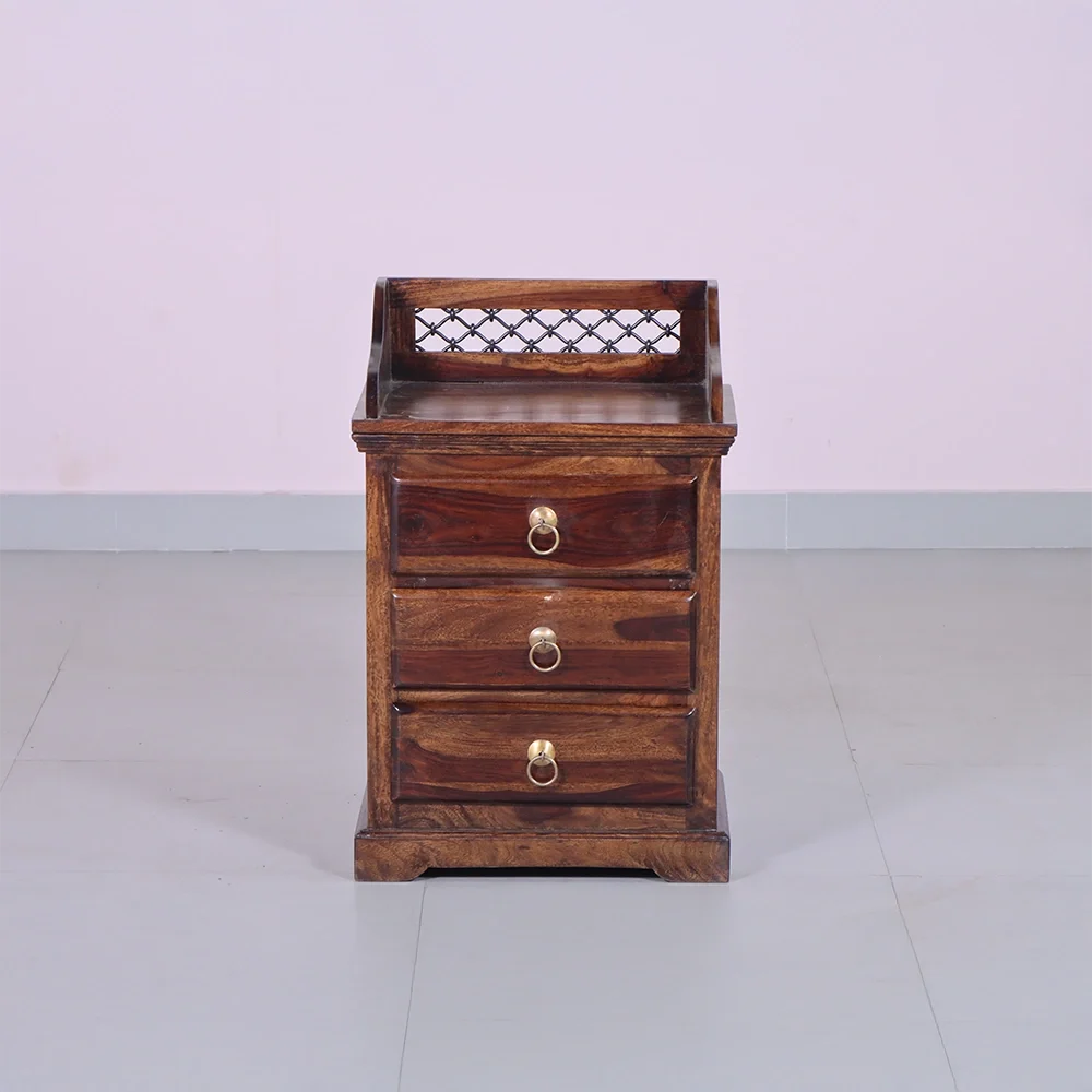 Add a touch of timeless charm to your bedroom with the Chester 3 Drawer Bedside Table. Crafted from rich Sheesham wood, this piece showcases the natural beauty of its grain while offering practical storage. The classic design is elevated by brass ring pull handles and a beautifully carved top with lattice detail, making it a perfect blend of traditional elegance and modern functionality.