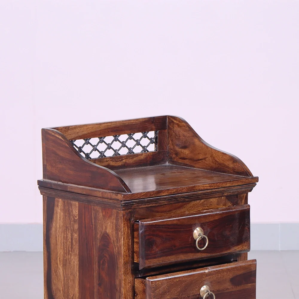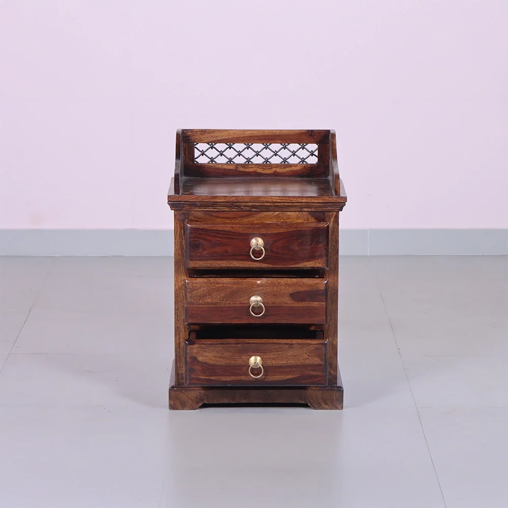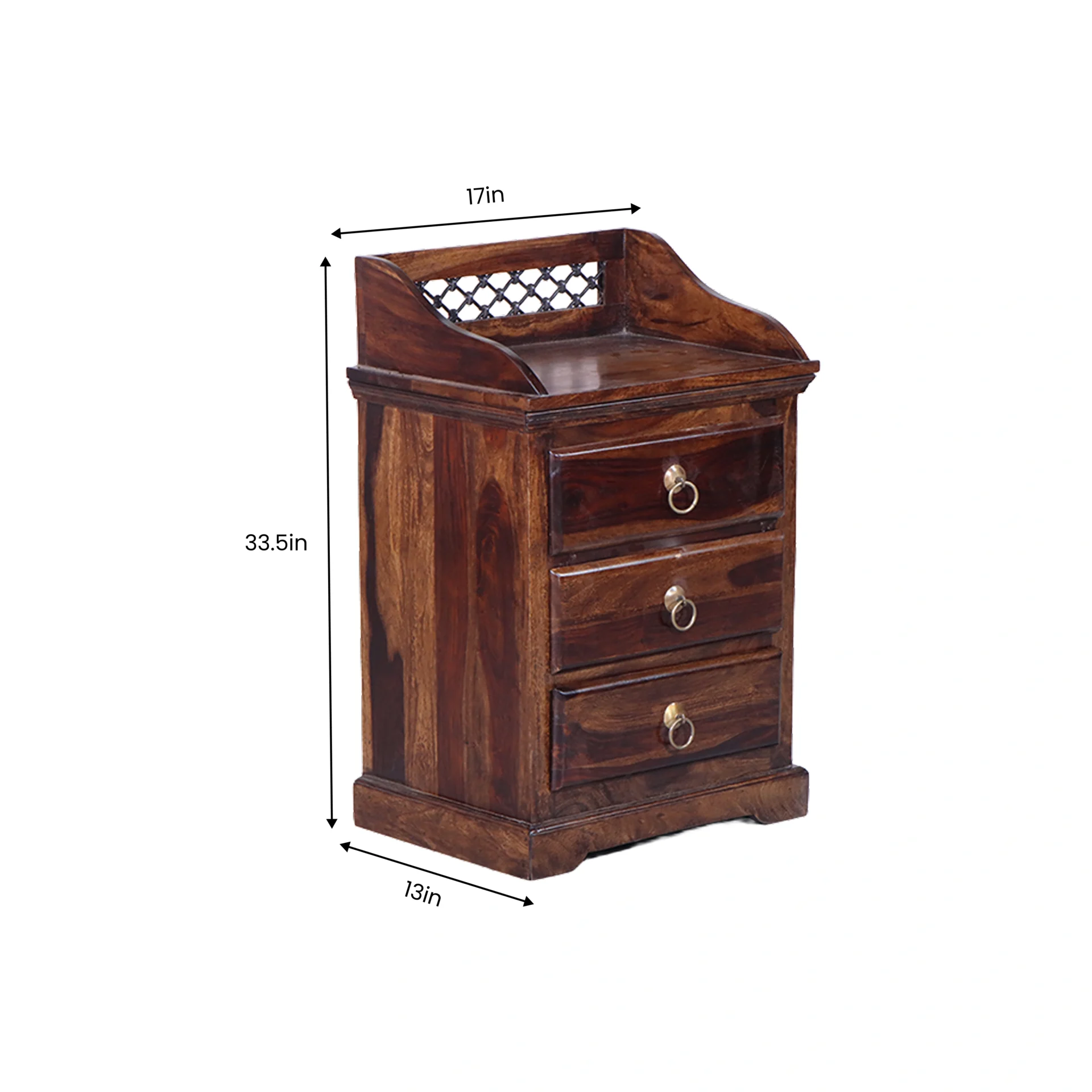 Add a touch of timeless charm to your bedroom with the Chester 3 Drawer Bedside Table. Crafted from rich Sheesham wood, this piece showcases the natural beauty of its grain while offering practical storage. The classic design is elevated by brass ring pull handles and a beautifully carved top with lattice detail, making it a perfect blend of traditional elegance and modern functionality.
