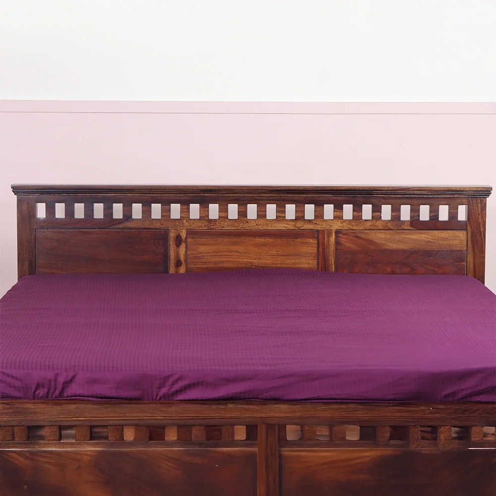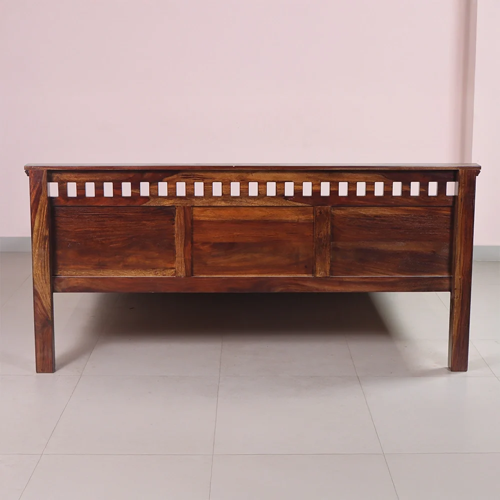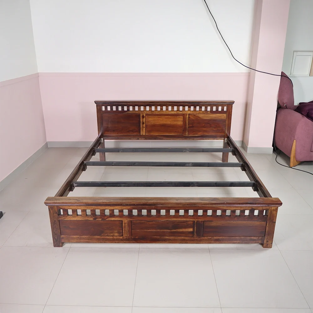The mattress is supported by a 12 mm plywood base, which is further reinforced by three iron rods to enhance the bed's structural strength and load-bearing capacity.