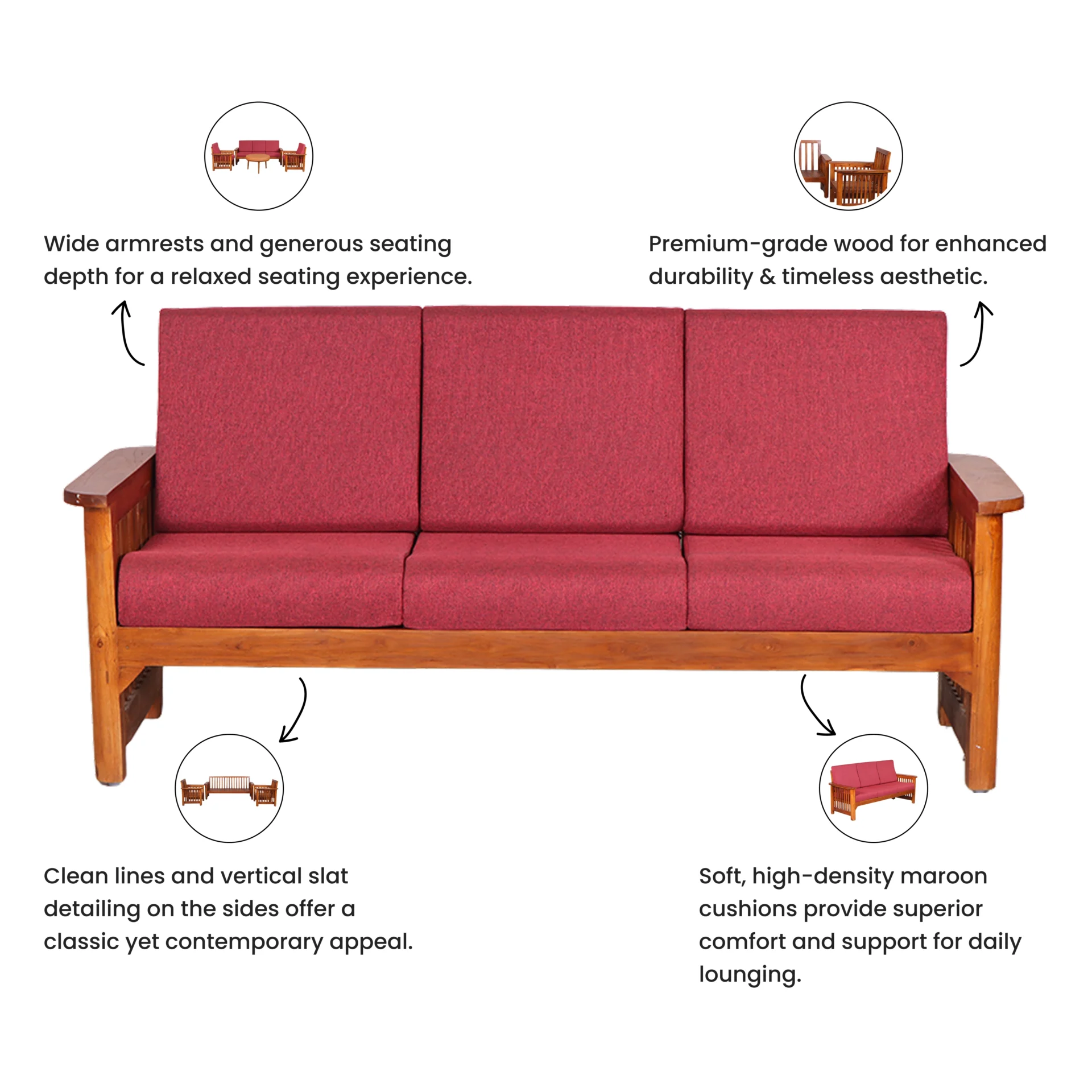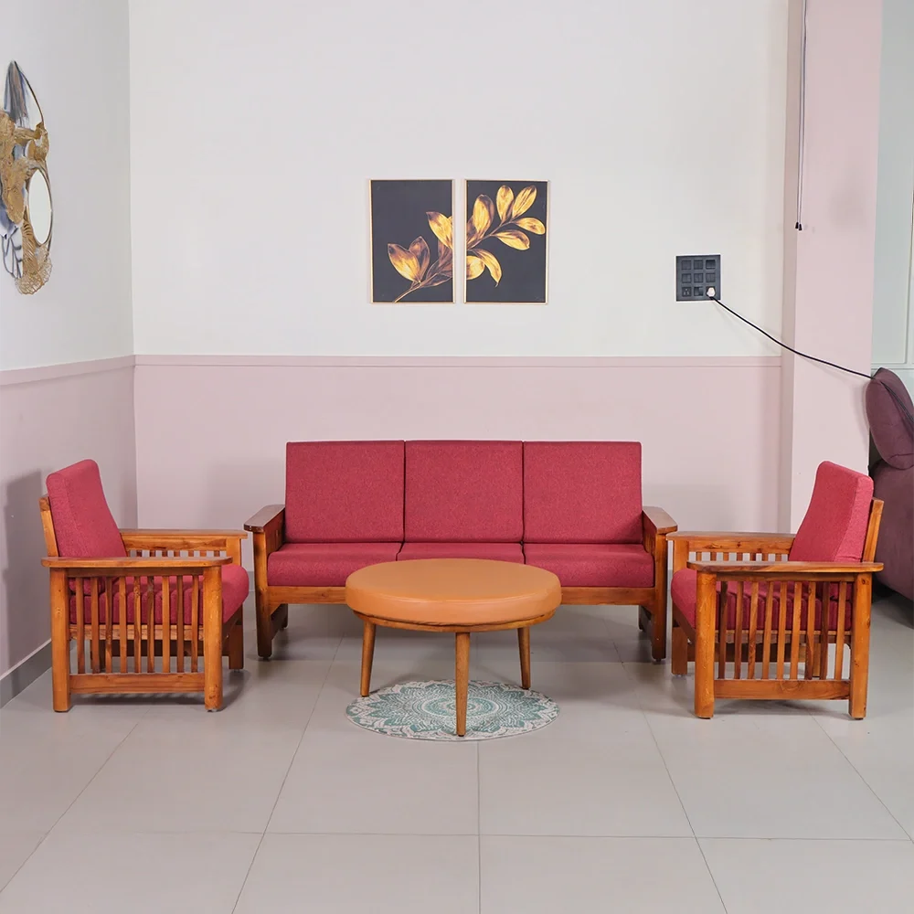 Redefine comfort and elegance in your living space with the Darwin Inverness Sofa Set. Crafted from robust solid wood and upholstered in a rich, maroon fabric, this 3+1+1 seater set brings warmth, character, and functionality into your home.