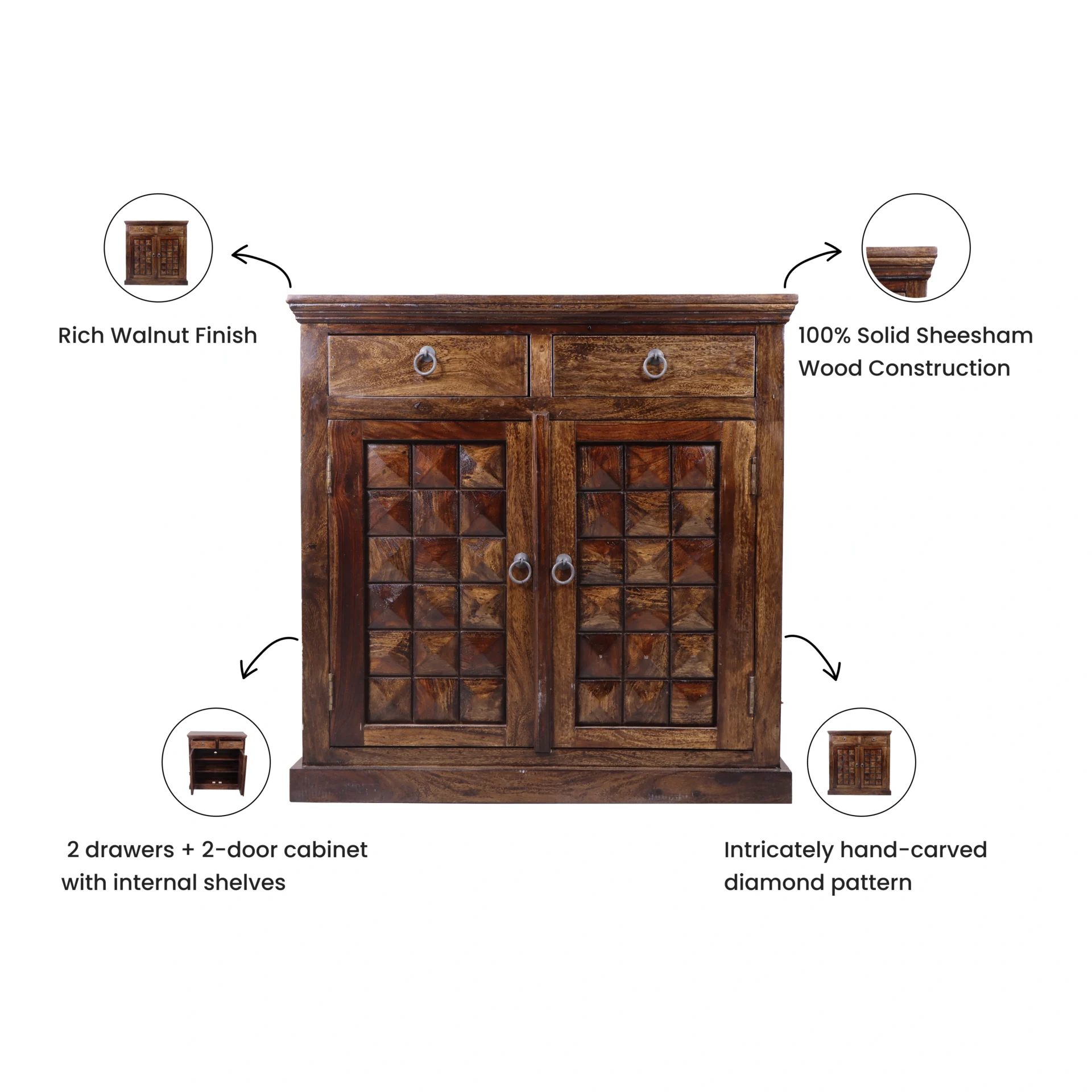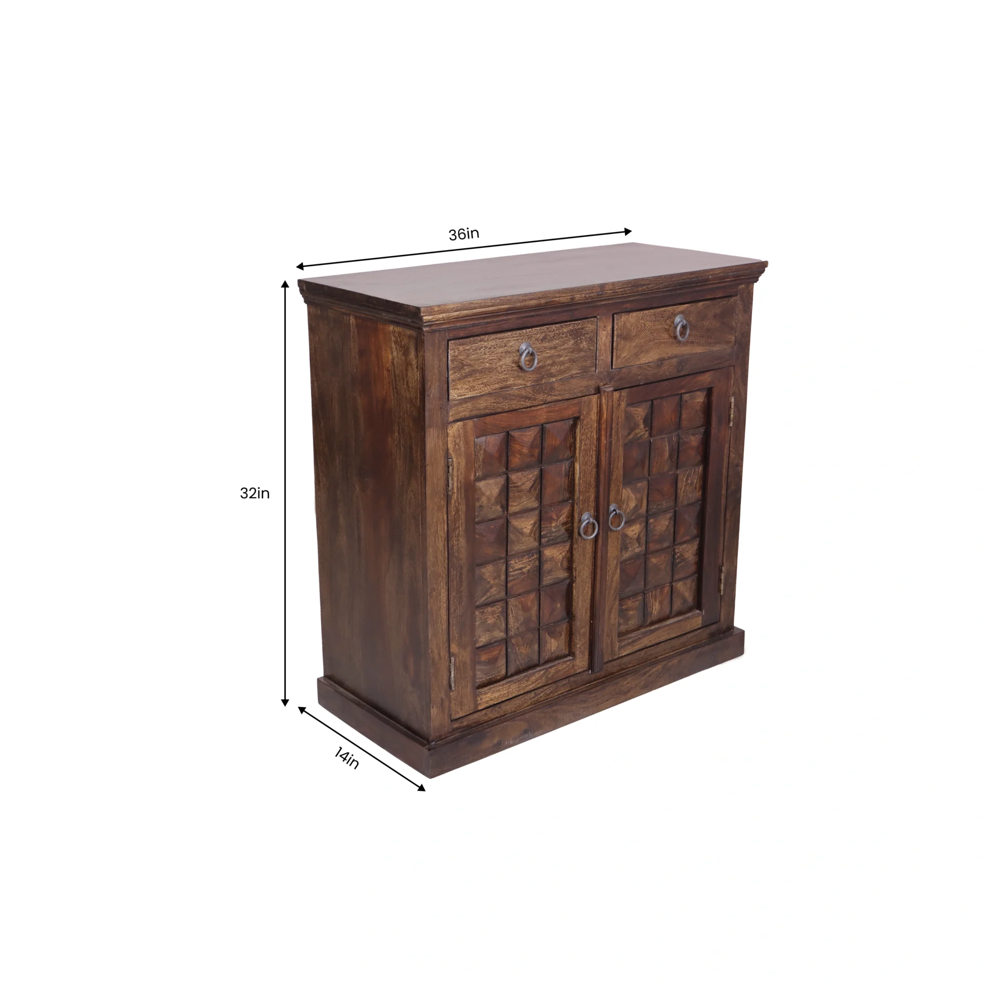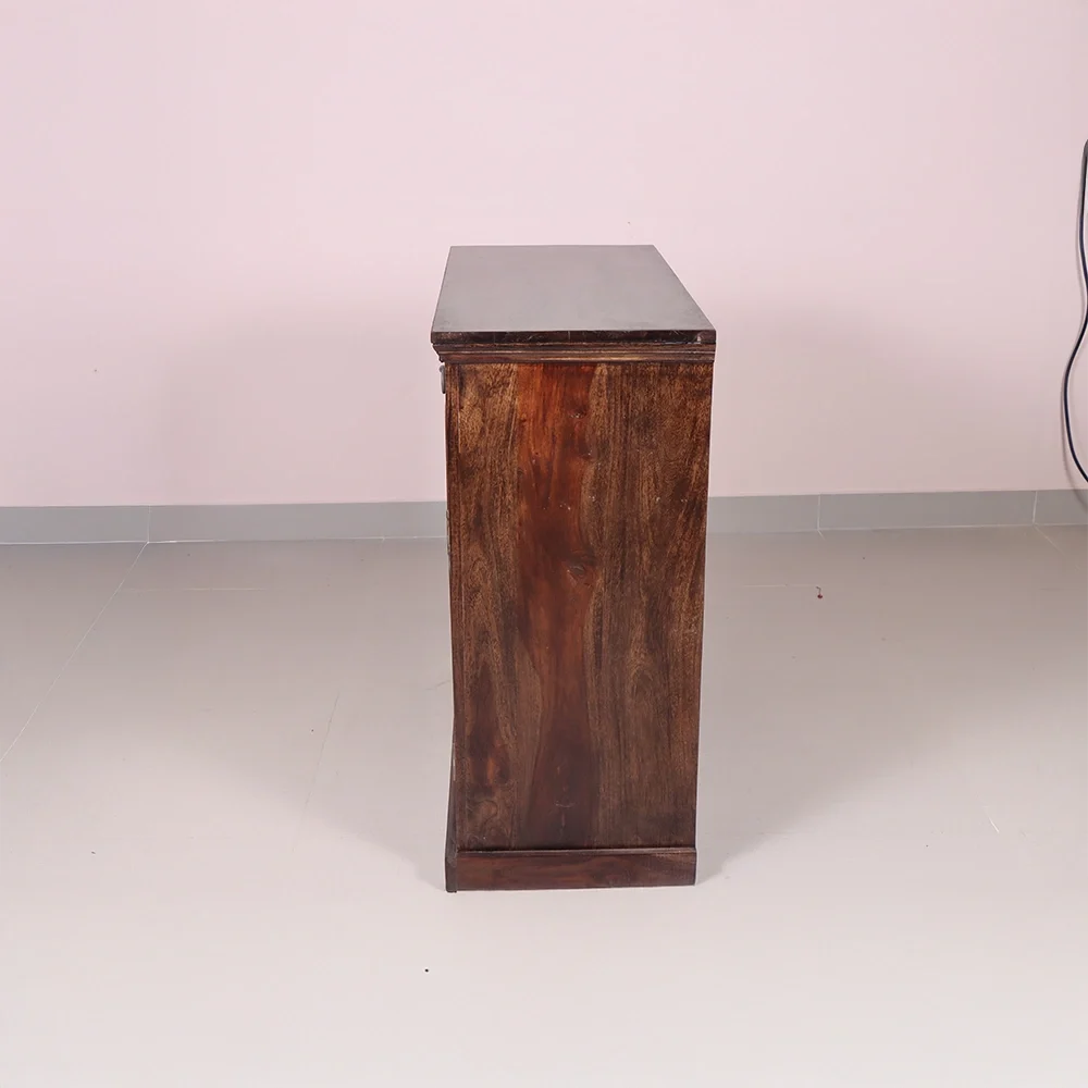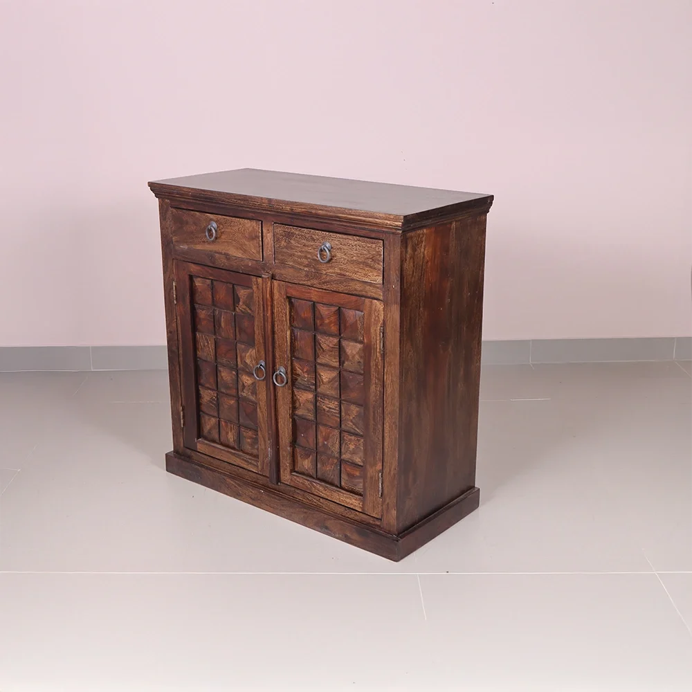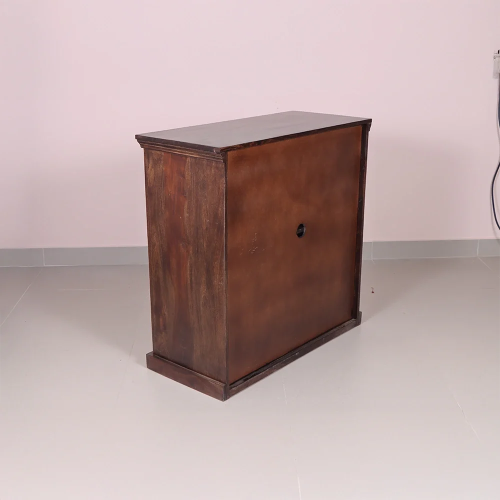 The Diamond Shoe Rack is a blend of intricate craftsmanship and practical design. Handcrafted from solid Sheesham wood, it features a rich walnut finish that highlights the natural grain and unique texture of the wood. The standout element is its beautifully carved diamond-patterned front panels, giving the rack a bold and elegant look.