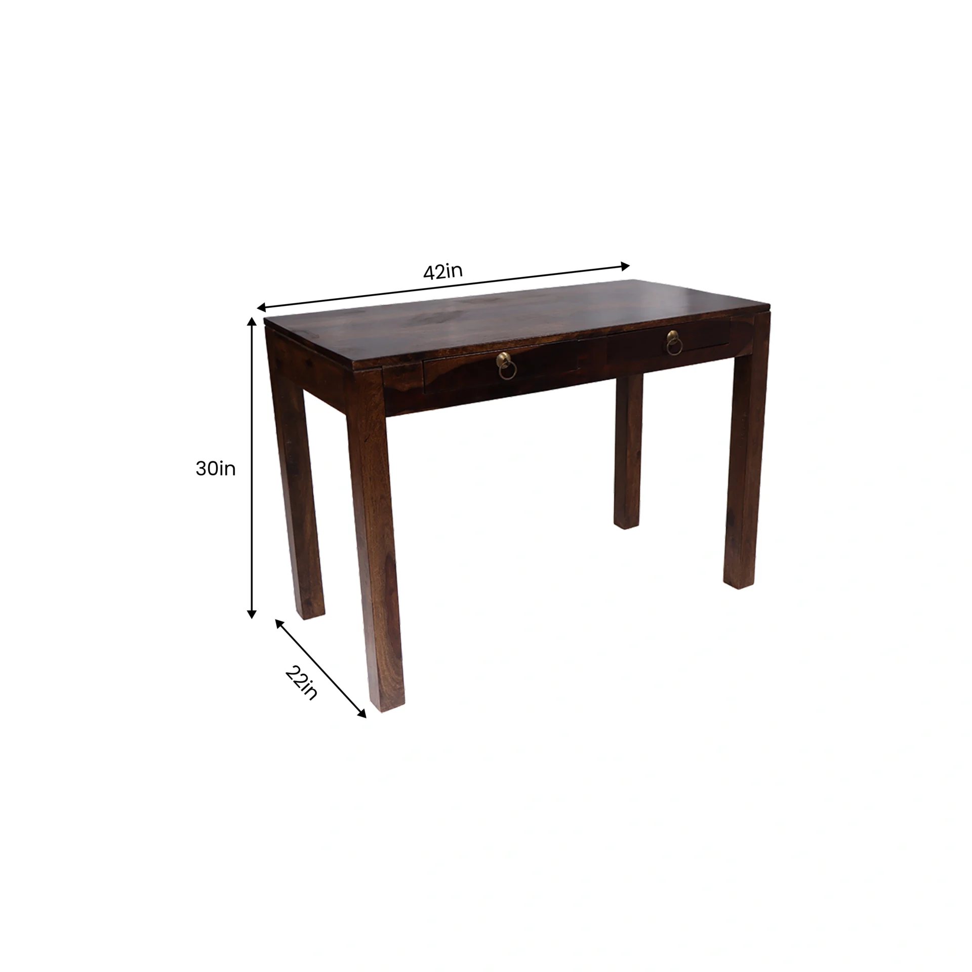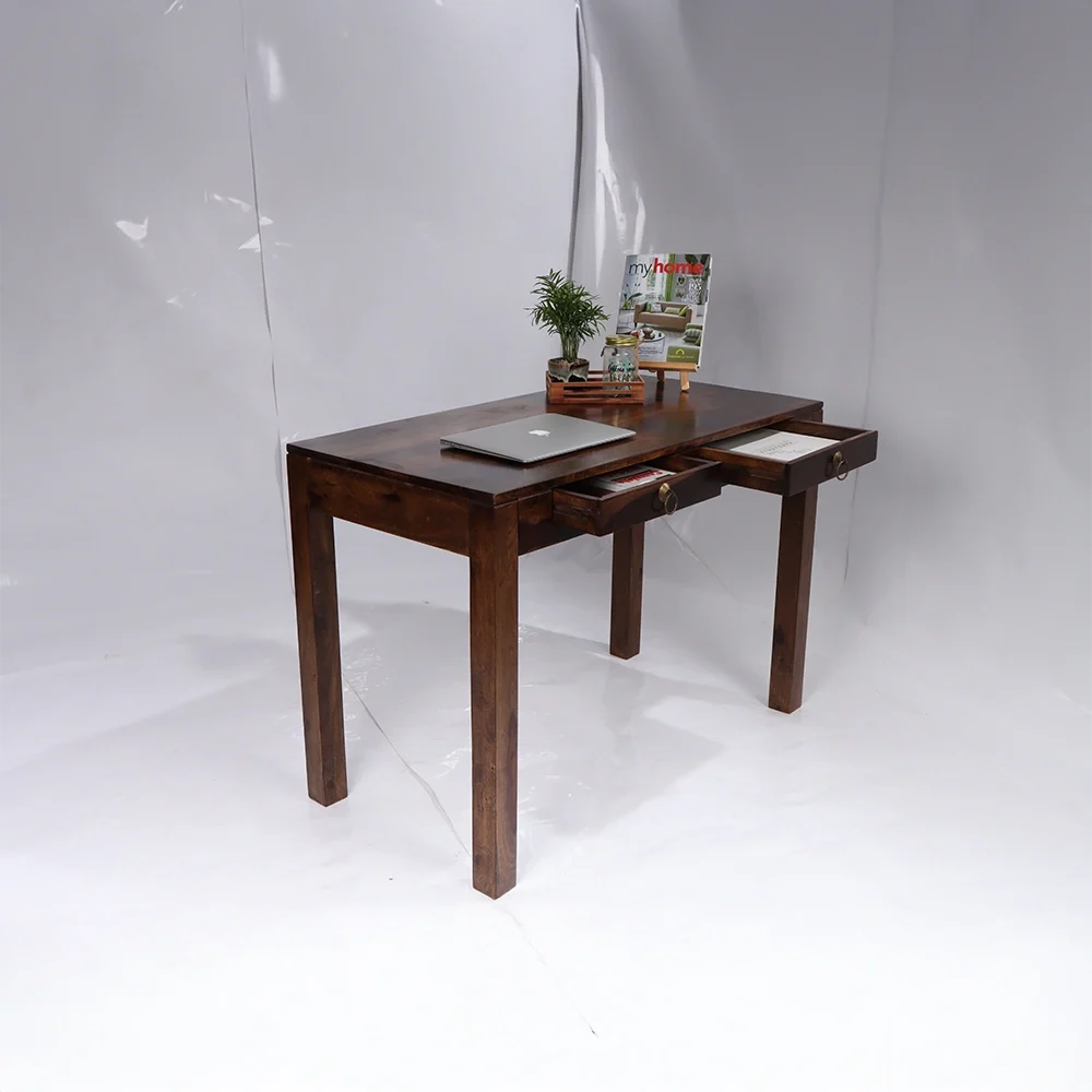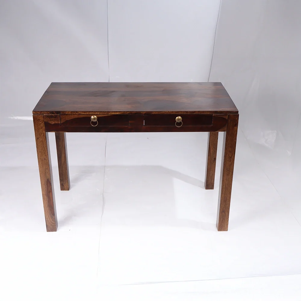 Bring elegance and functionality to your workspace with the Divine Study Table, crafted from premium solid Sheesham wood for unmatched durability and timeless appeal. Its minimalist design, paired with a smooth polished finish, makes it a perfect fit for modern and traditional interiors alike. The table features two spacious drawers with antique brass ring pulls, offering convenient storage for stationery, documents, and other essentials while keeping your workspace clutter-free.