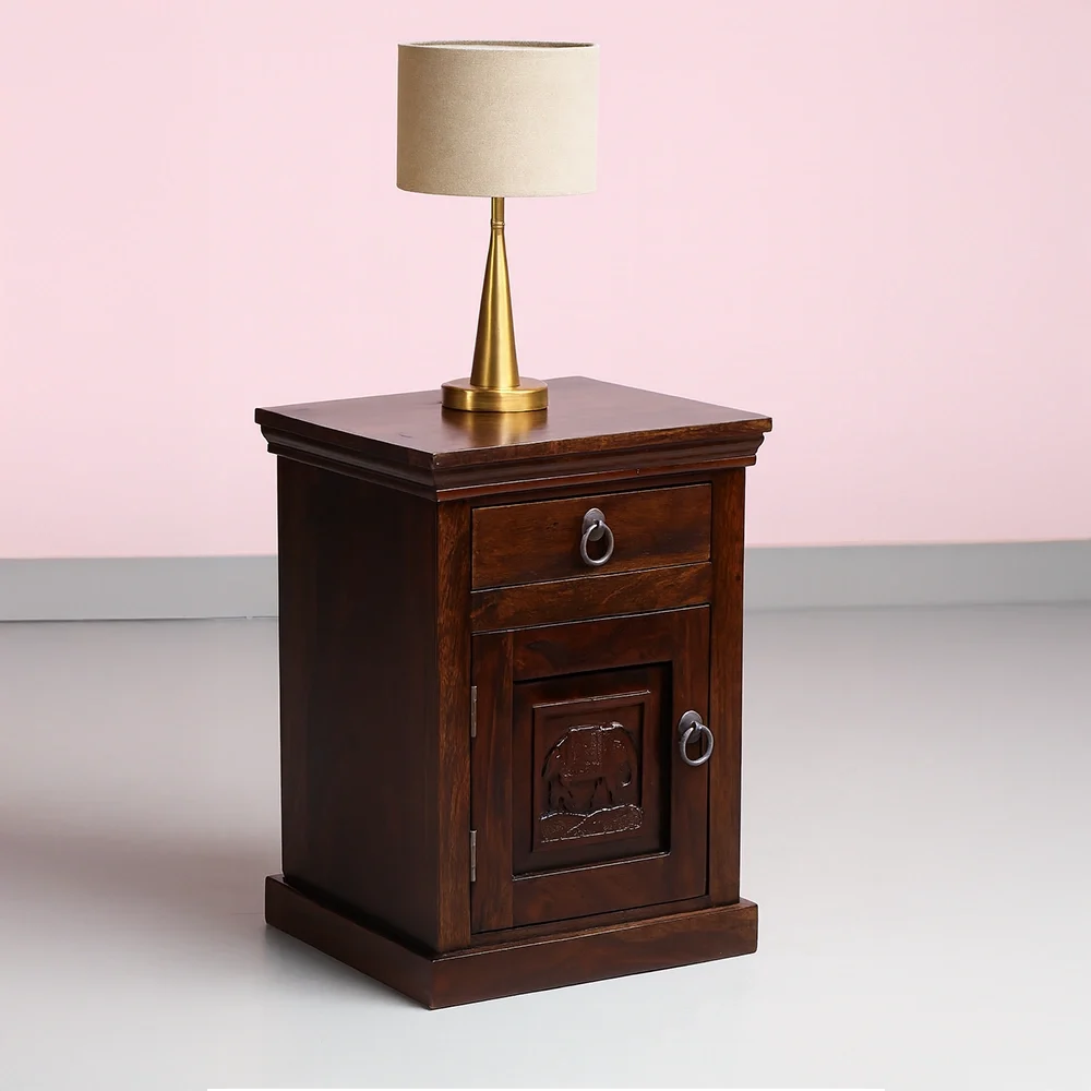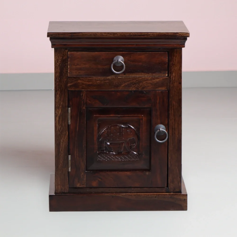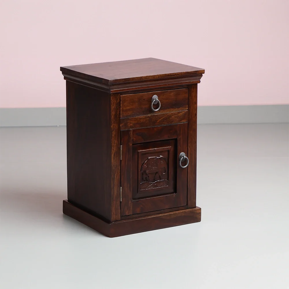 Bring timeless charm and artistic heritage into your bedroom with the Elephant Carved Wooden Bedside Table. Handcrafted from solid Sheesham wood, this compact yet sturdy nightstand is a perfect blend of utility and traditional aesthetics.
