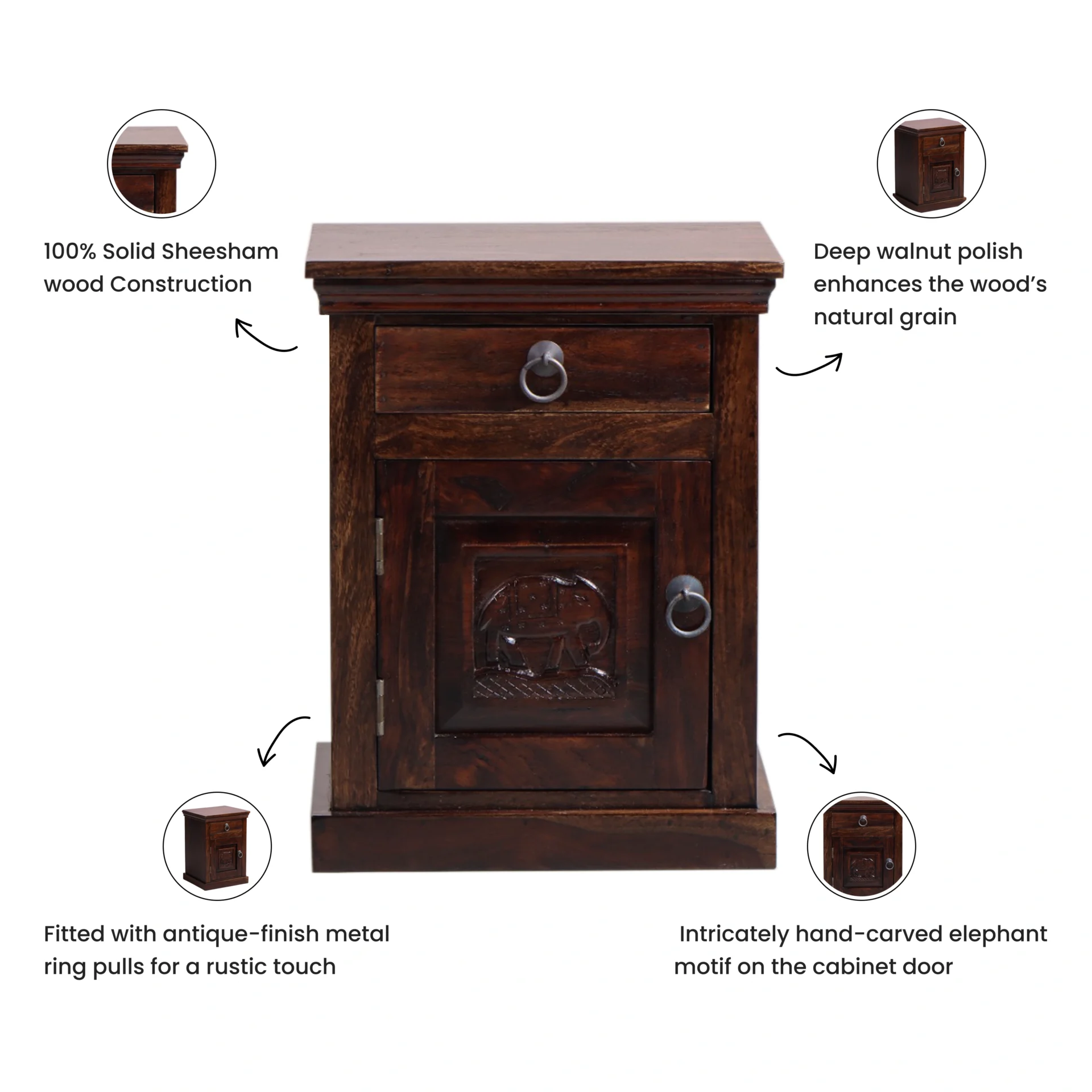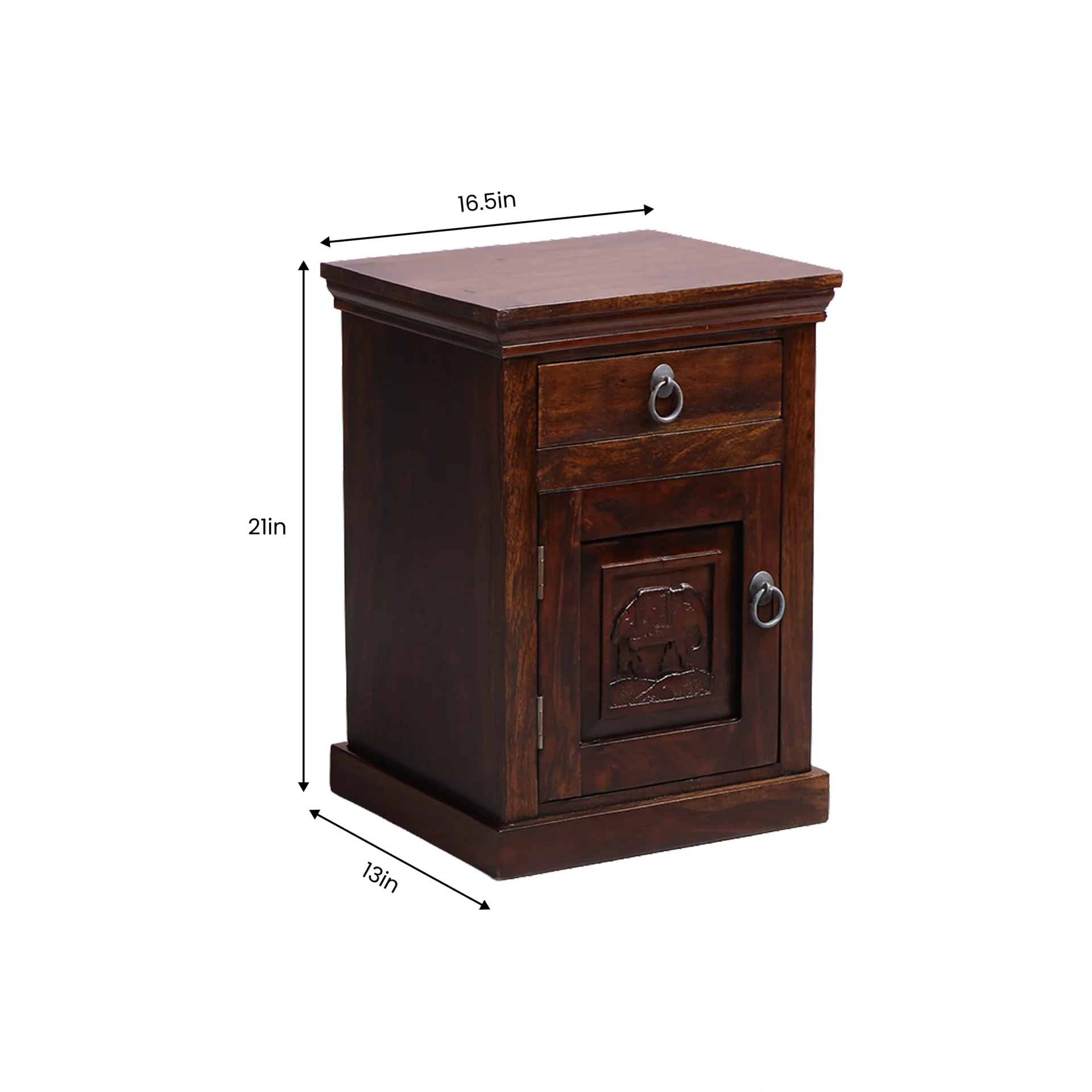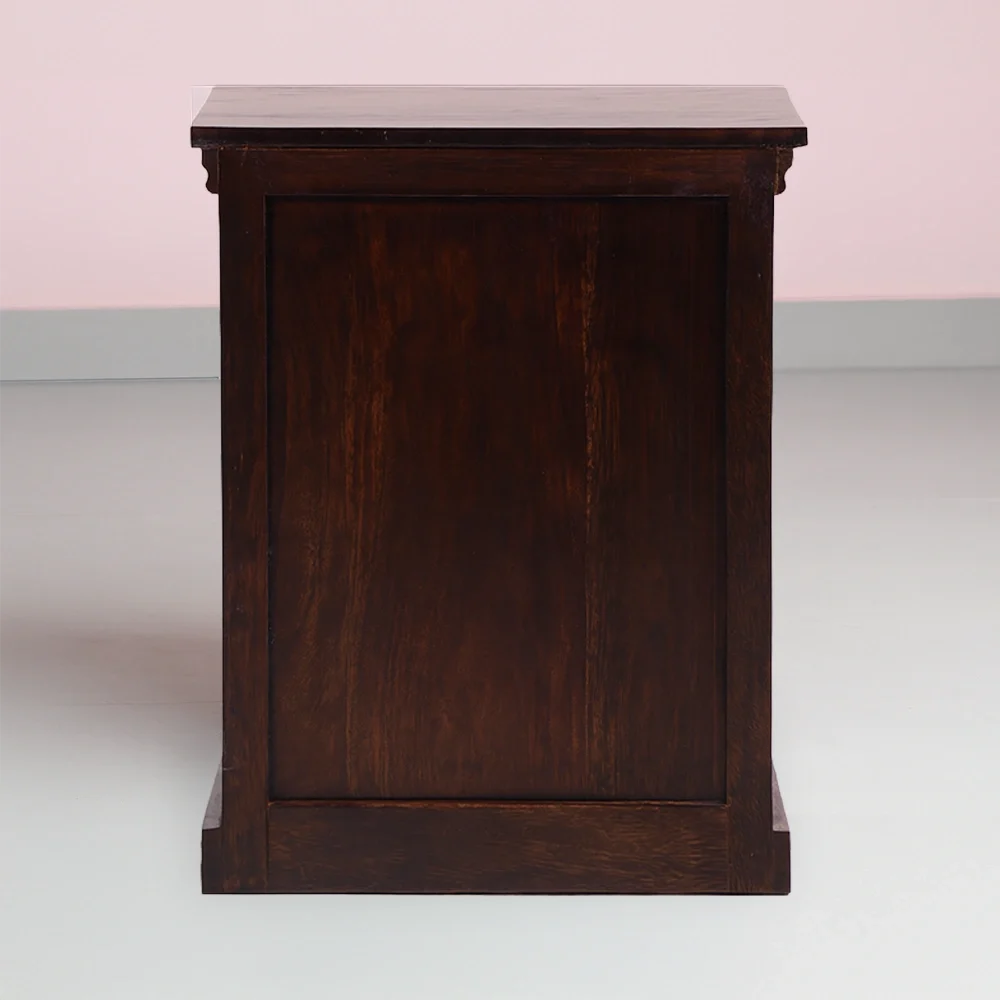 Bring timeless charm and artistic heritage into your bedroom with the Elephant Carved Wooden Bedside Table. Handcrafted from solid Sheesham wood, this compact yet sturdy nightstand is a perfect blend of utility and traditional aesthetics.