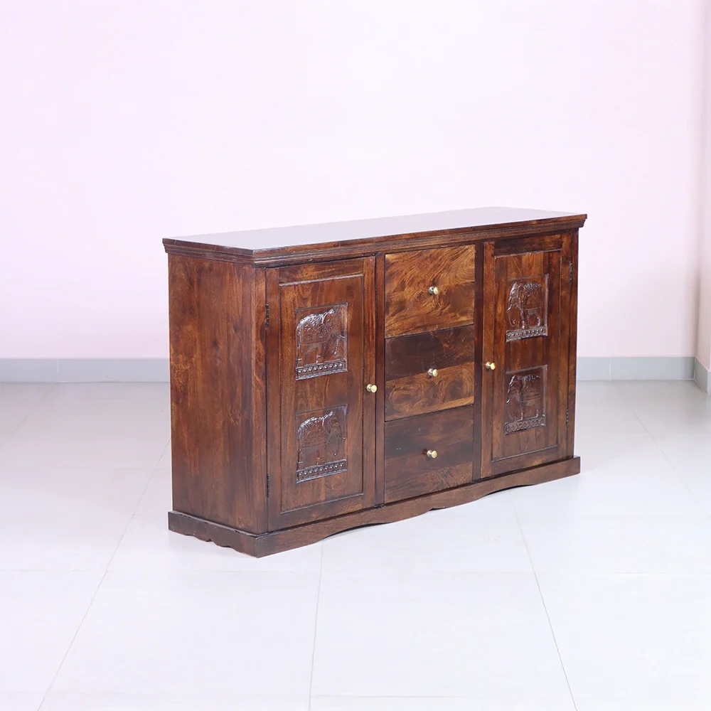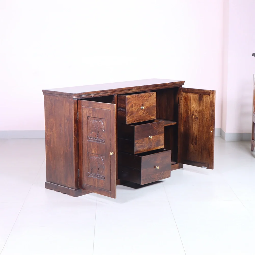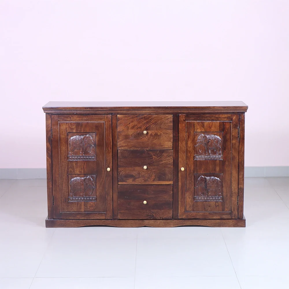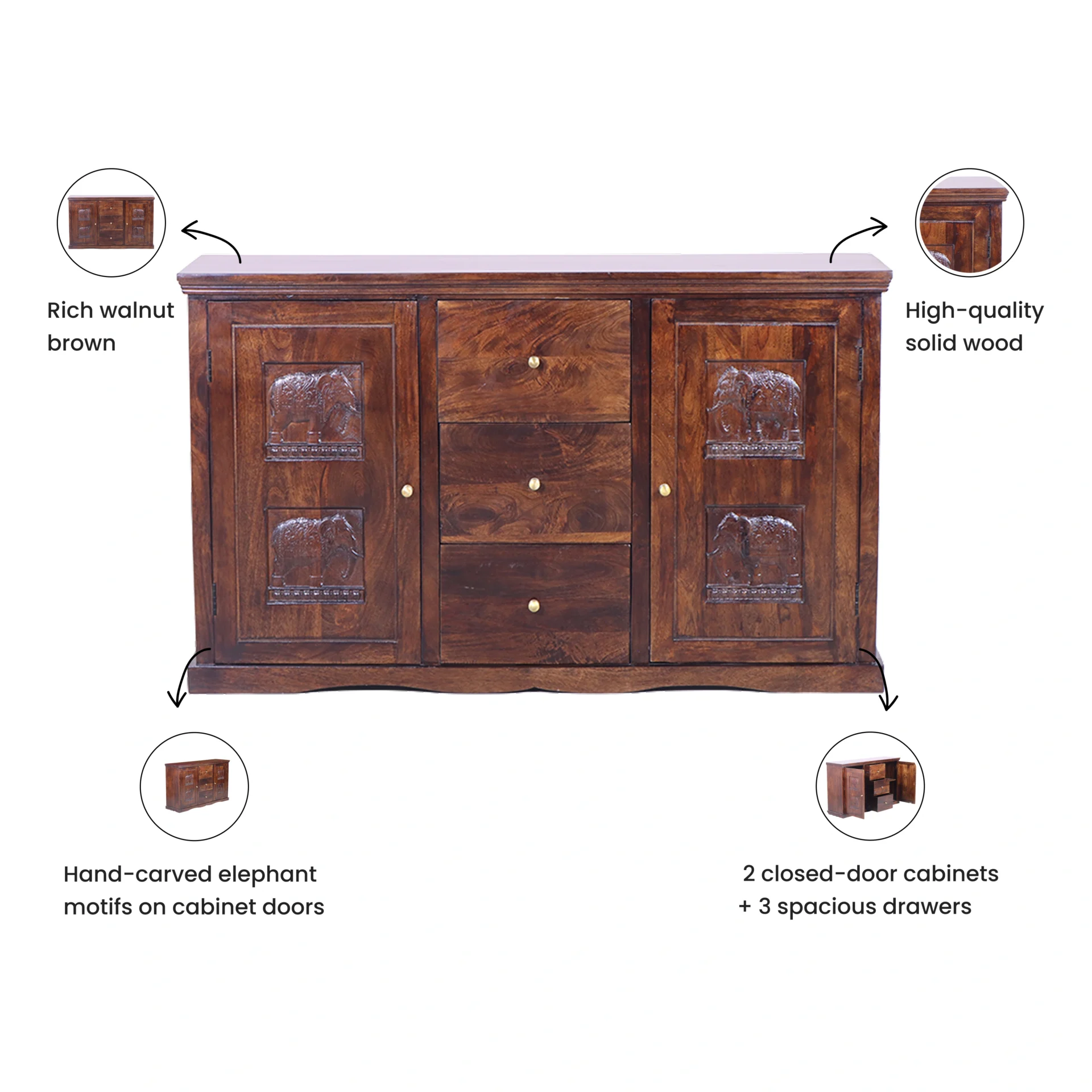 Finished in a rich walnut brown tone, the piece features two side cabinets adorned with elephant engravings and three central drawers for versatile storage. Whether used in your living room, dining area, or hallway, this sideboard offers both functionality and ethnic charm.