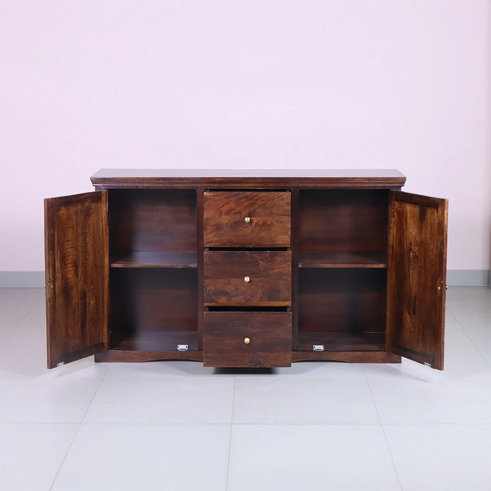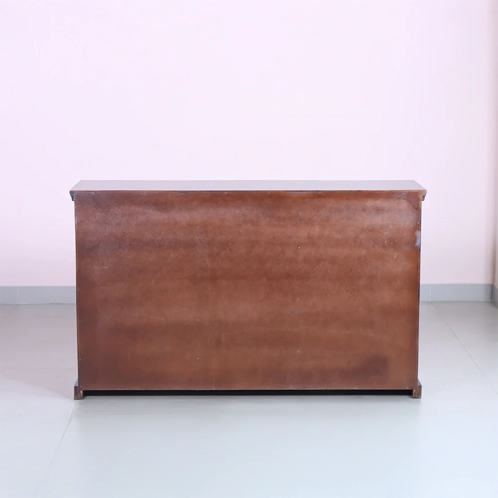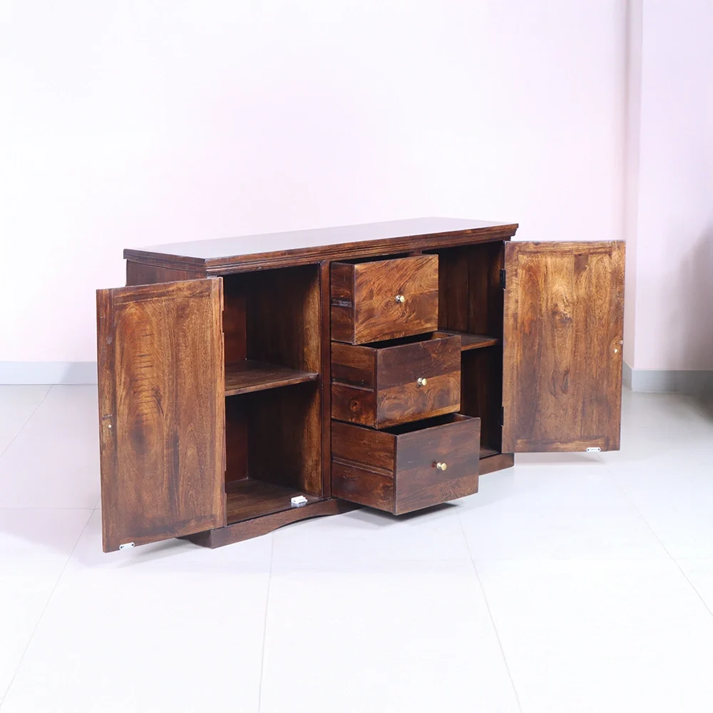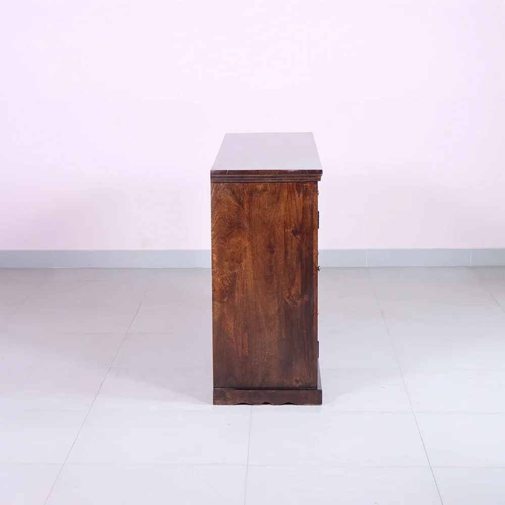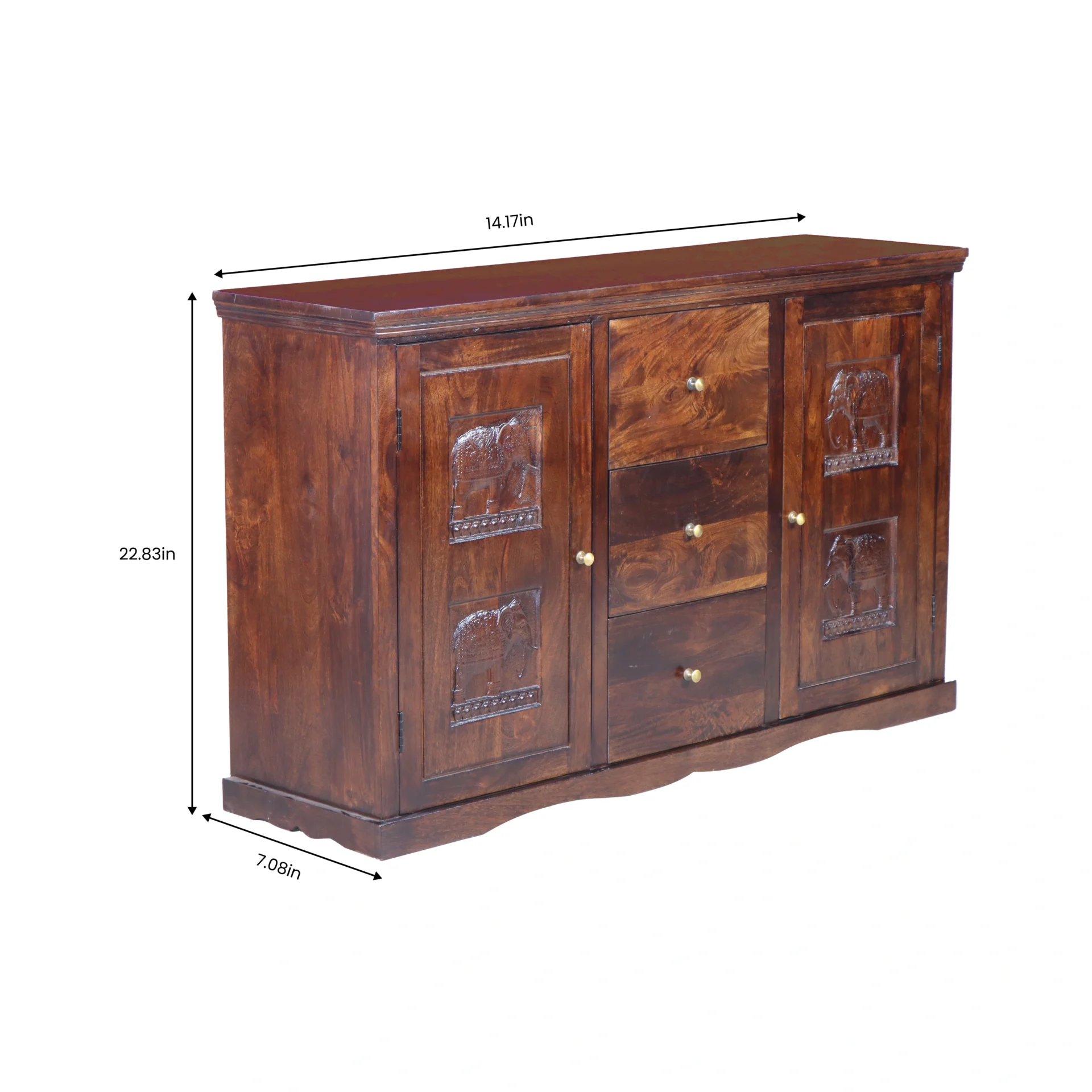 Finished in a rich walnut brown tone, the piece features two side cabinets adorned with elephant engravings and three central drawers for versatile storage. Whether used in your living room, dining area, or hallway, this sideboard offers both functionality and ethnic charm.