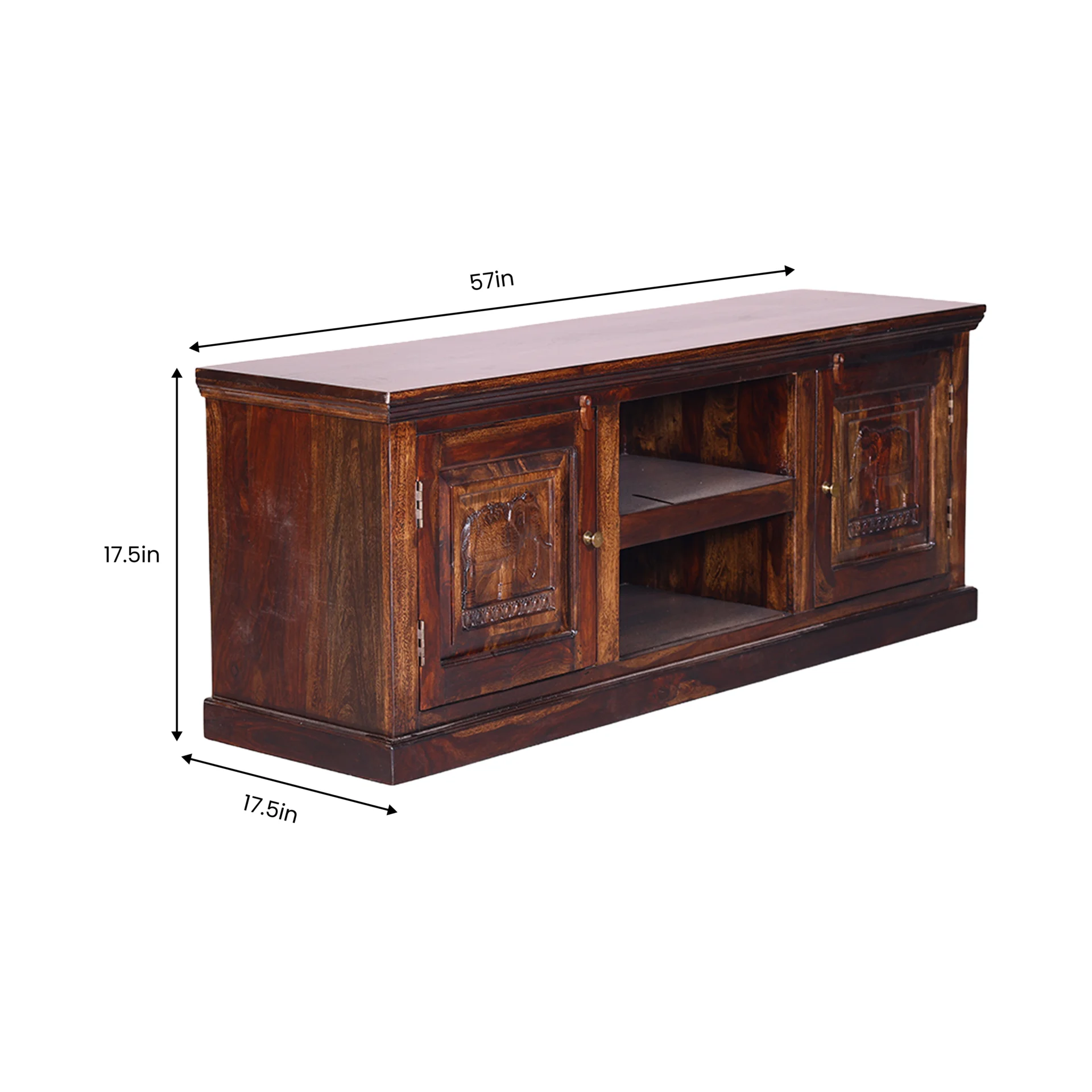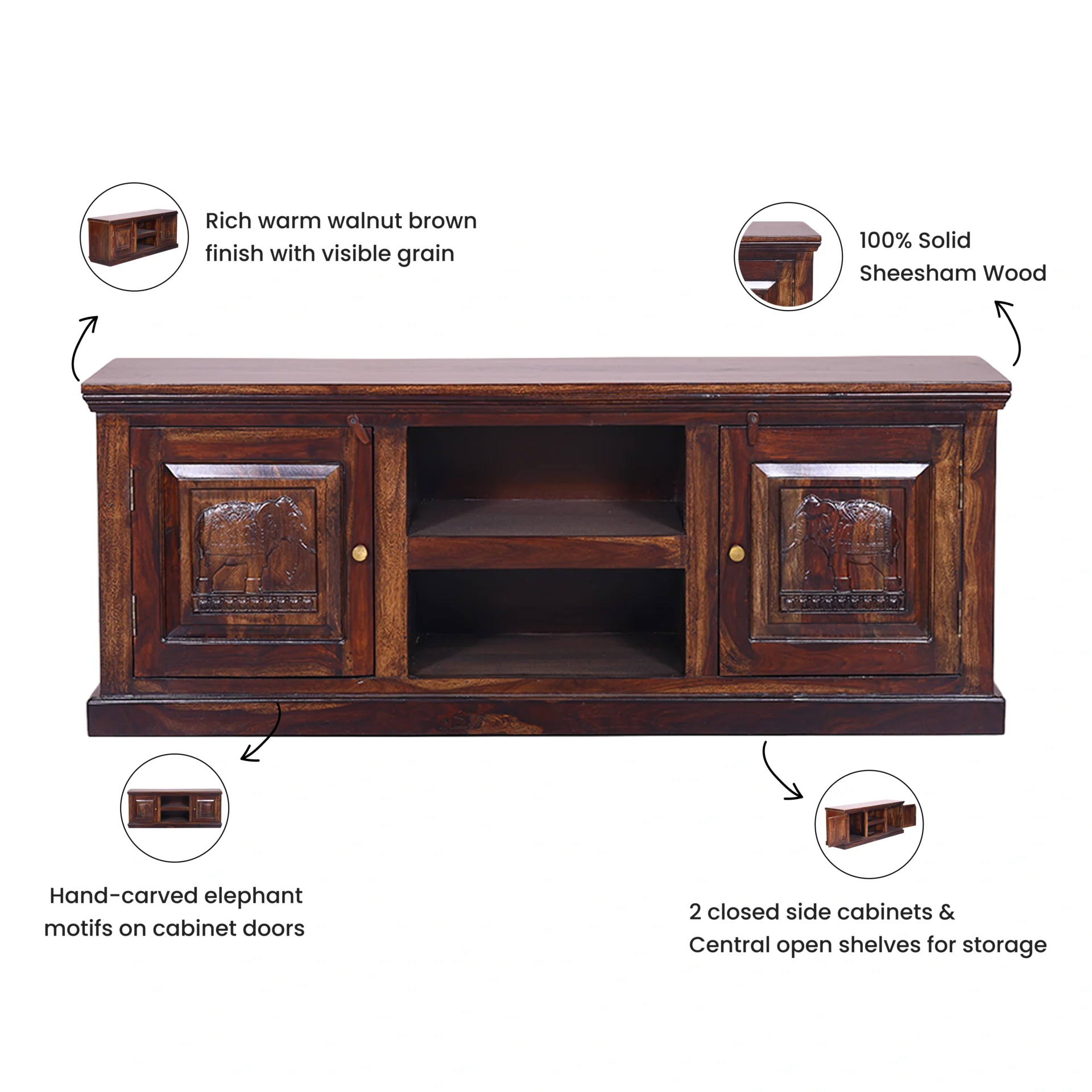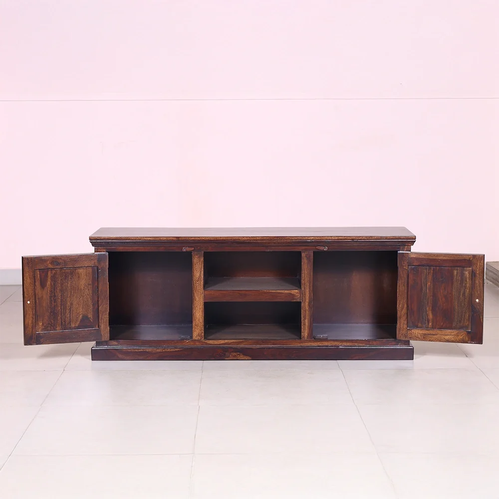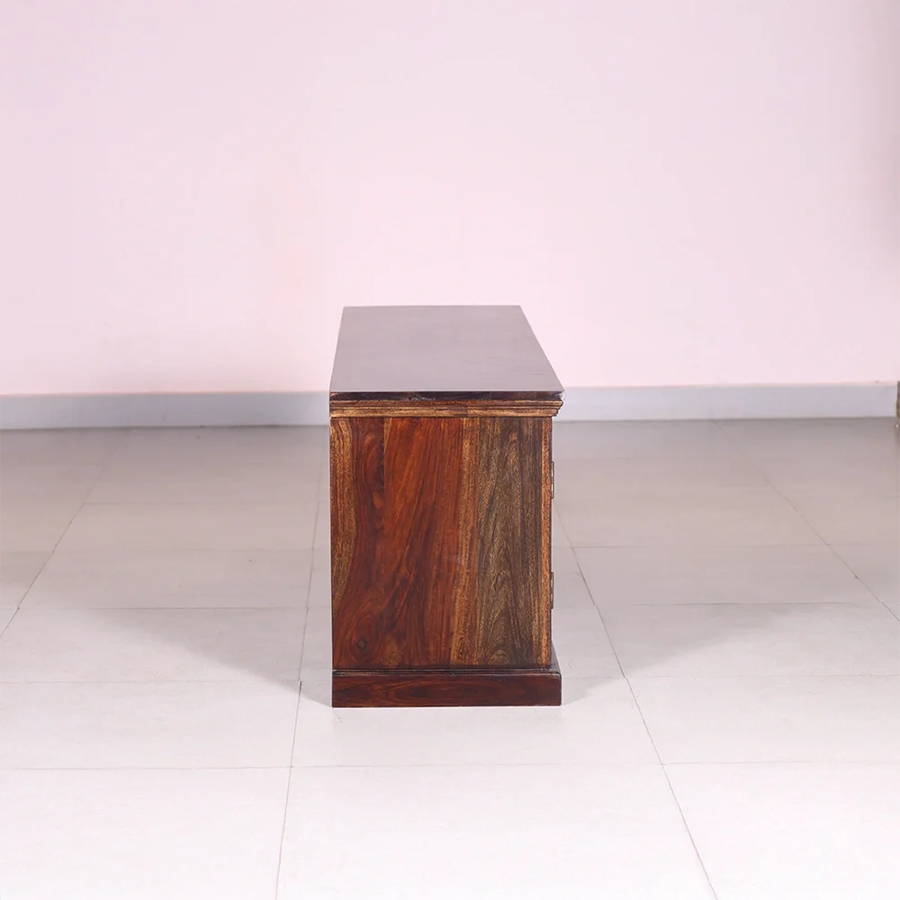 This handcrafted wooden TV unit brings together traditional artistry and everyday functionality. Made from sheesham wood, the unit features beautifully carved elephant motifs on the cabinet doors, adding a touch of heritage charm and cultural elegance to your living or bedroom space. The rich natural wood grain and warm brown finish enhance its timeless appeal.
