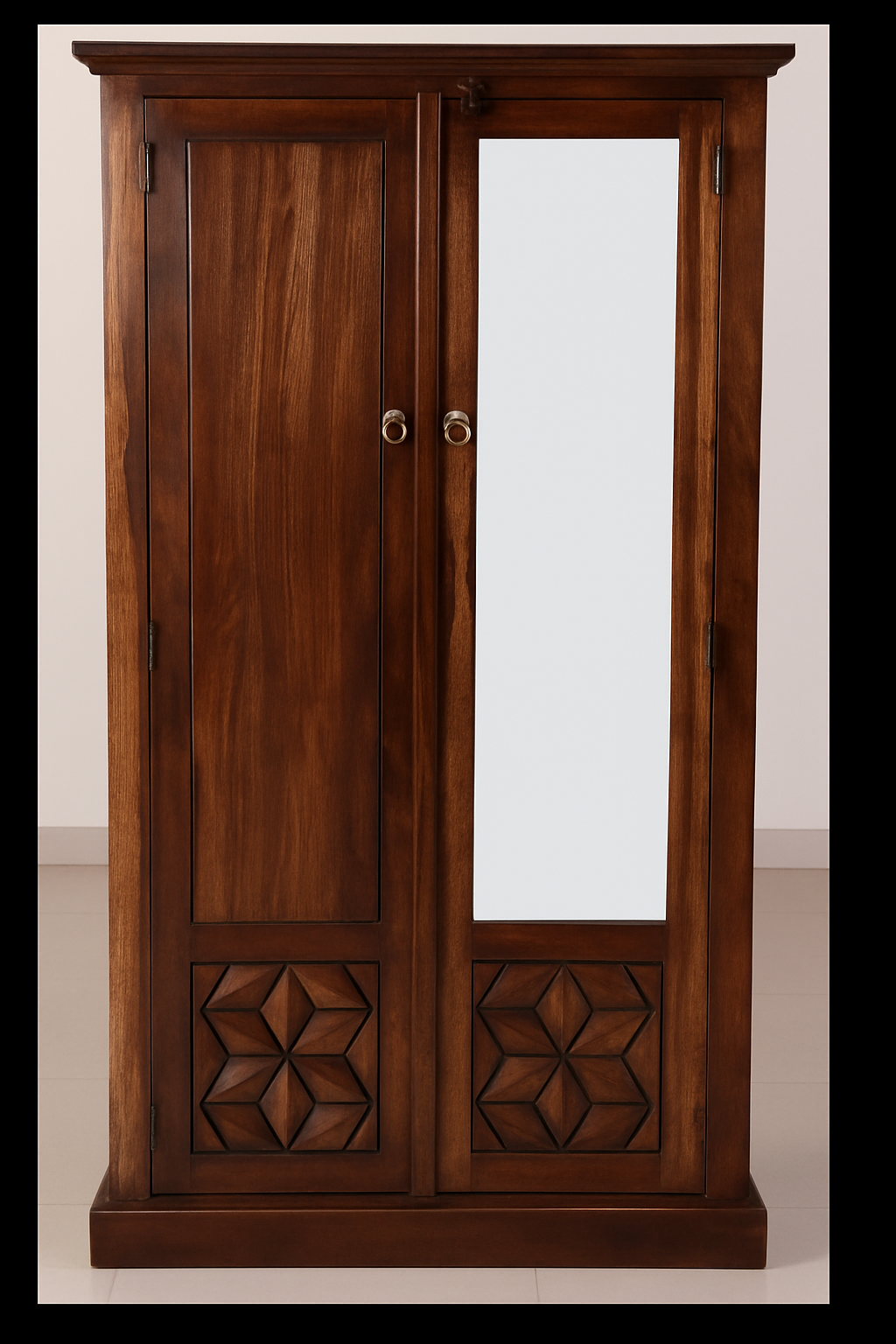 The highlight of this almirah is the bold 3D hexagonal carving on the lower panels, adding a modern twist to its timeless design.