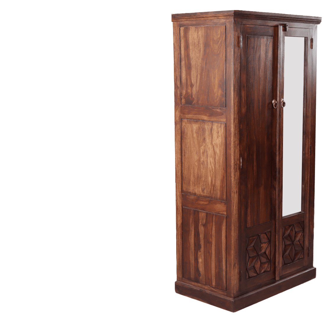 Stylish, functional, and built to last  the Hexa 3D 2 Door Almirah is a perfect addition to your bedroom. Crafted from solid Sheesham wood, this 6-foot-tall almirah features a sleek dual-door design, one with a full-length mirror and the other with a rich wooden finish.
