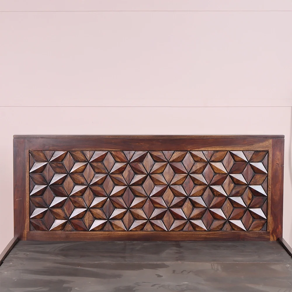 Celebrate the harmony of geometric artistry and functional design with the Hexa Cot, a King size bed crafted from premium Sheesham wood. Distinguished by its mesmerizing starburst pattern—formed by carefully arranged wooden blocks on the headboard and footboard—this bed is a true statement of craftsmanship and style, elevated with the practicality of hydraulic storage.