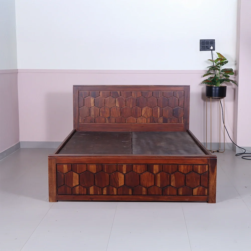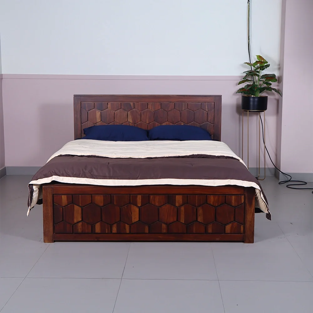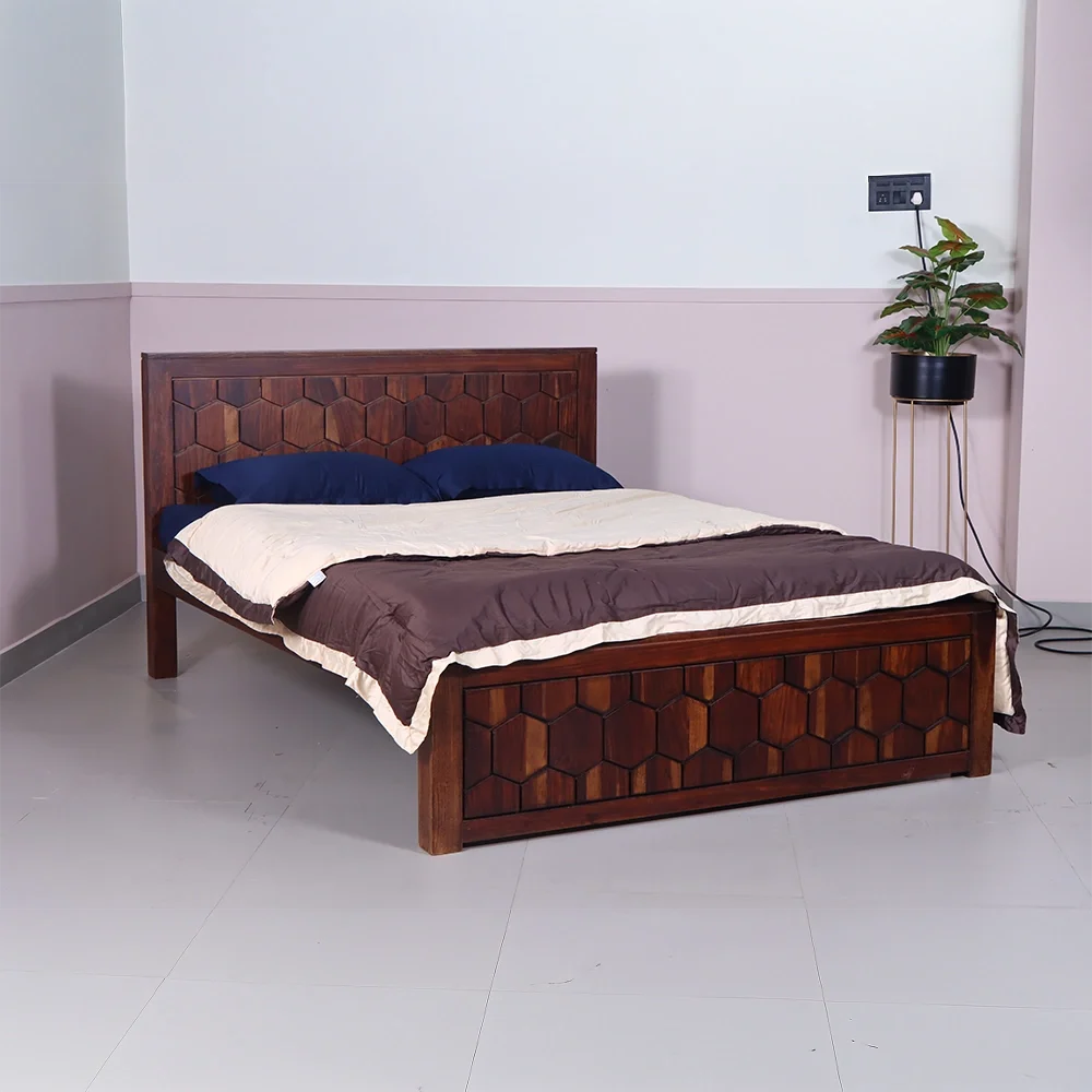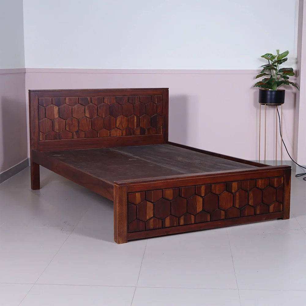 Experience the unique charm of our Hexagon Bed, a stunning Queen size masterpiece crafted from premium Sheesham wood. Featuring intricate hexagon patterns on the headboard and footboard, this bed adds a touch of sophistication and elegance to any bedroom.