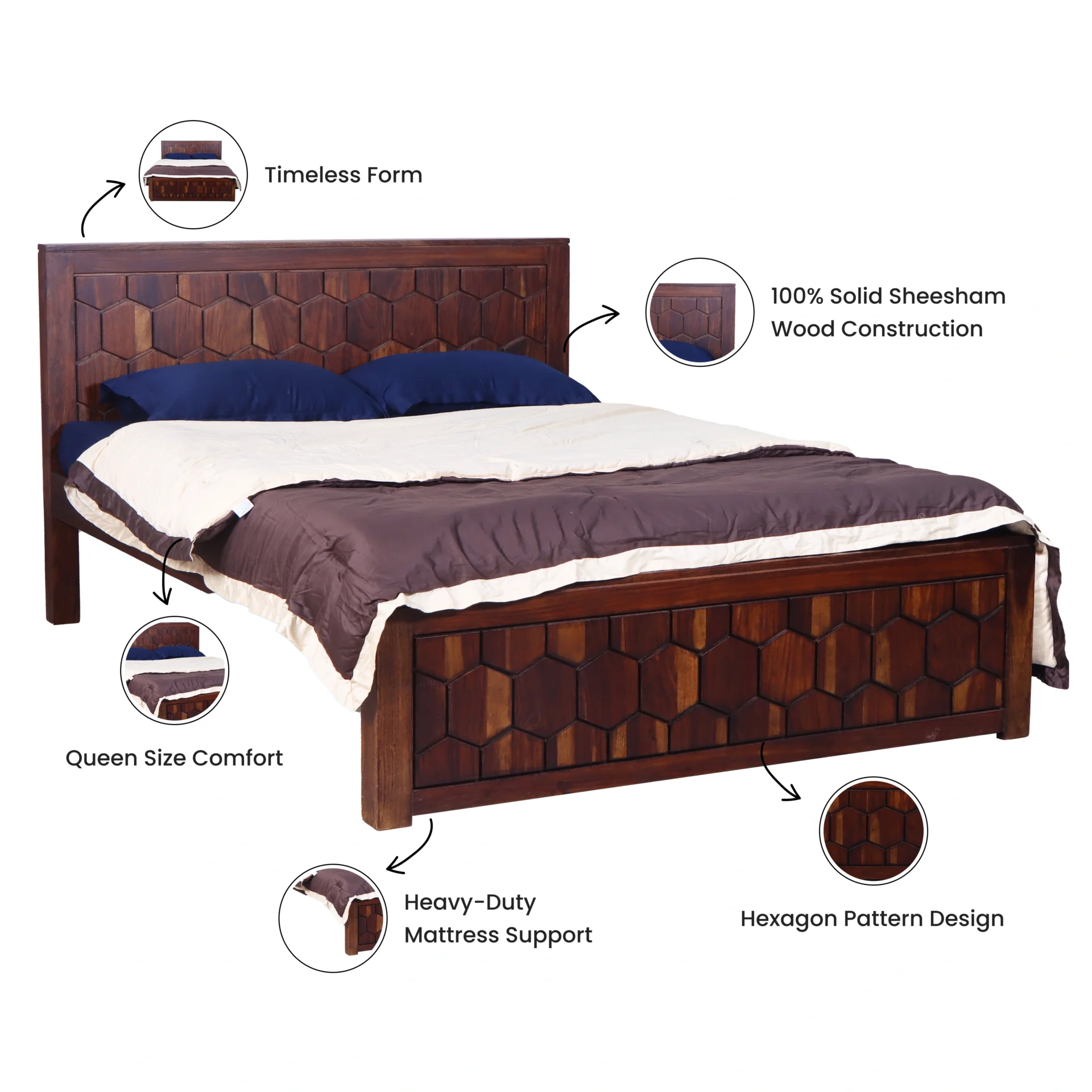 Hexagon Bed: Regal Queen Size in Sheesham Wood