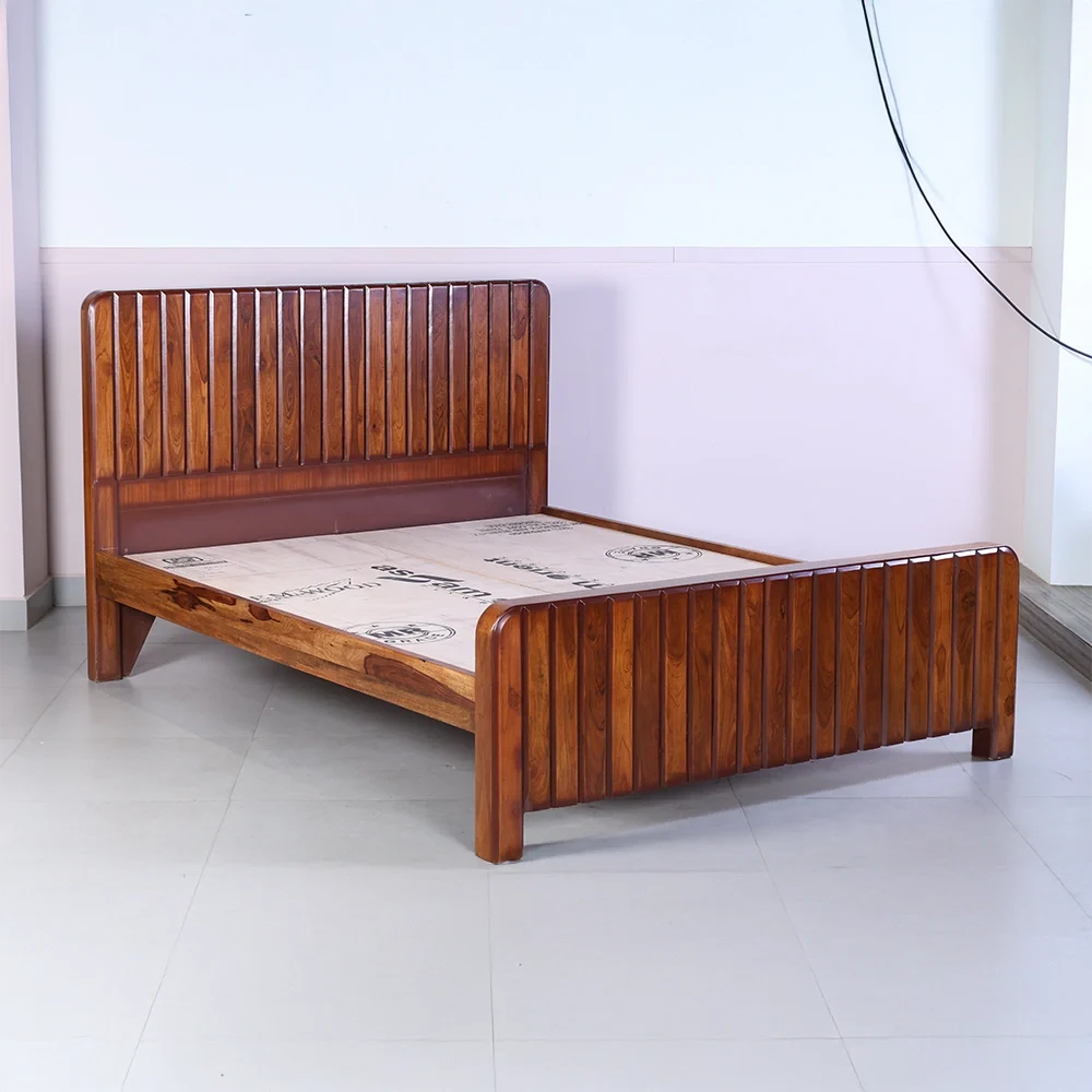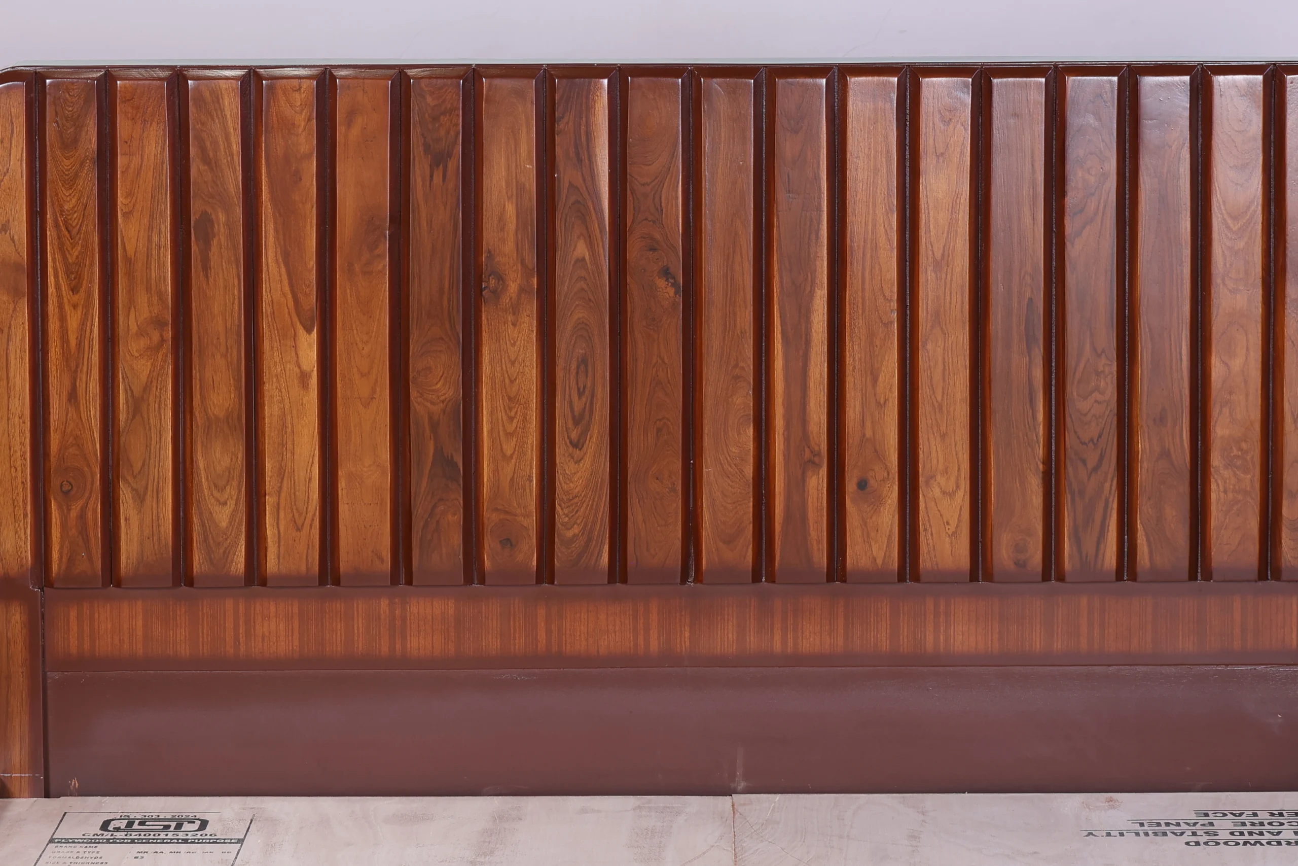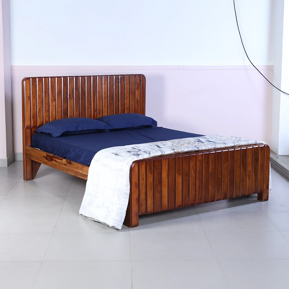 Crafted from 100% premium Teak wood, the Kitkat Line Bed showcases the timeless beauty of natural wood grains with a contemporary slatted design. The tall headboard and matching footboard with rounded corners bring symmetry and warmth to your bedroom, making it both inviting and elegant. Designed for durability and comfort, this bed is perfect for modern homes that value style and substance.