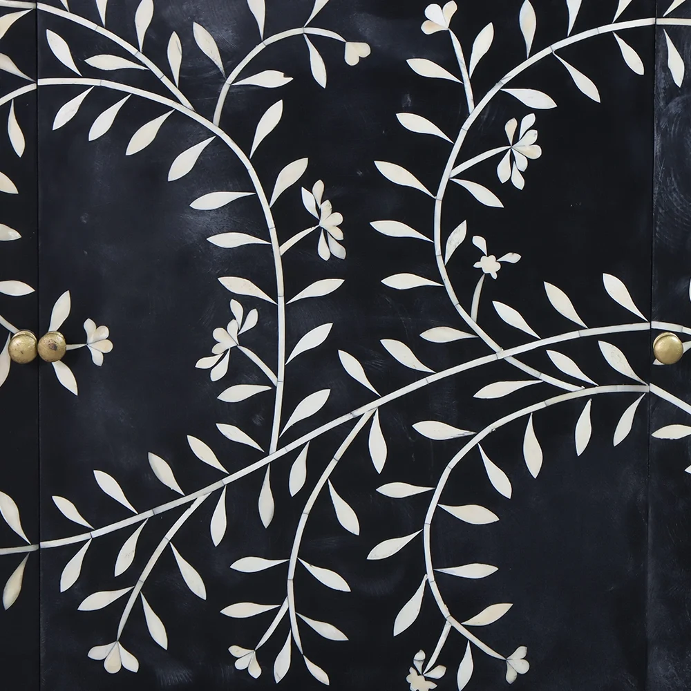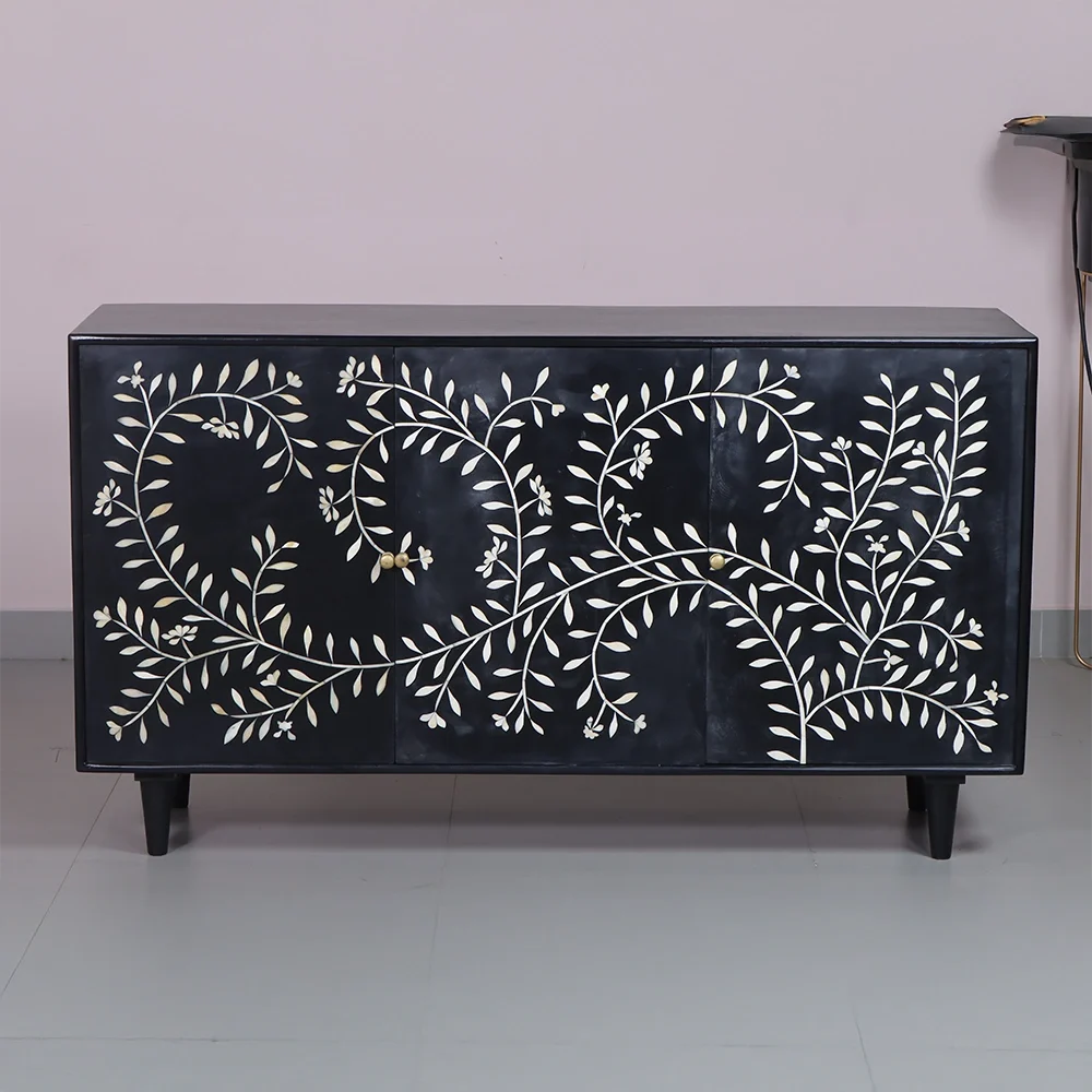 Elevate your living space with the exquisite Lily Flower Mother of Pearl Sideboard, a true masterpiece of craftsmanship and artistry. Featuring a stunning hand-inlaid mother of pearl floral pattern in a graceful lily vine motif, this sideboard adds an elegant charm to any room. The striking contrast of delicate white inlays against the rich black base creates a sophisticated visual appeal that complements both modern and traditional interiors.