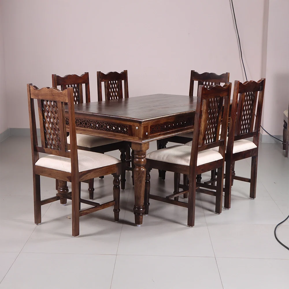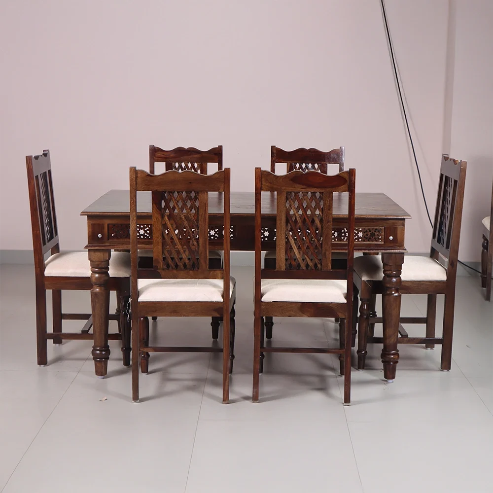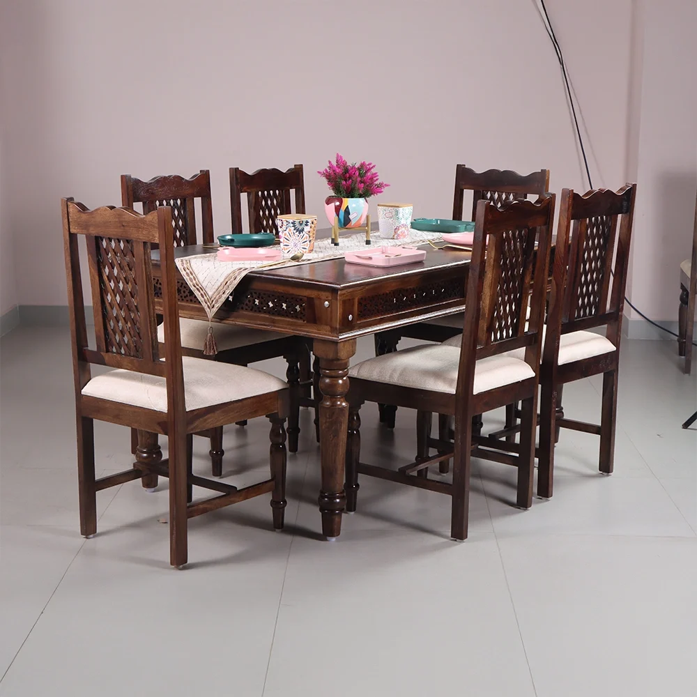 Create a warm and refined dining ambiance with the Meadow Table with Elegance Chairs 6-Seater Dining Set, masterfully crafted from solid Sheesham wood. This stunning set blends traditional carving, upholstered comfort, and timeless design—perfect for those who appreciate both functional durability and sophisticated aesthetics in their home.