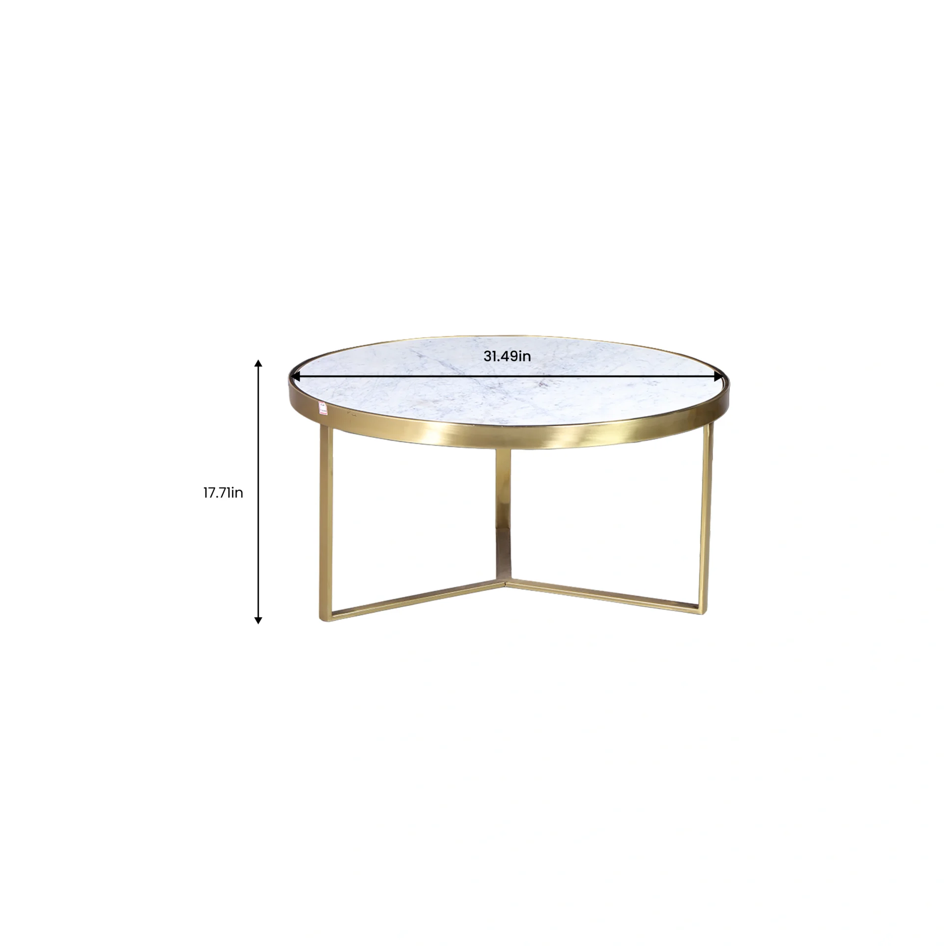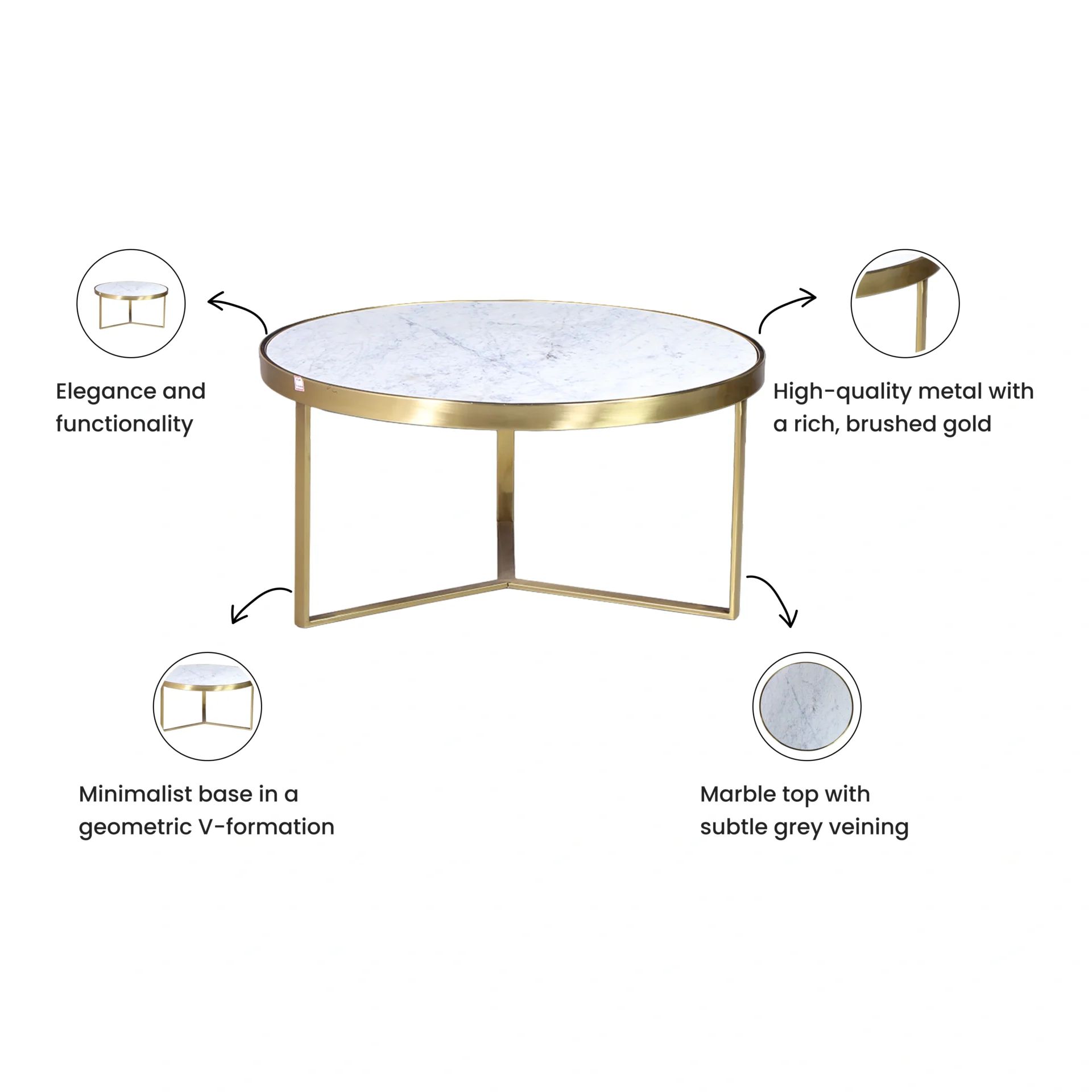 Elevate your living space with this striking round coffee table that seamlessly combines elegance and functionality. Featuring a luxurious white marble top with subtle grey veining, this table exudes timeless sophistication. The frame is constructed from high-quality metal with a rich, brushed gold finish that adds a touch of glamour to any room.
