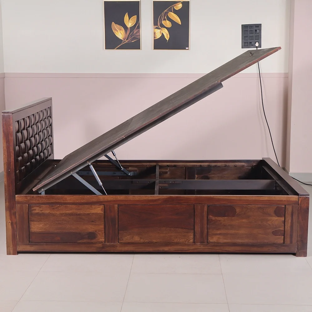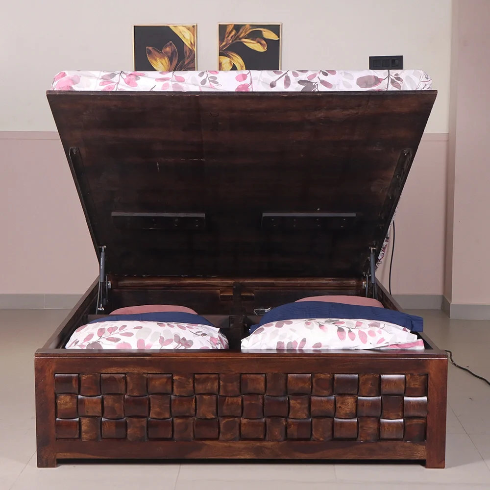 | Mattress Support | The mattress is supported by an 18 mm thick plywood base, strengthened with ample wooden framing to ensure durability, stability, and reliable load-bearing performance—especially suited for hydraulic storage functionality. |