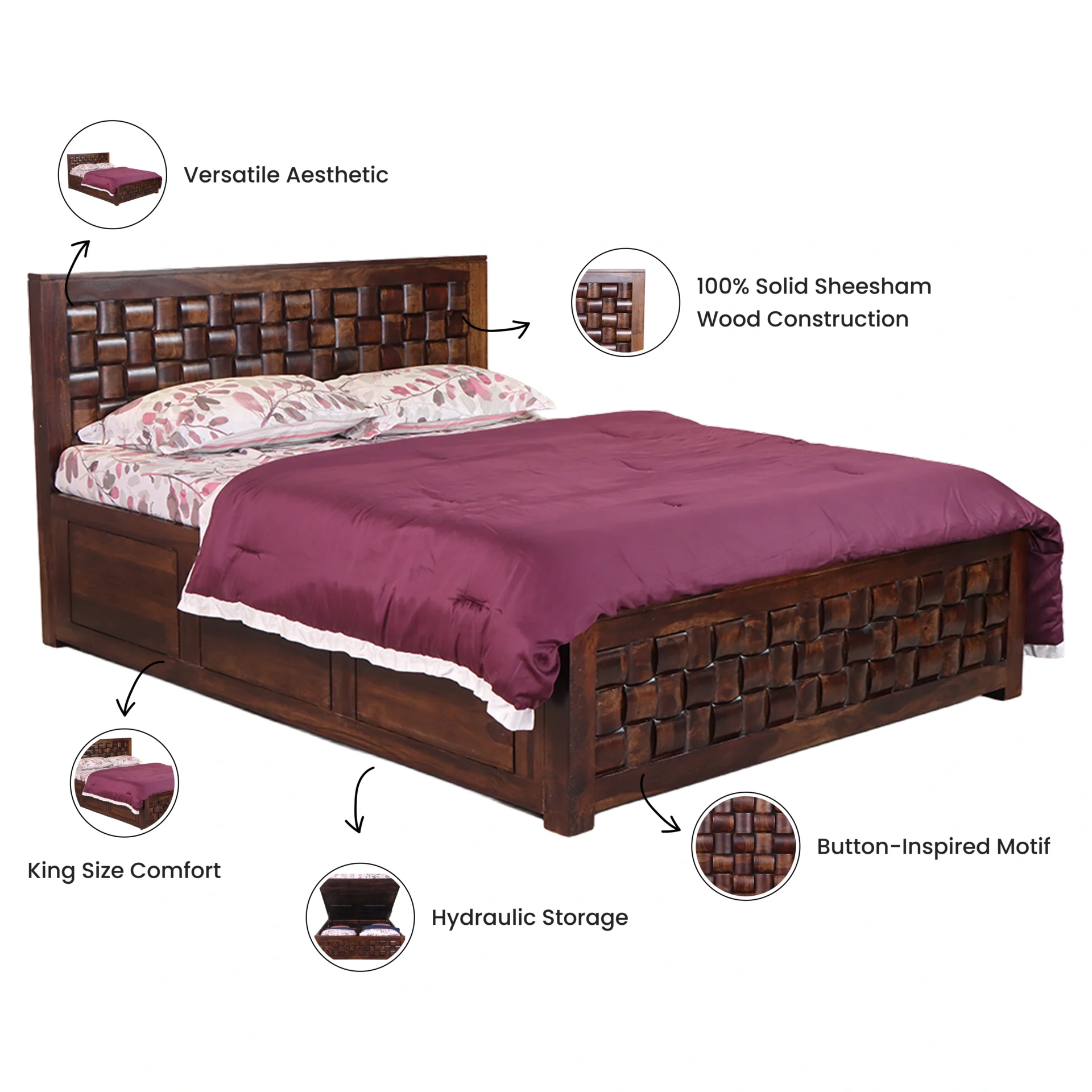 Nivaar Cot: Elegant King Size Sheesham Wood Bed with Button-Tufted Look and Hydraulic Storage