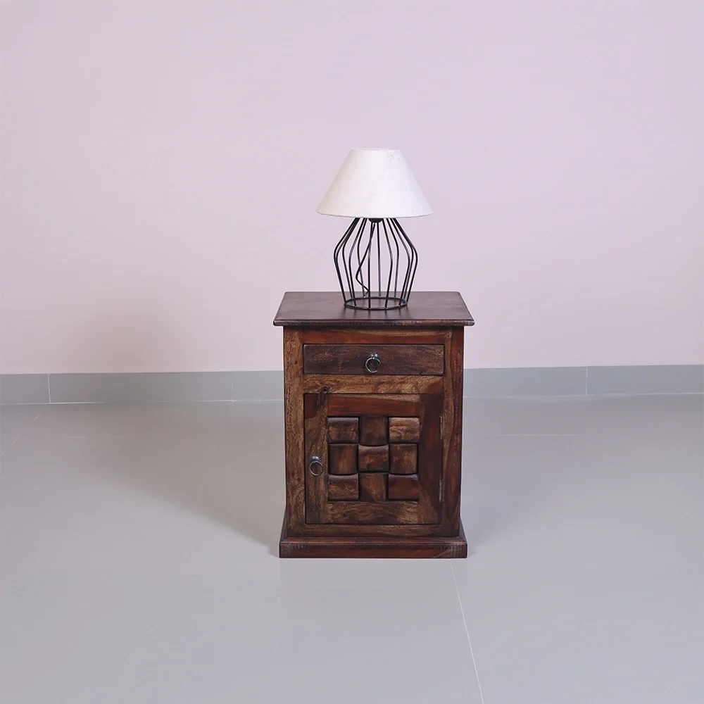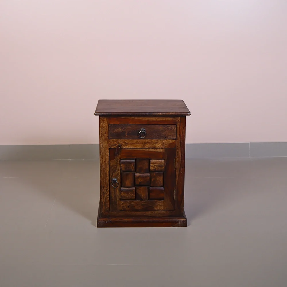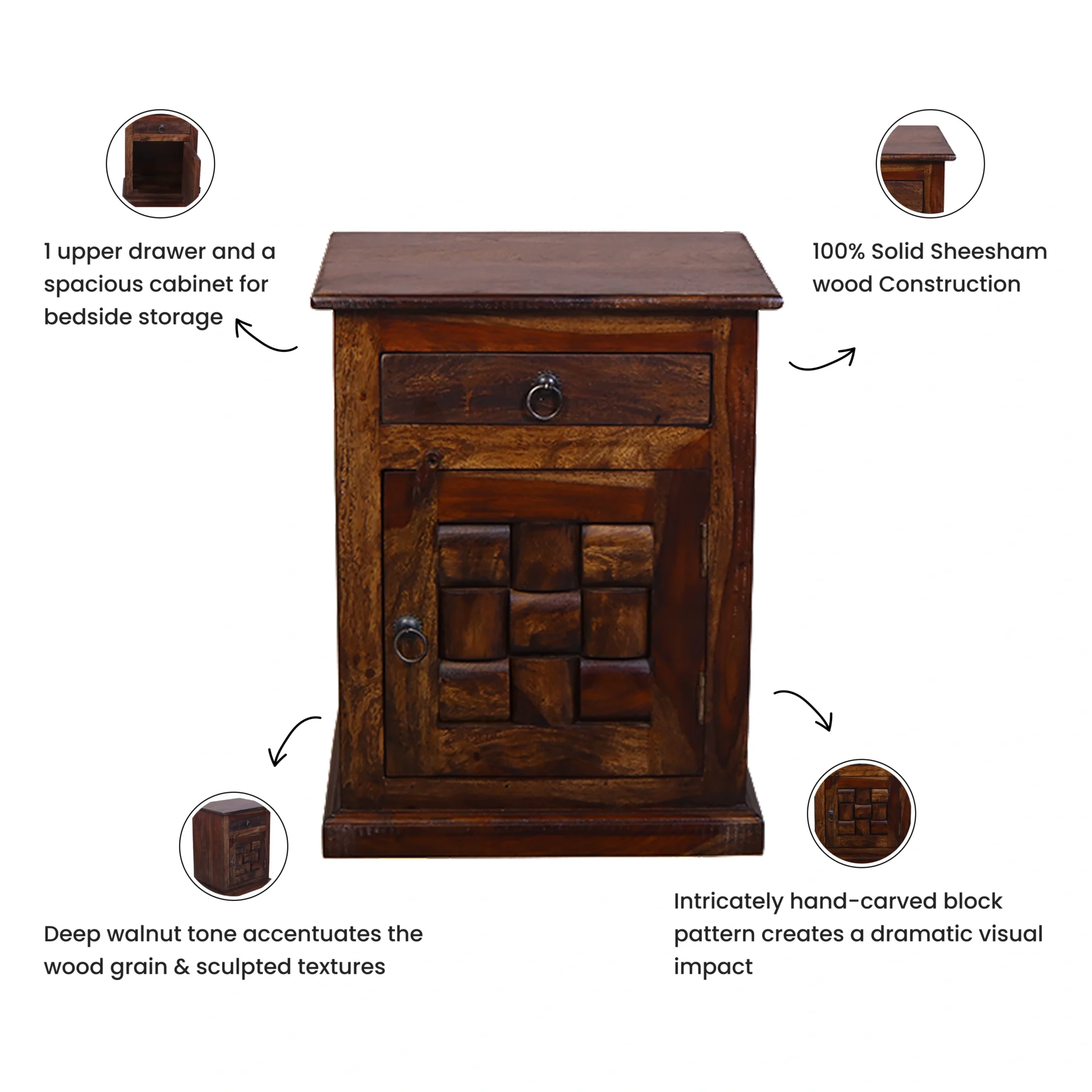 Elevate your bedroom’s ambiance with the bold and artistic Nivaar Bedside Table, expertly handcrafted from solid Sheesham wood. Its standout feature is the striking 3D block pattern carved into the cabinet door a blend of craftsmanship and texture that turns a functional piece into a work of art.