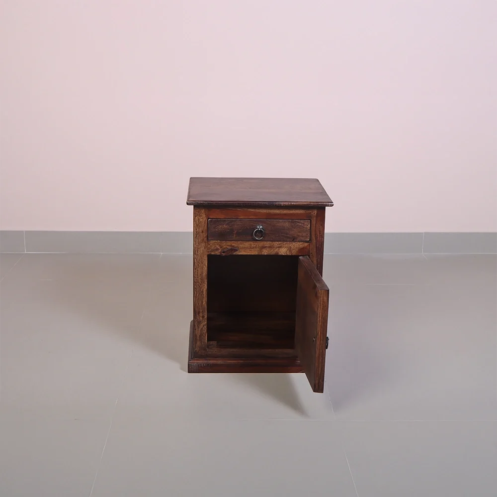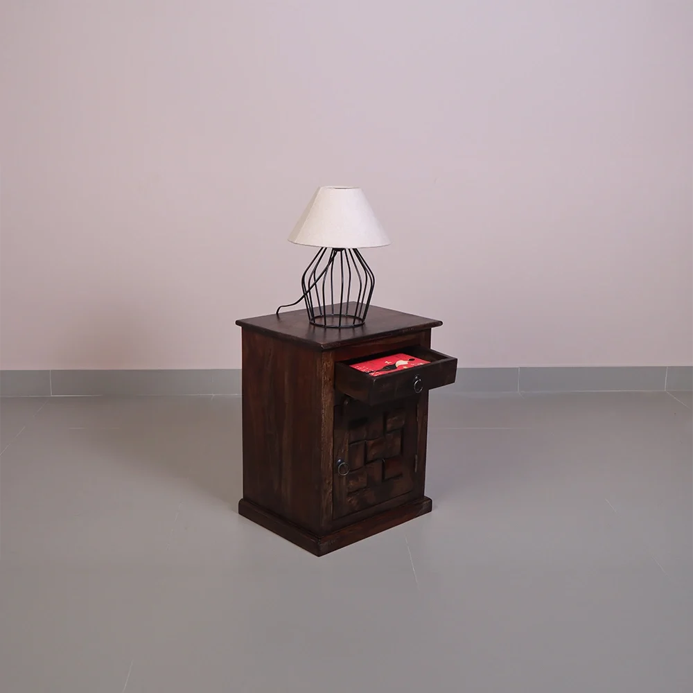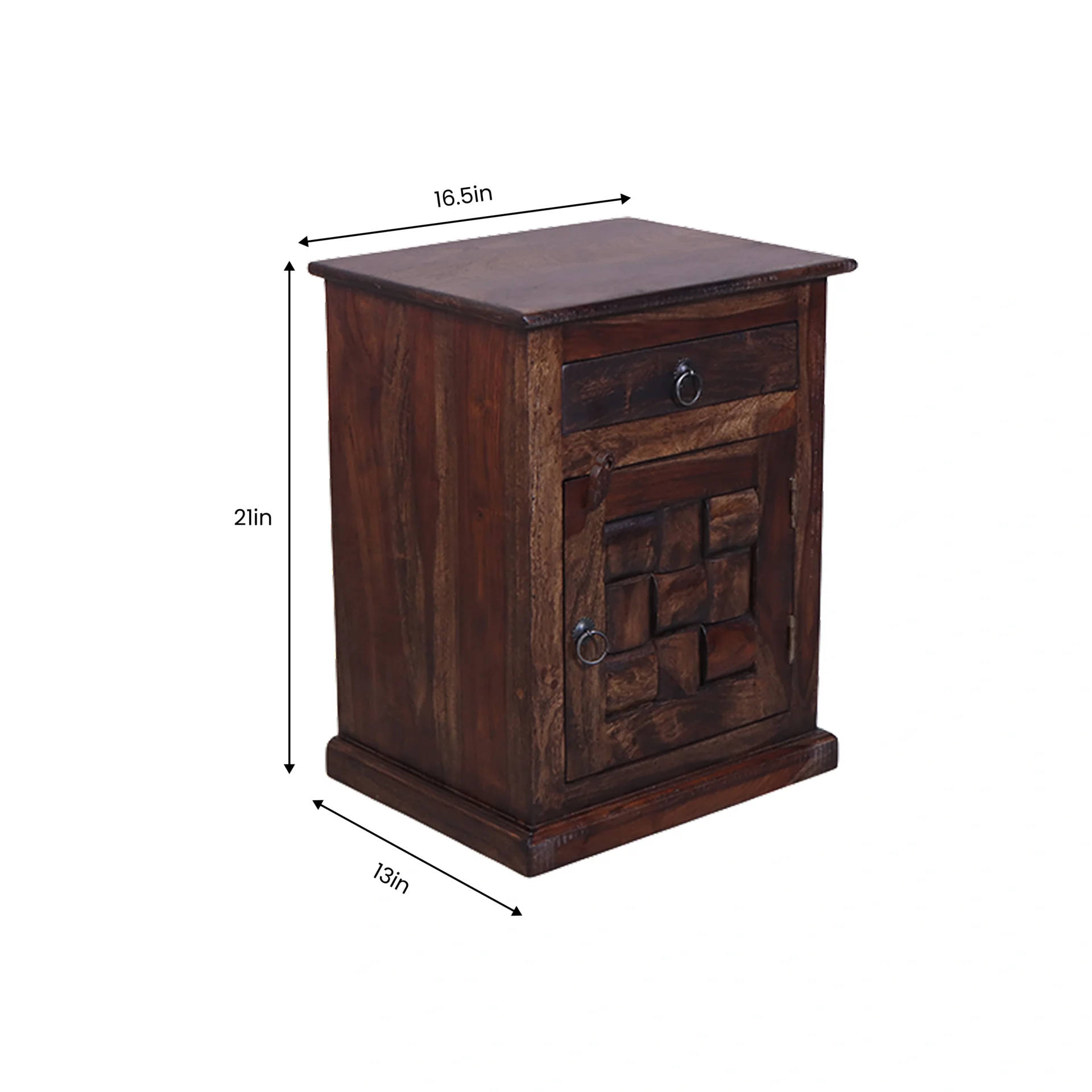 Elevate your bedroom’s ambiance with the bold and artistic Nivaar Bedside Table, expertly handcrafted from solid Sheesham wood. Its standout feature is the striking 3D block pattern carved into the cabinet door a blend of craftsmanship and texture that turns a functional piece into a work of art.