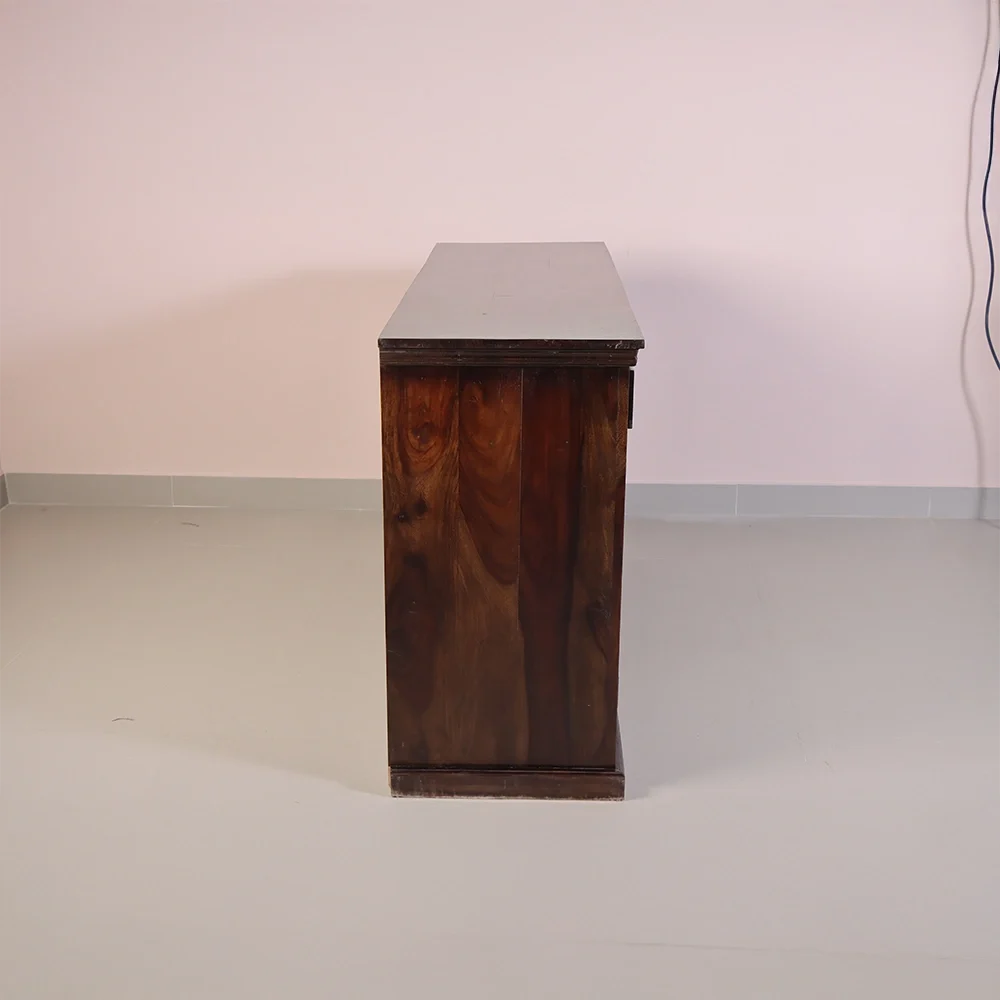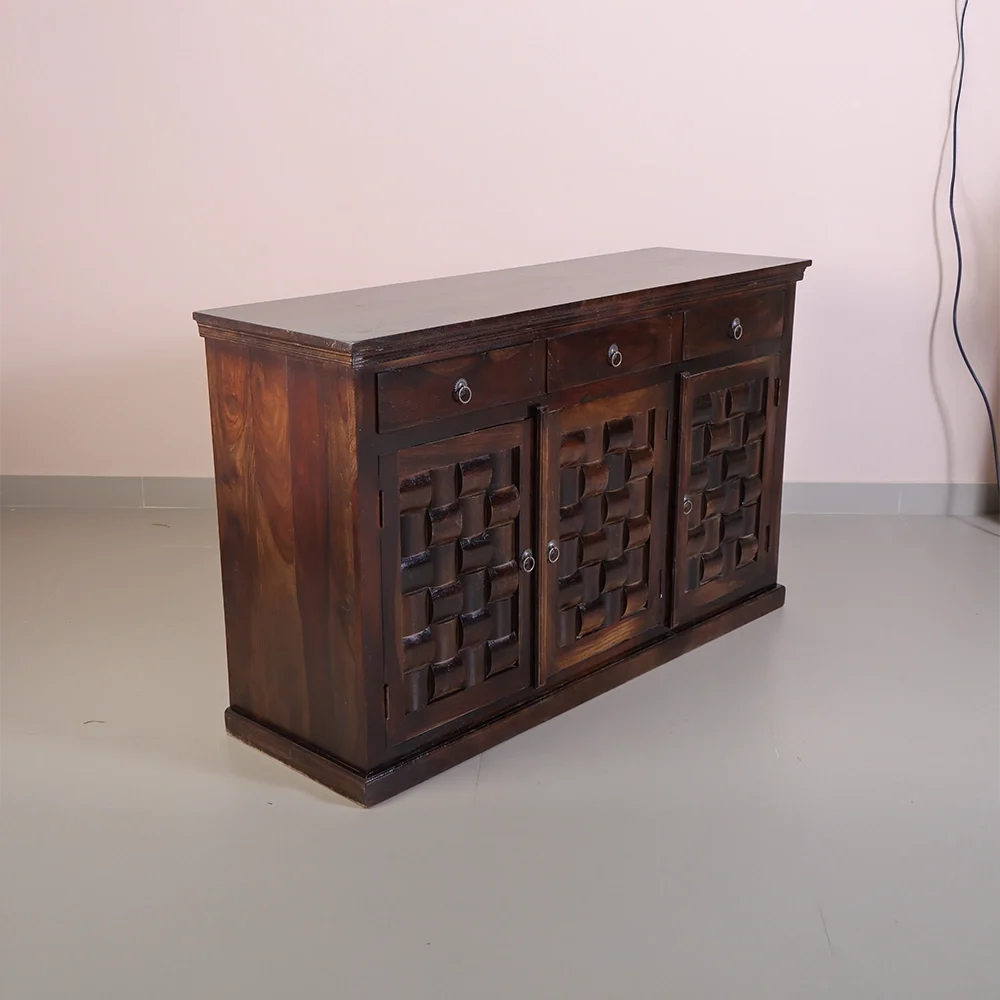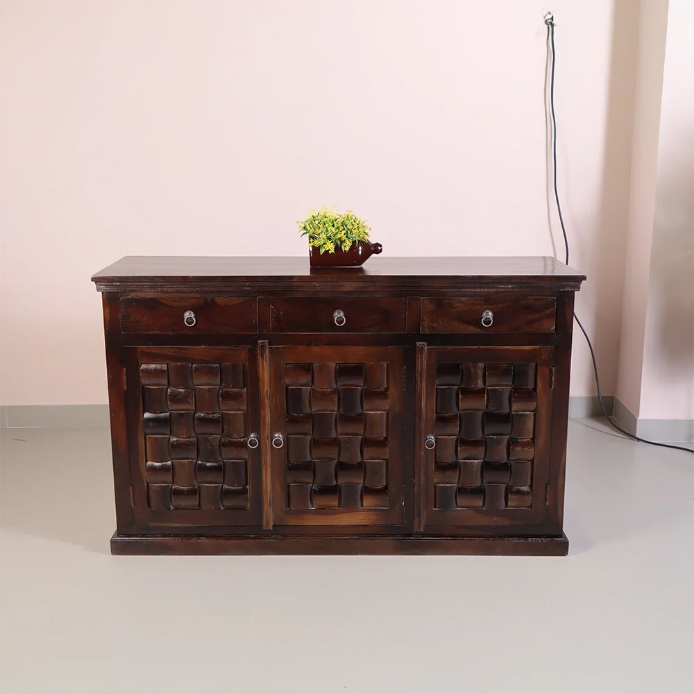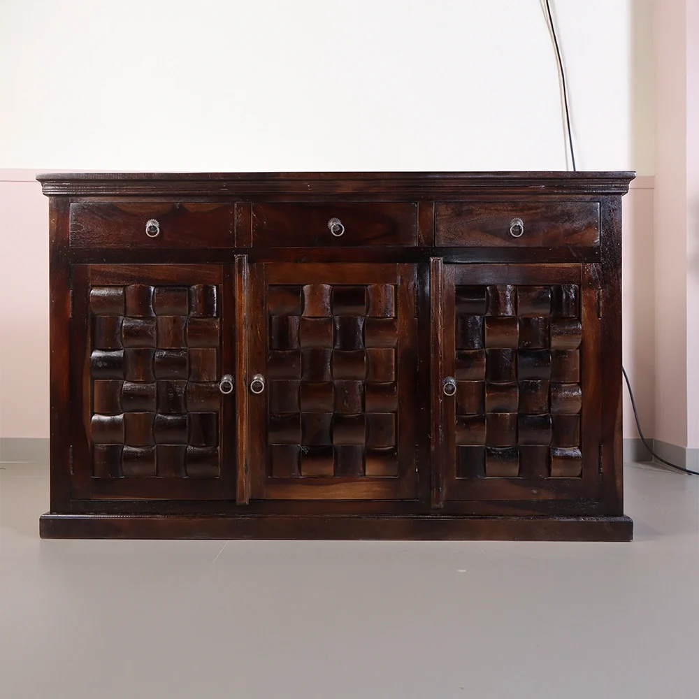 The Nivaar Sideboard is a perfect blend of traditional craftsmanship and modern functionality. Designed to enhance any living or dining space, this piece stands out with its rich, dark wood finish and intricately hand-carved woven pattern on the doors. It’s more than just a storage unit—it’s a bold design statement.