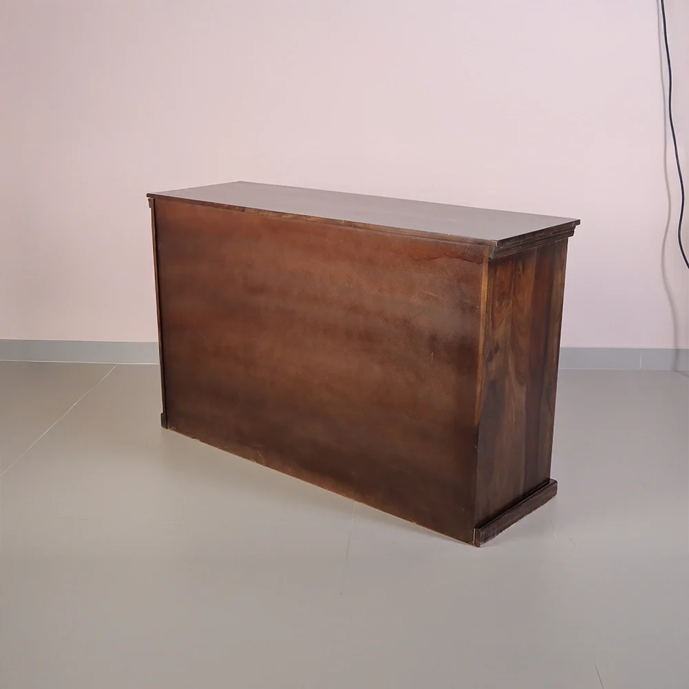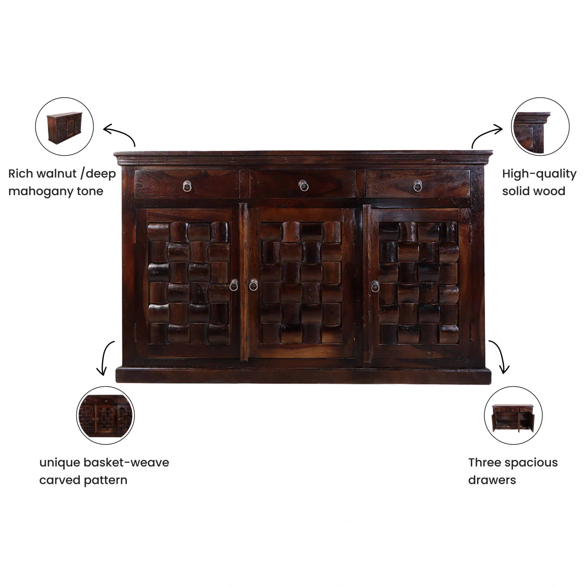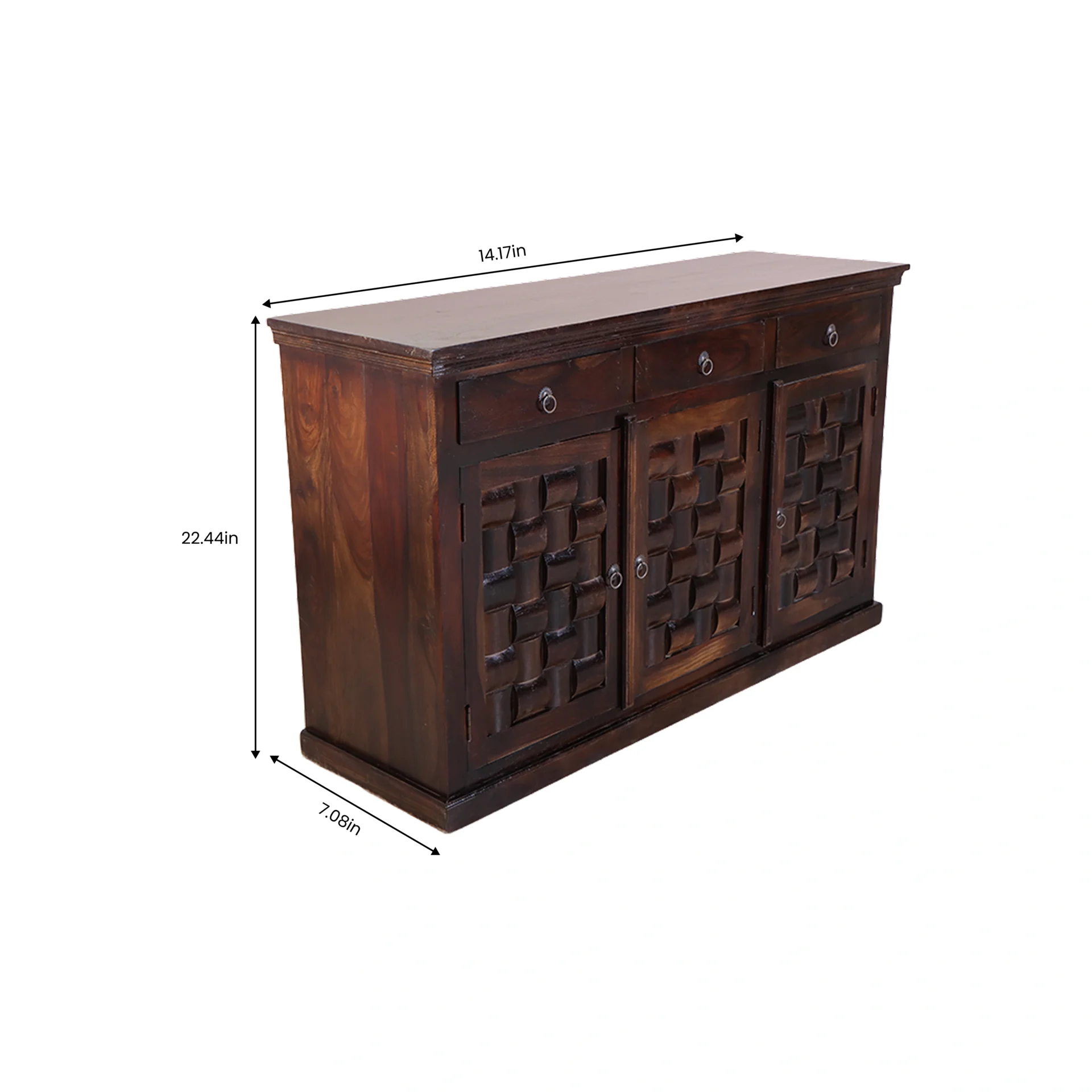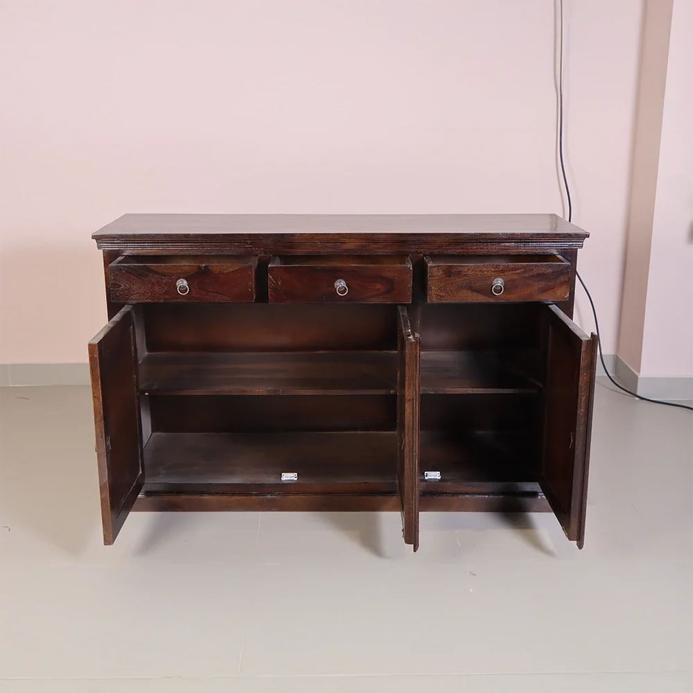 The Nivaar Sideboard is a perfect blend of traditional craftsmanship and modern functionality. Designed to enhance any living or dining space, this piece stands out with its rich, dark wood finish and intricately hand-carved woven pattern on the doors. It’s more than just a storage unit—it’s a bold design statement.