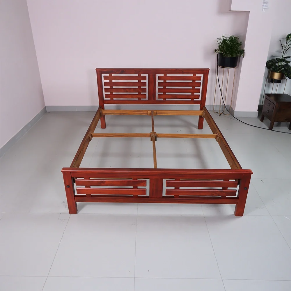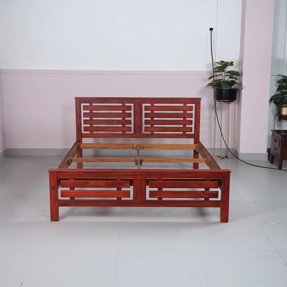 Smooth teak finish with a sleek, slatted headboard and footboard