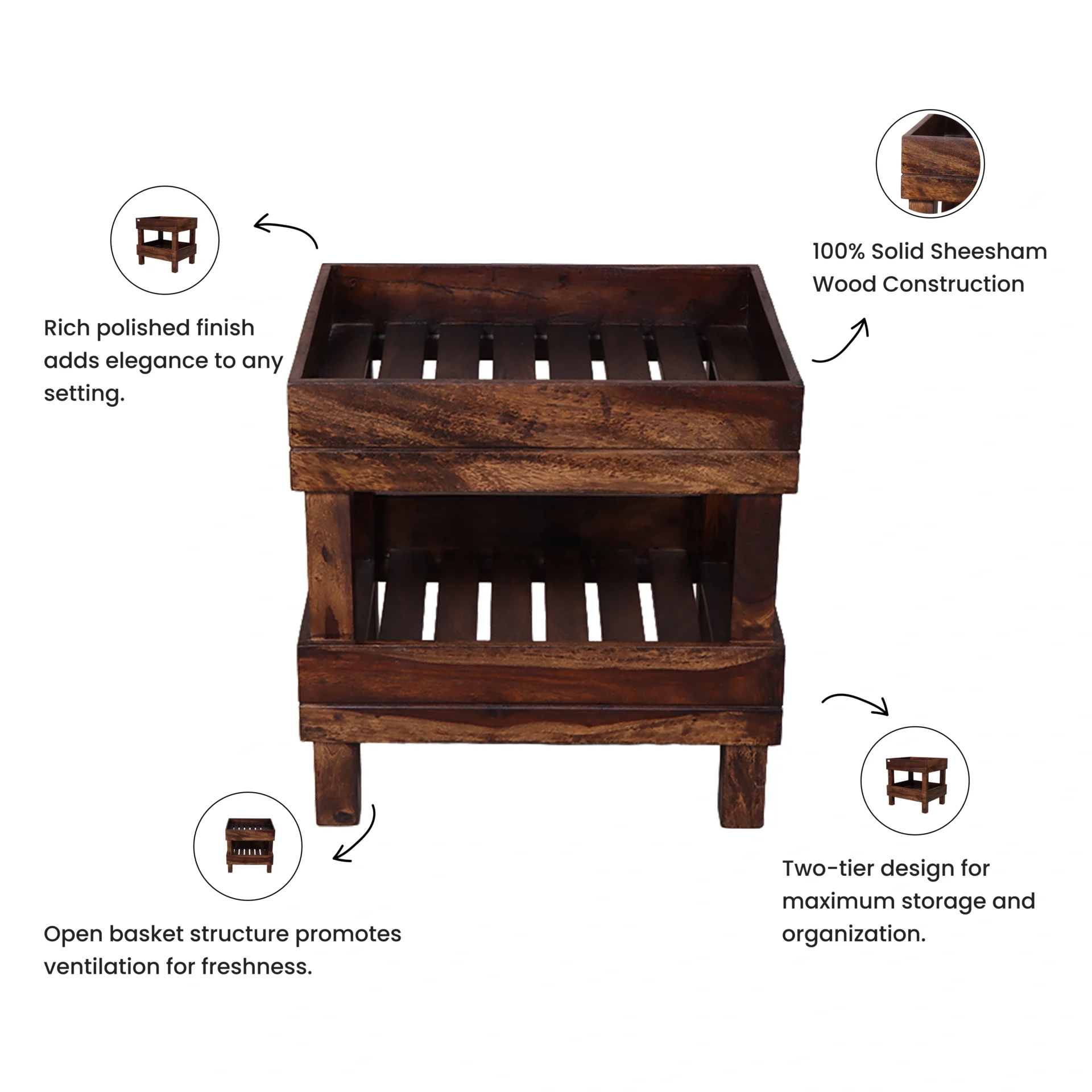 Its sturdy frame ensures durability, while the smooth finish highlights the natural beauty of the wood. The open design allows for proper air circulation, keeping fruits and veggies fresh for longer. With its stylish and practical structure, it seamlessly blends into kitchens, dining areas, or even living spaces.