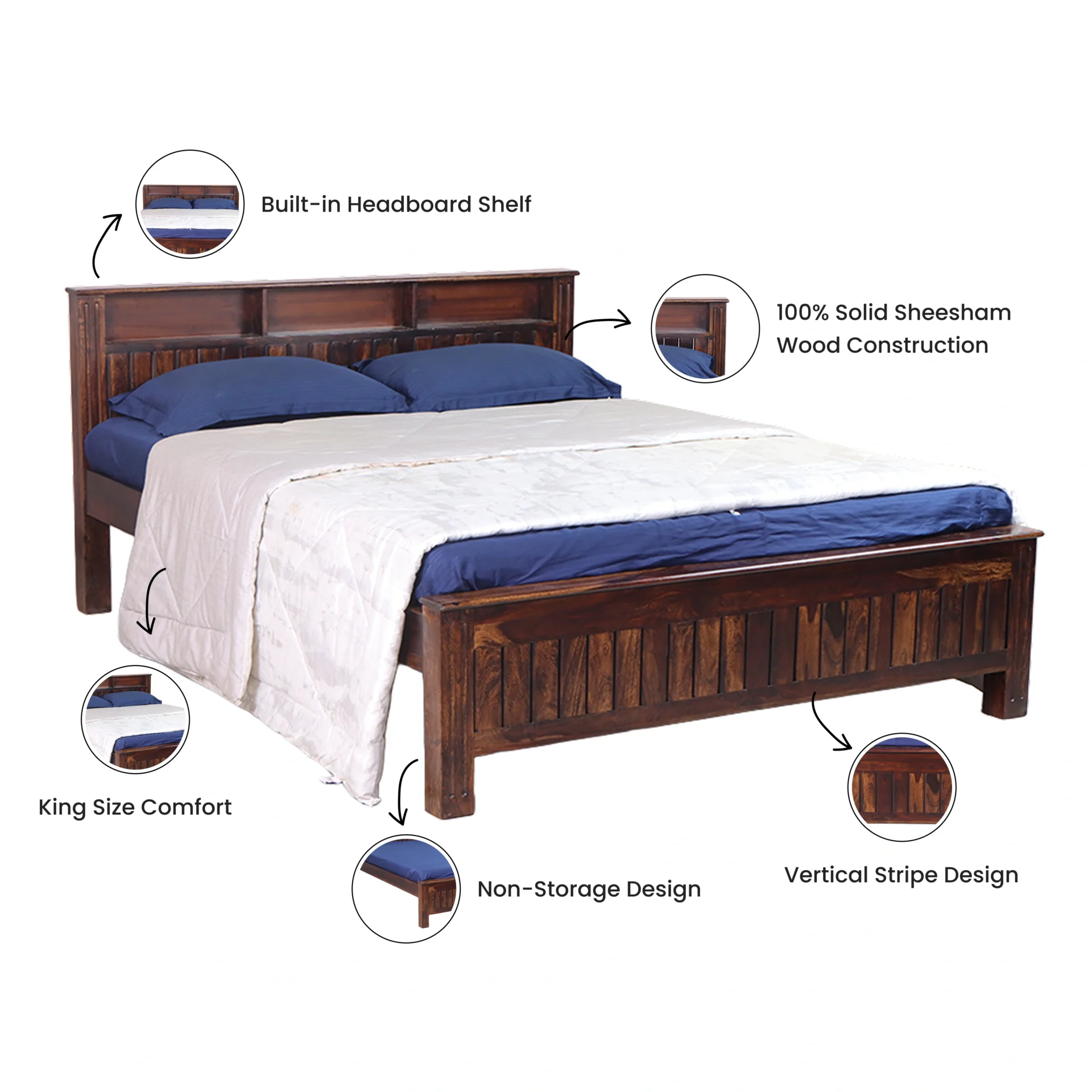 | Mattress Support | The mattress is supported by a 12 mm plywood base, which is further reinforced by three iron rods to enhance the bed's structural strength and load-bearing capacity. |