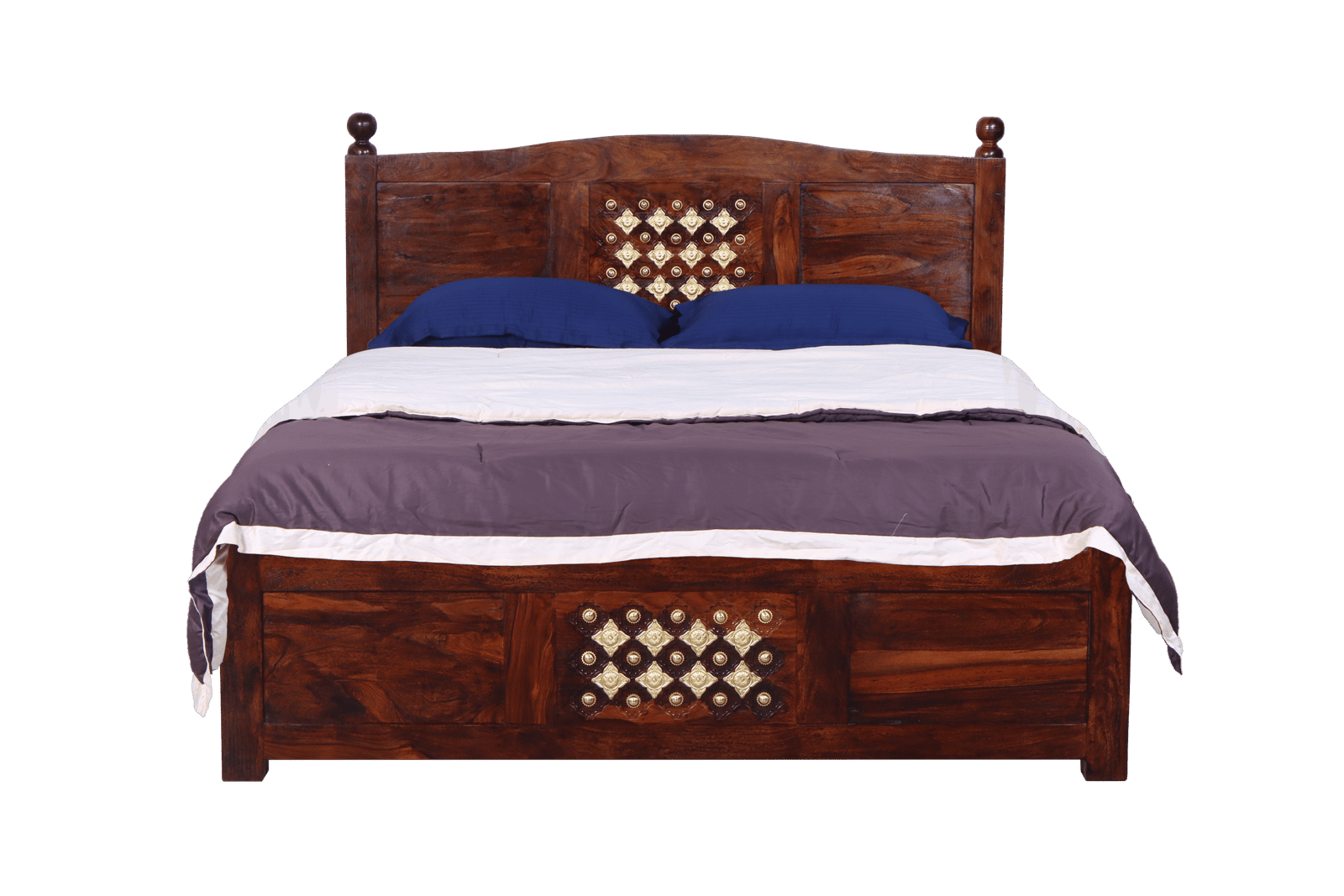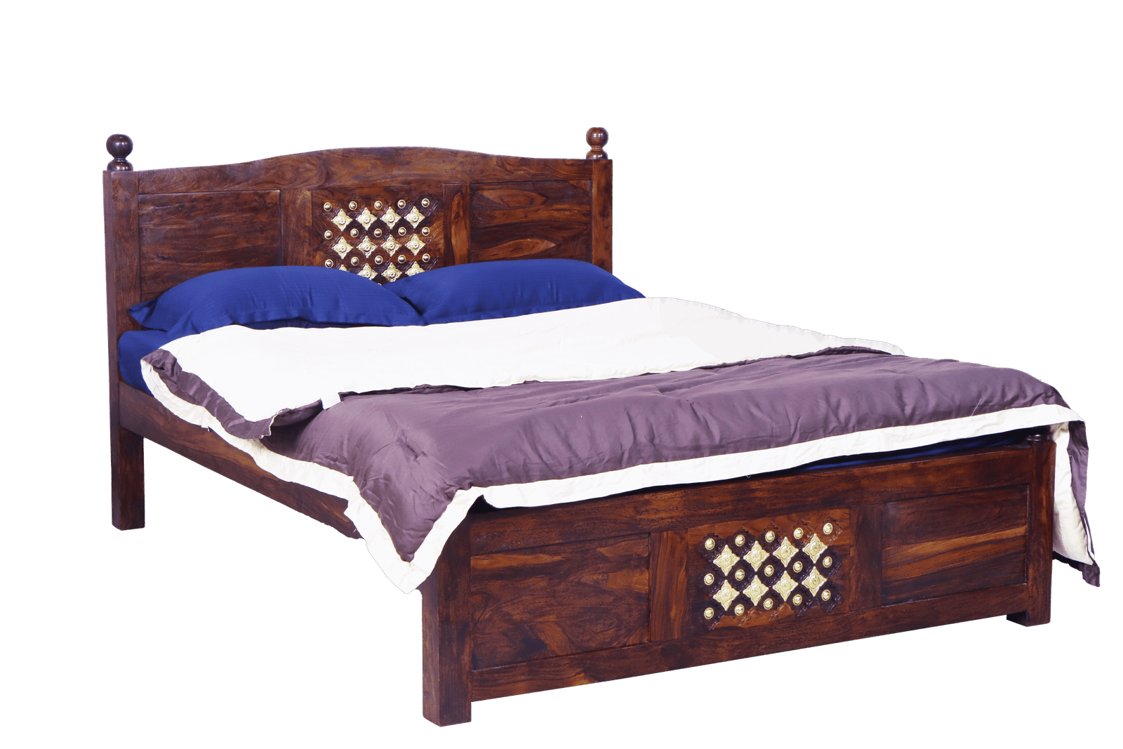 Make a regal statement in your bedroom with the Royal Bakhra Cot, a Queen size bed that beautifully marries tradition with opulence. Expertly crafted from premium Sheesham wood, this non-storage cot features intricate brass embroidery work on both the headboard and footboard—adding a luxurious, handcrafted charm.