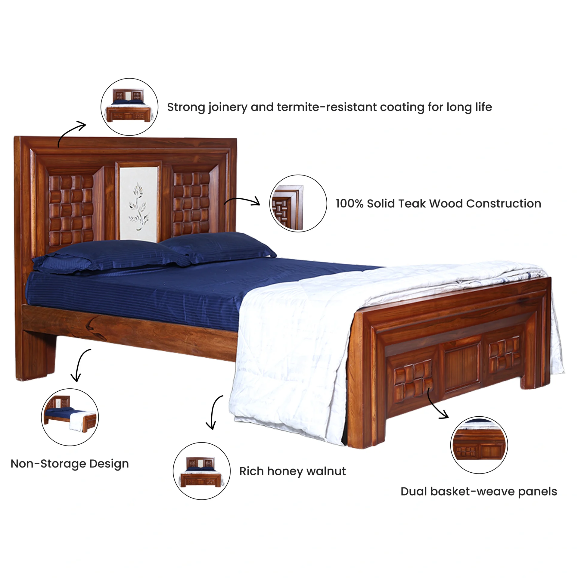 The Sara Centre Tile Mid Flower Bed is an elegant blend of craftsmanship and contemporary design, crafted from premium Teak wood with a rich natural finish. Its standout feature is the beautifully carved headboard showcasing a woven tile pattern on both sides and a central floral inlay panel, creating a perfect harmony between tradition and sophistication.