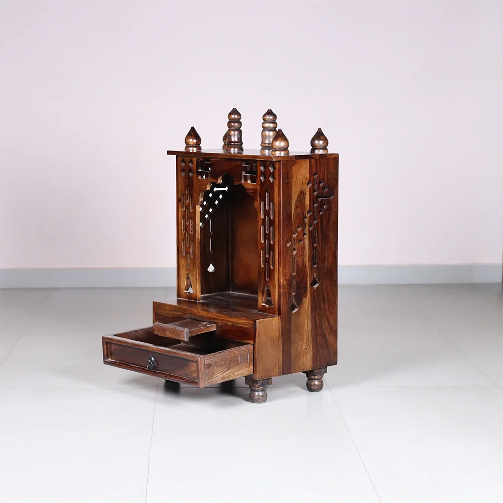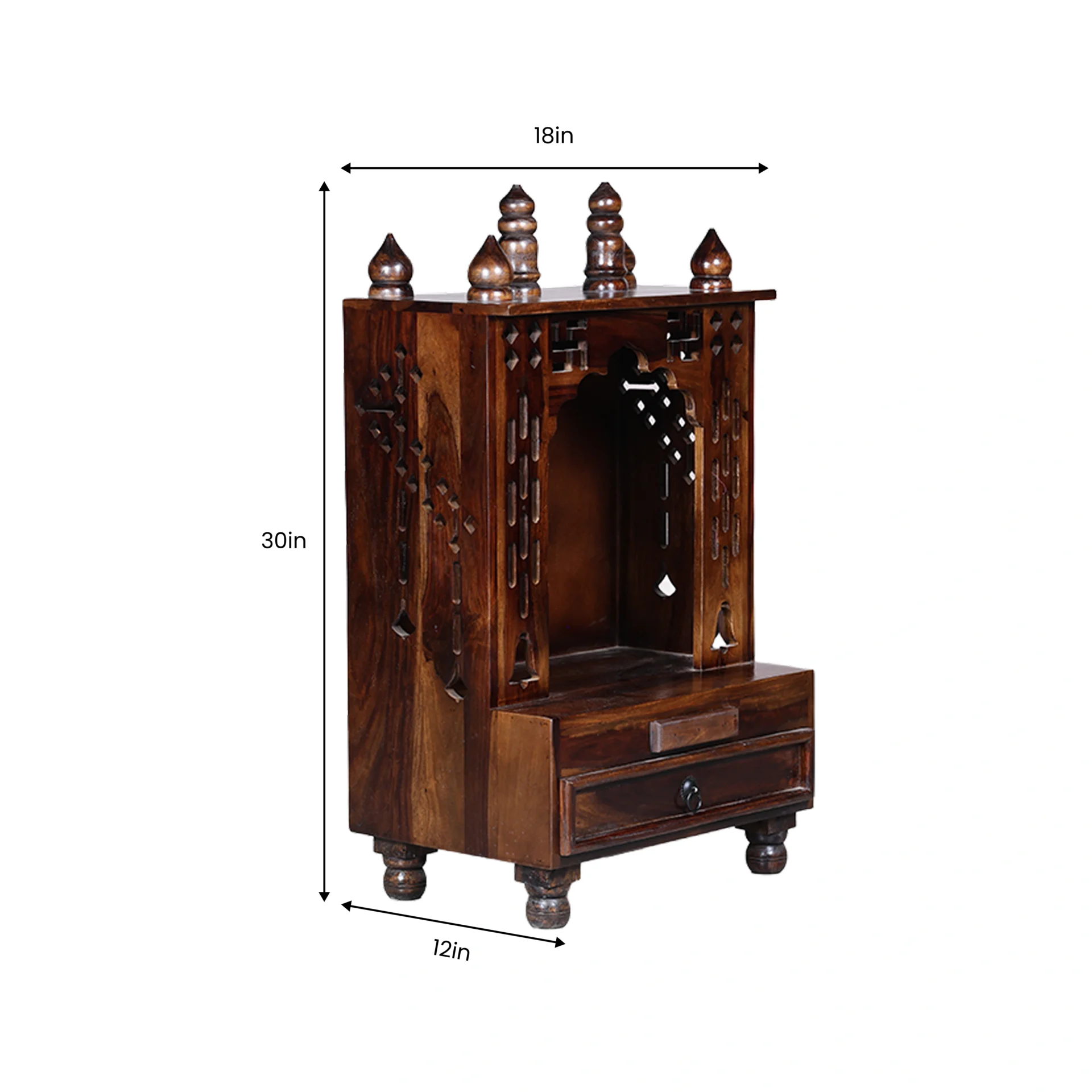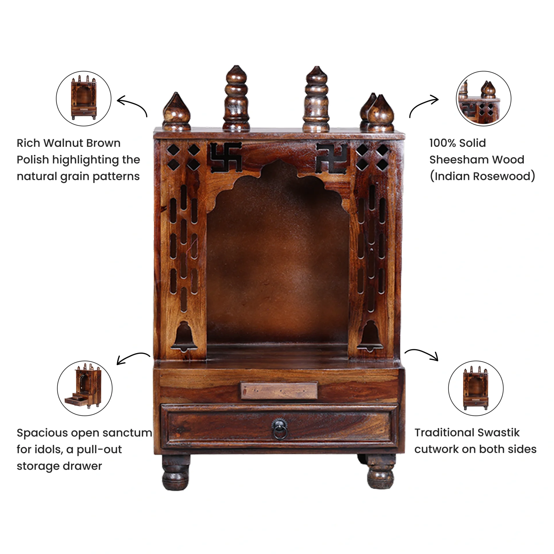 • Structure: Spacious open sanctum for idols, a pull-out storage drawer for pooja accessories, and elevated base for stability