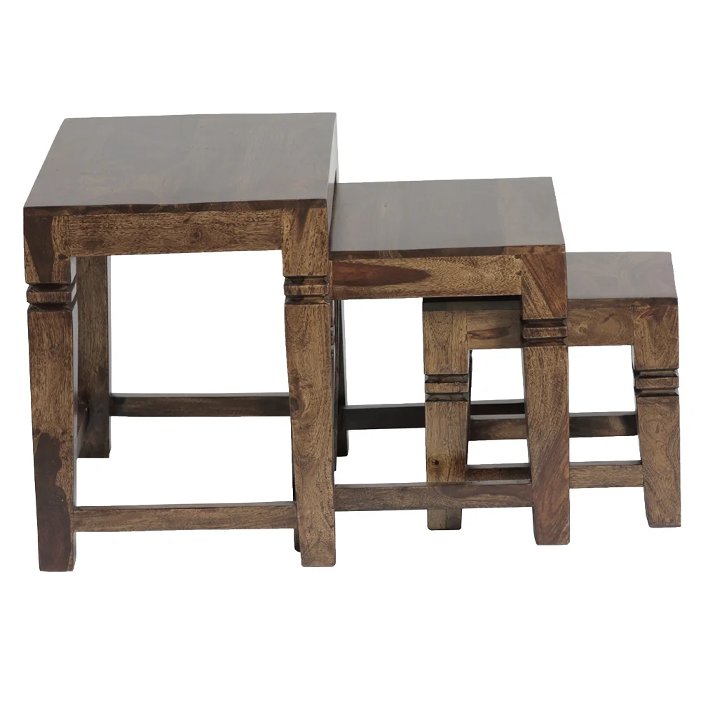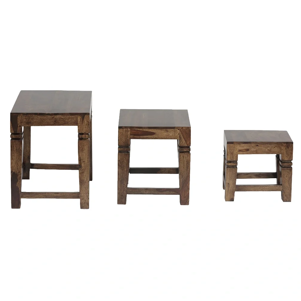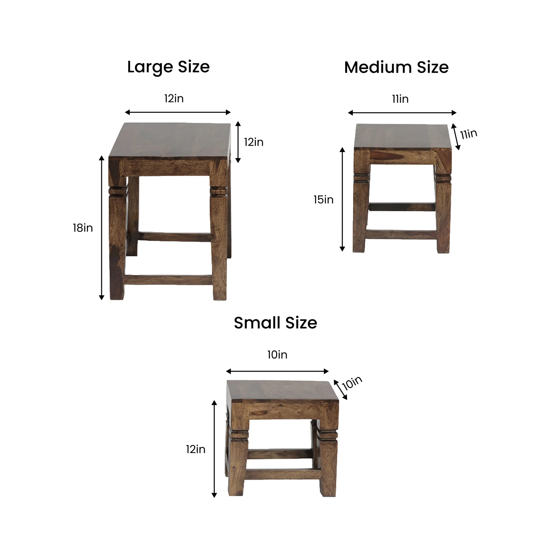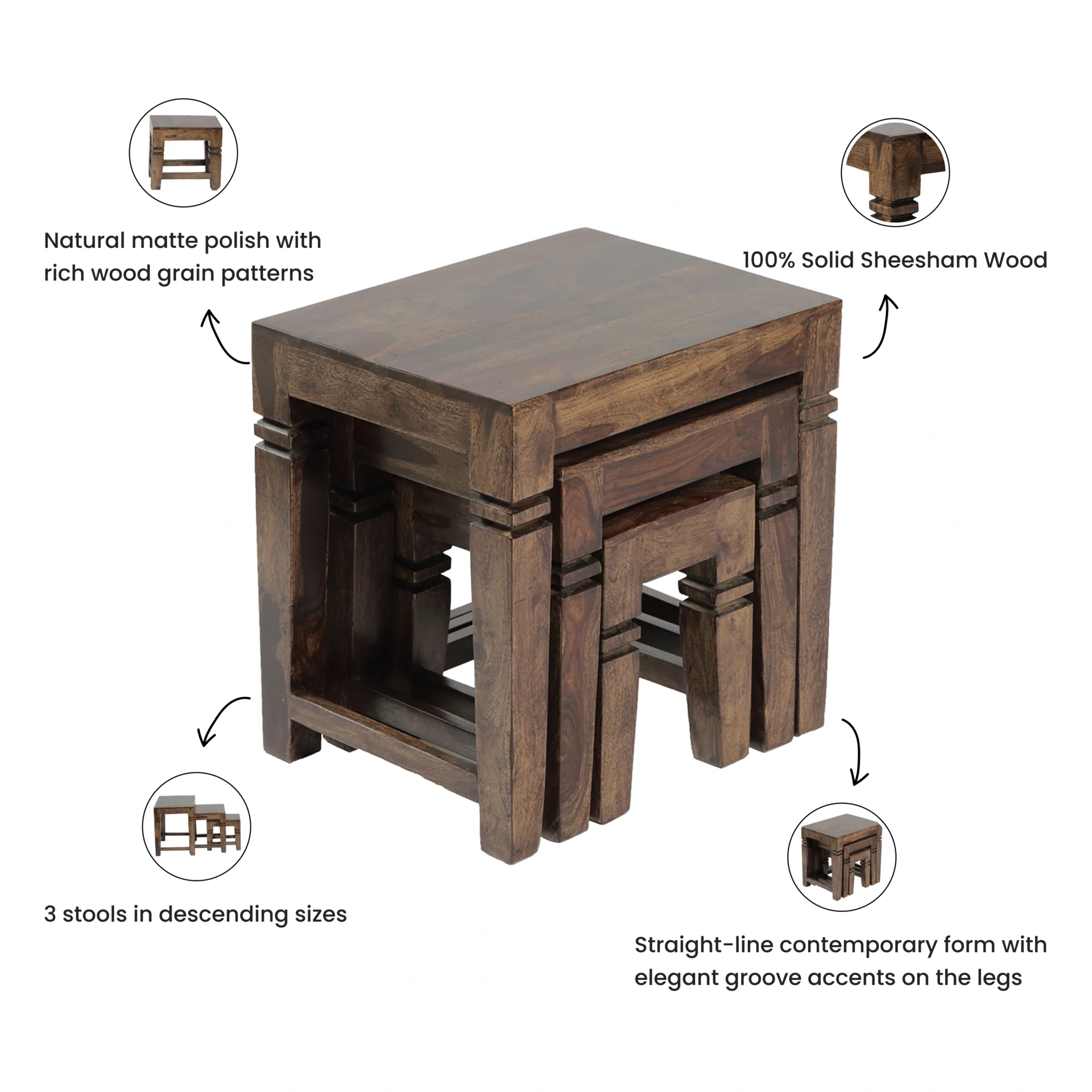 Designed for minimalists who appreciate timeless woodwork, the Sydney Nested Stool Set brings functionality and elegance to compact spaces. Expertly handcrafted from premium Sheesham wood, each stool in this set features clean lines, subtle groove detailing on the legs, and a smooth flat top. The nesting design ensures space efficiency without compromising on charm or durability.