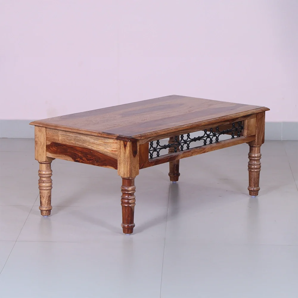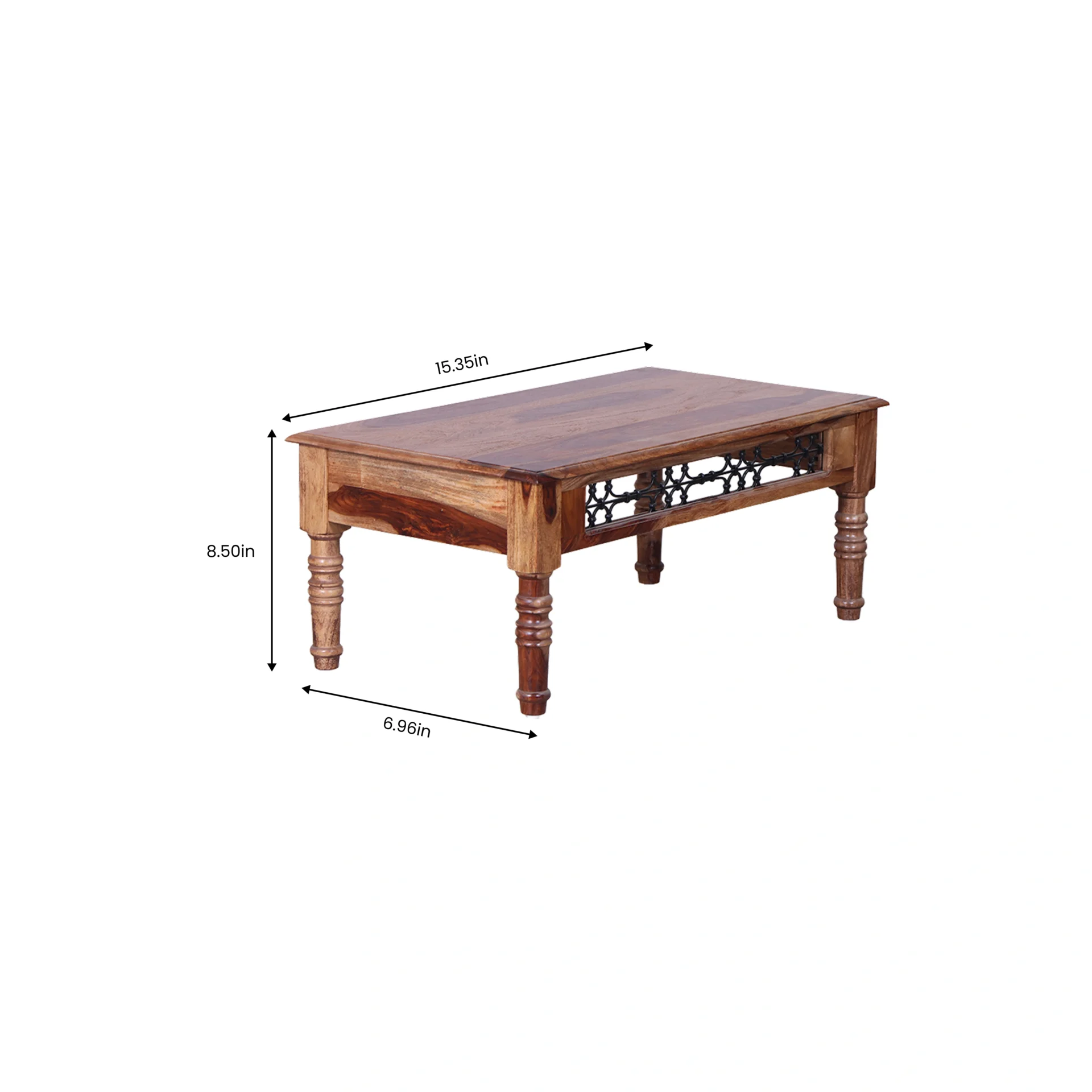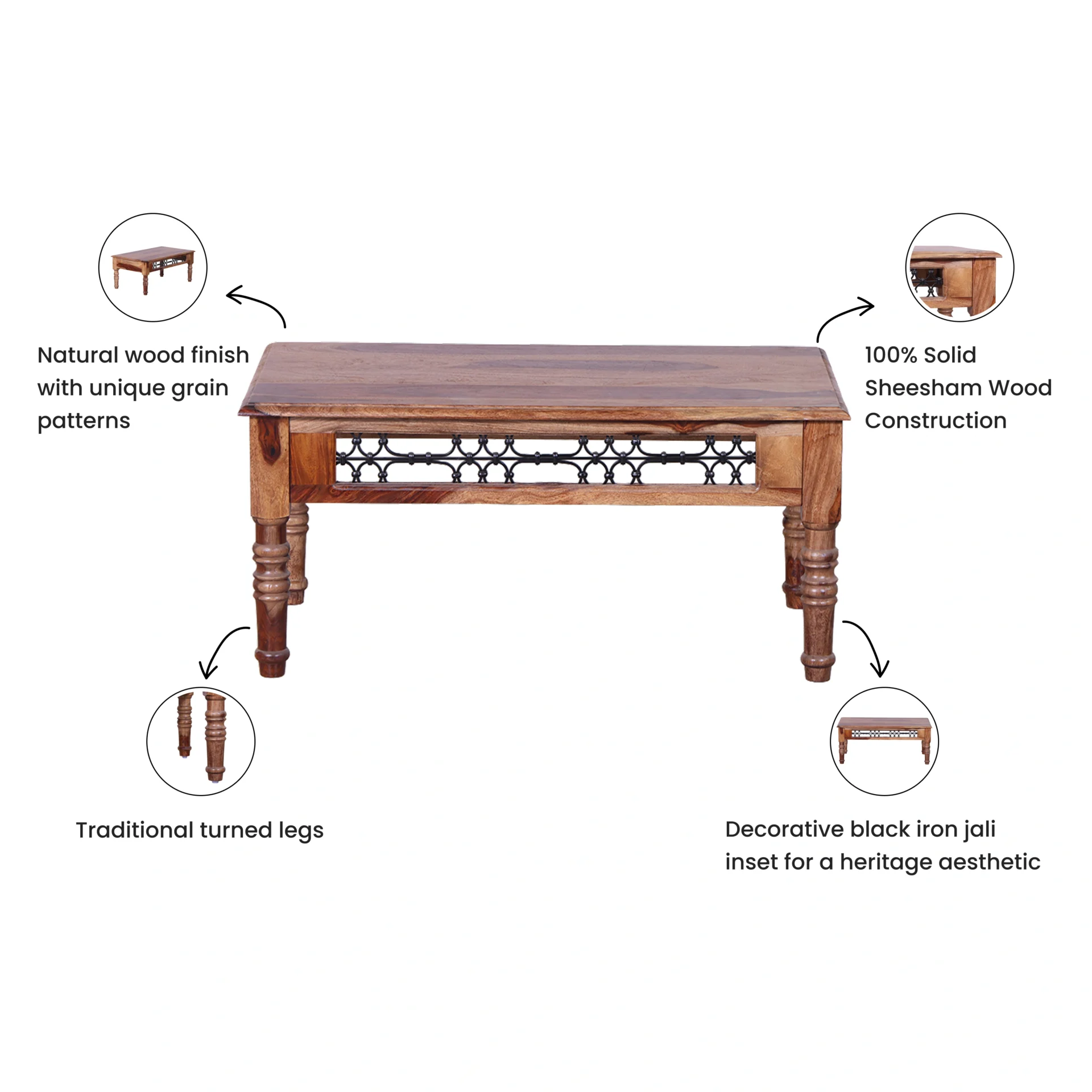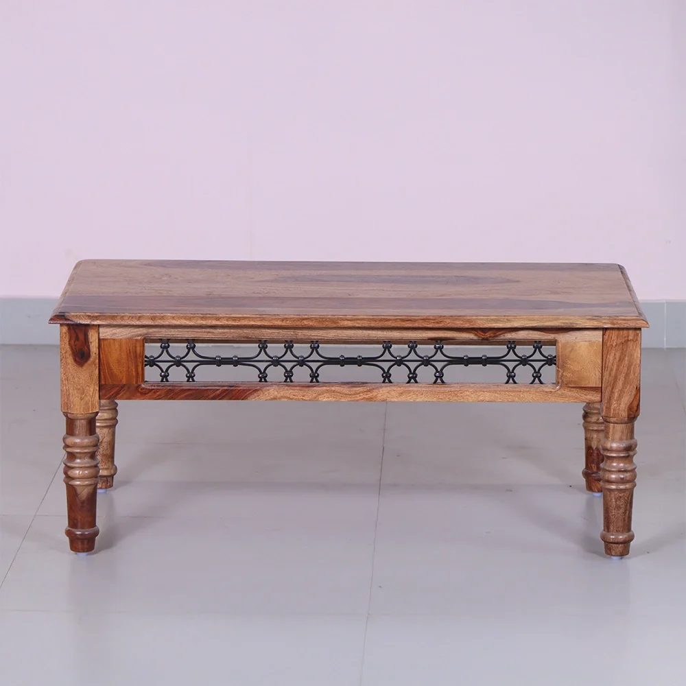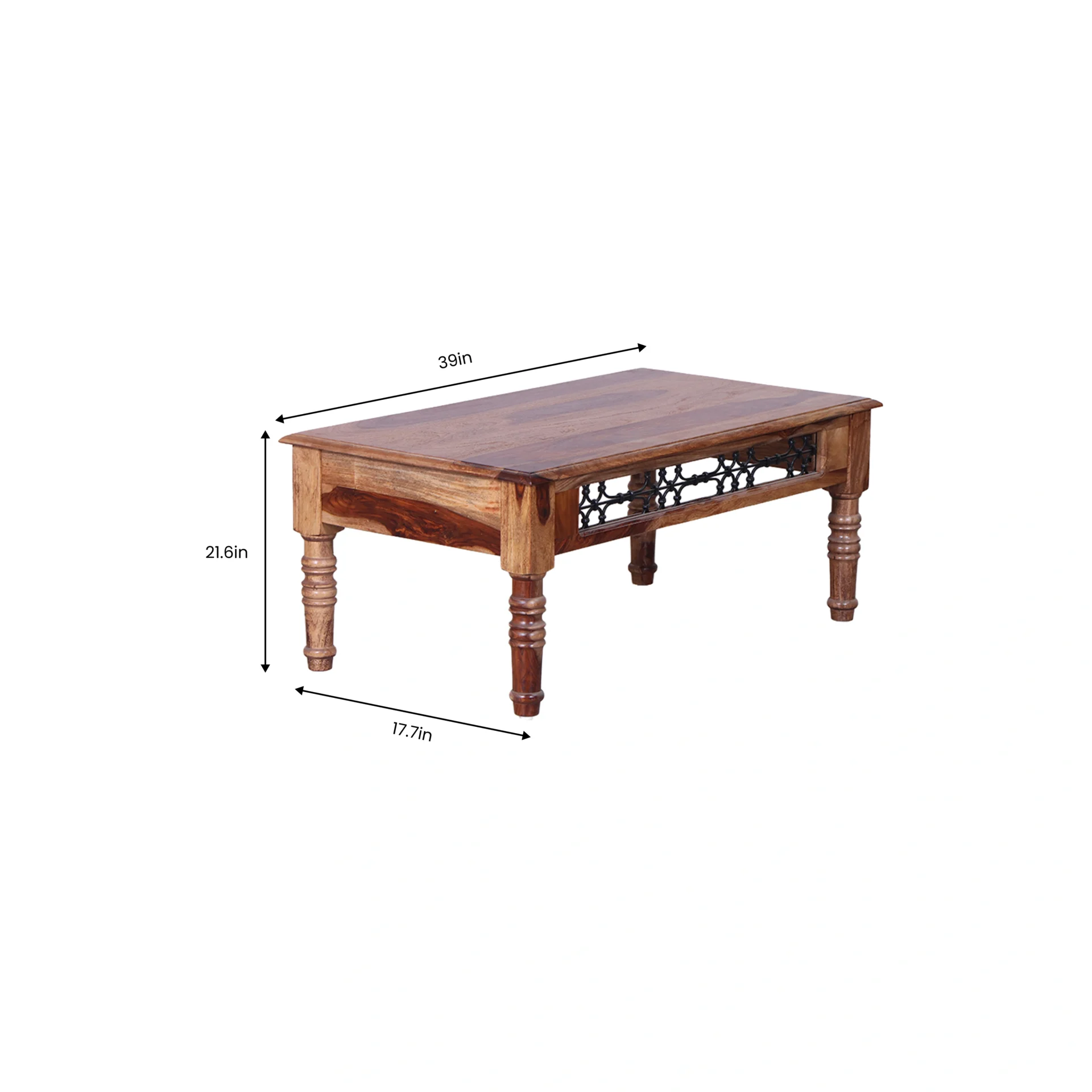 Elevate your living space with the timeless elegance of the Thames Iron Jali Coffee Table. Crafted from solid sheesham wood, this coffee table combines traditional charm with sturdy craftsmanship. The natural wood grains add warmth and texture, making it a standout centerpiece in any room.