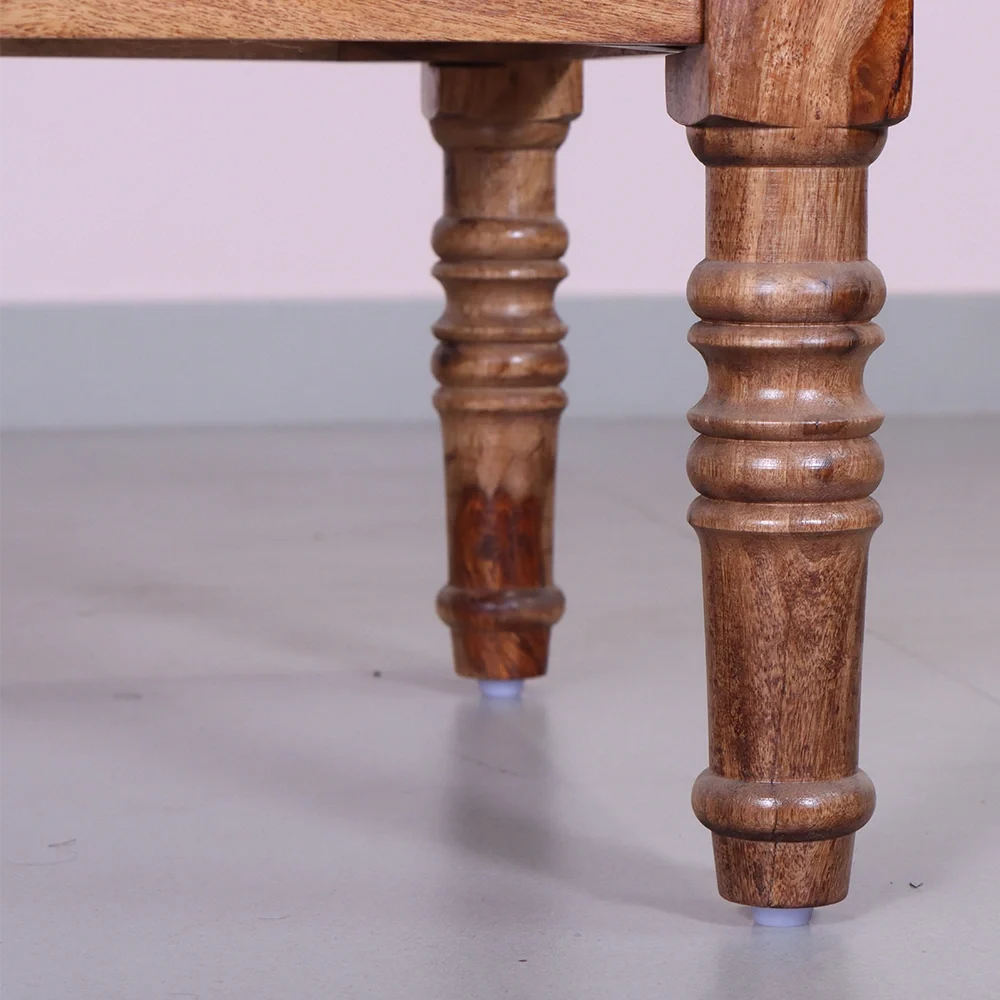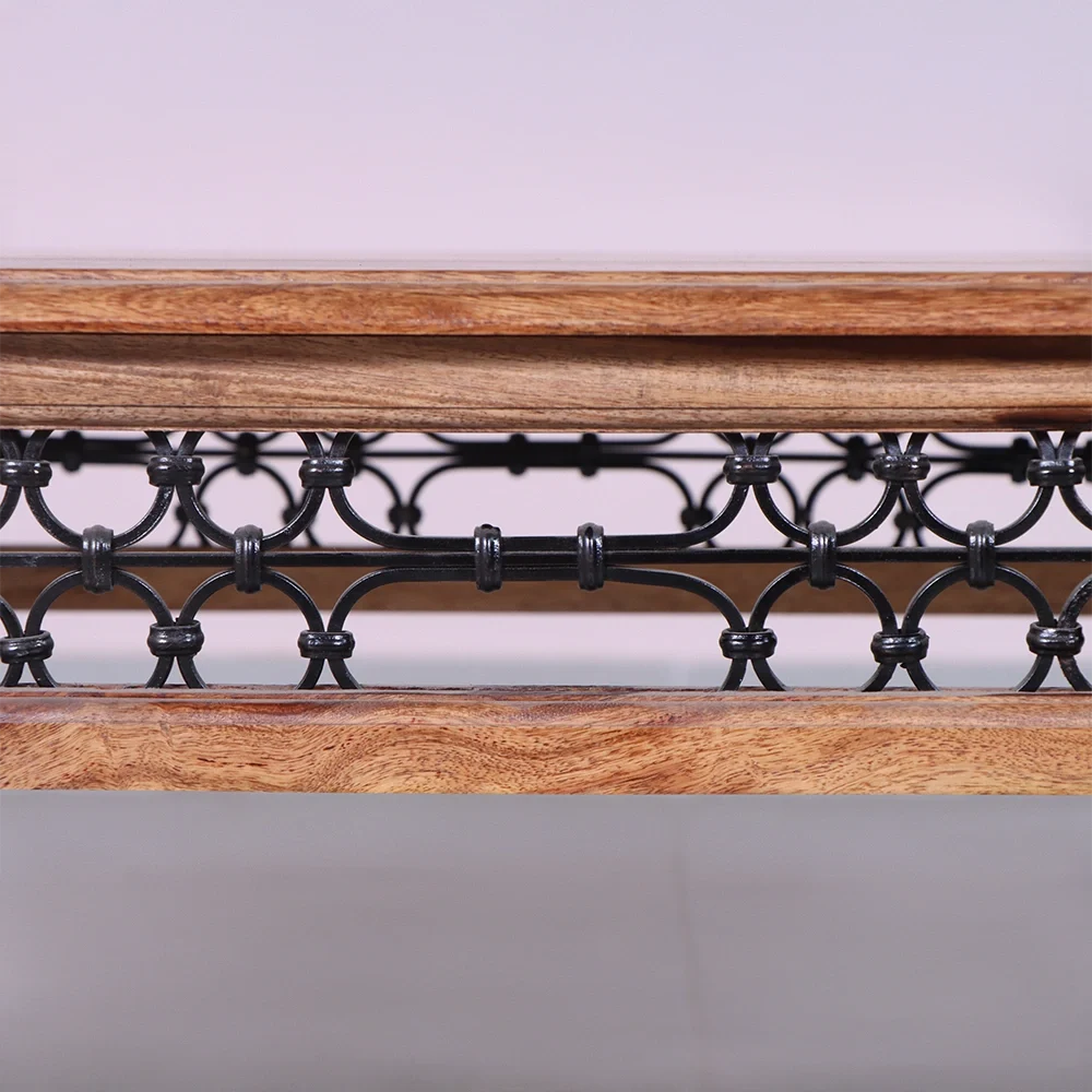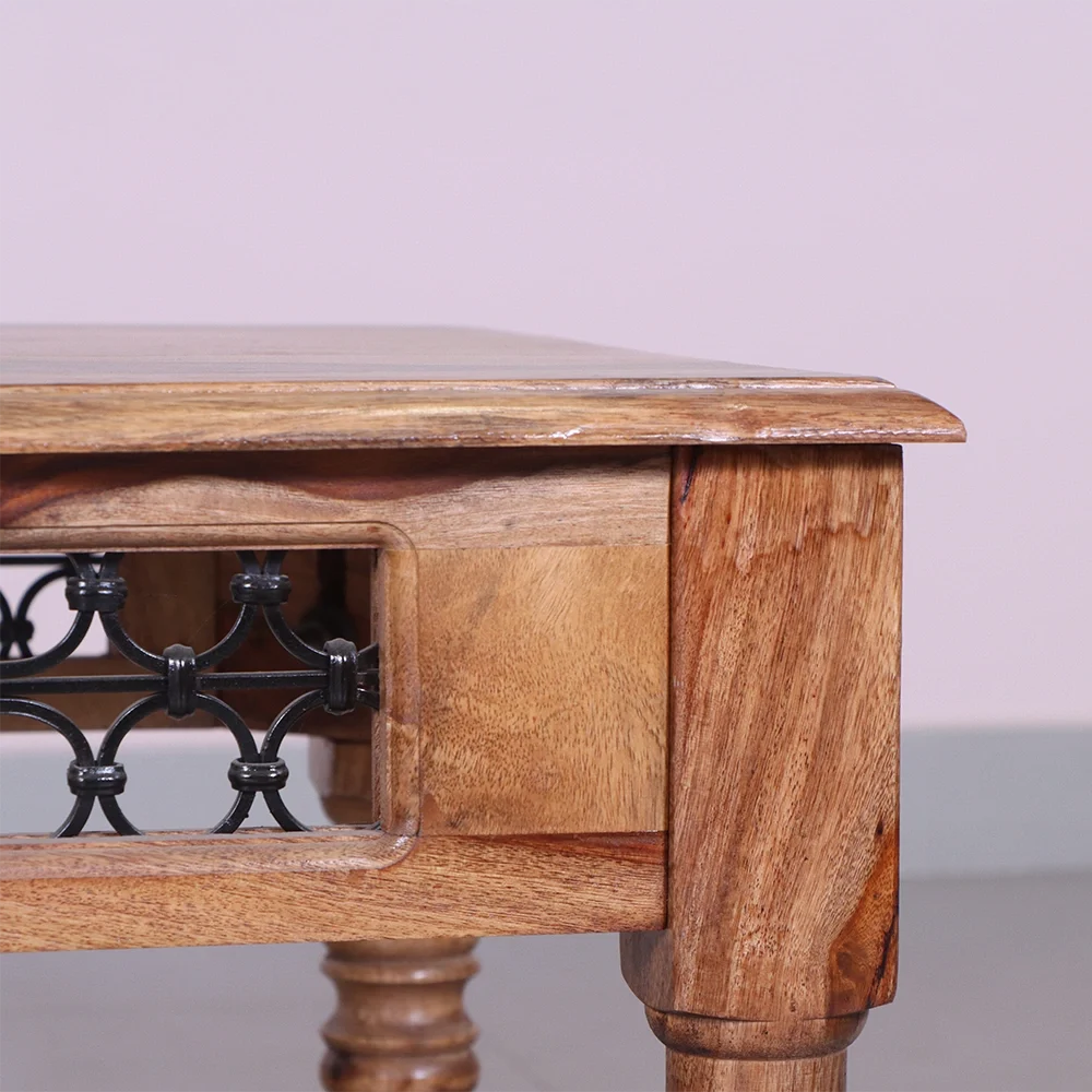 A key highlight of the design is the ornamental iron jali panel, intricately embedded beneath the tabletop. This detail lends a sophisticated vintage appeal while reinforcing the structural integrity of the piece. The robust, turned legs provide a classic touch, ensuring stability and long-lasting durability.