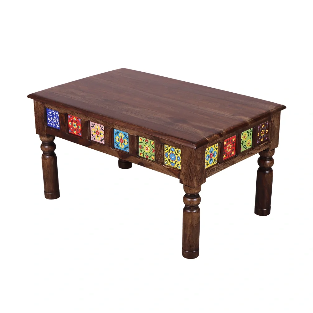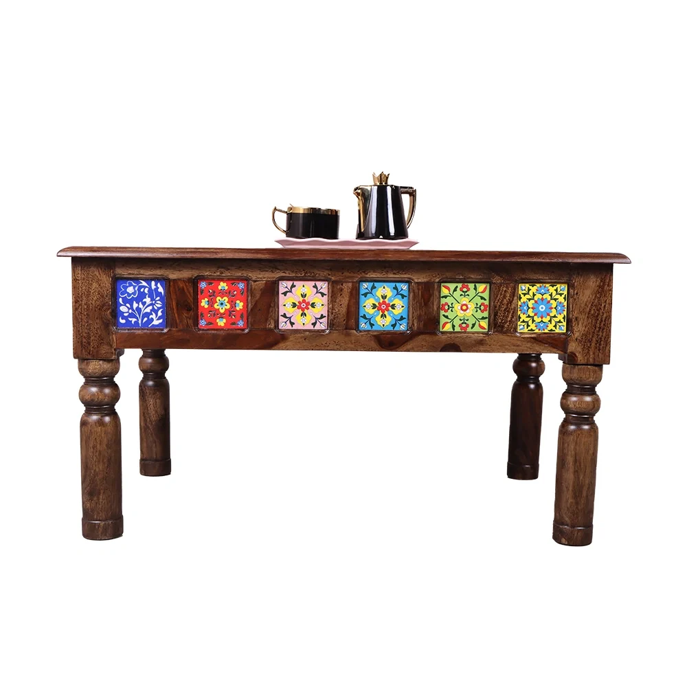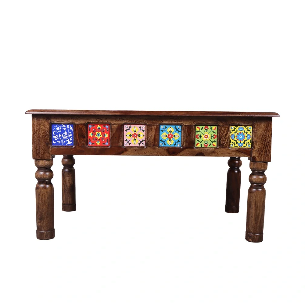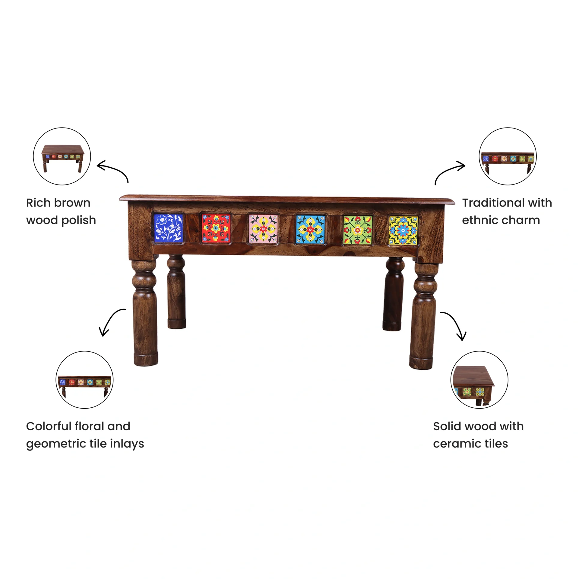 Add a vibrant touch of tradition and artistry to your living space with this handcrafted tile coffee table. Made from premium solid wood, the table features a smooth, rich brown finish that enhances the natural grain of the wood. The standout feature is the row of six hand-painted ceramic tiles embedded along the apron, each showcasing intricate floral and geometric designs in a range of vivid colors.