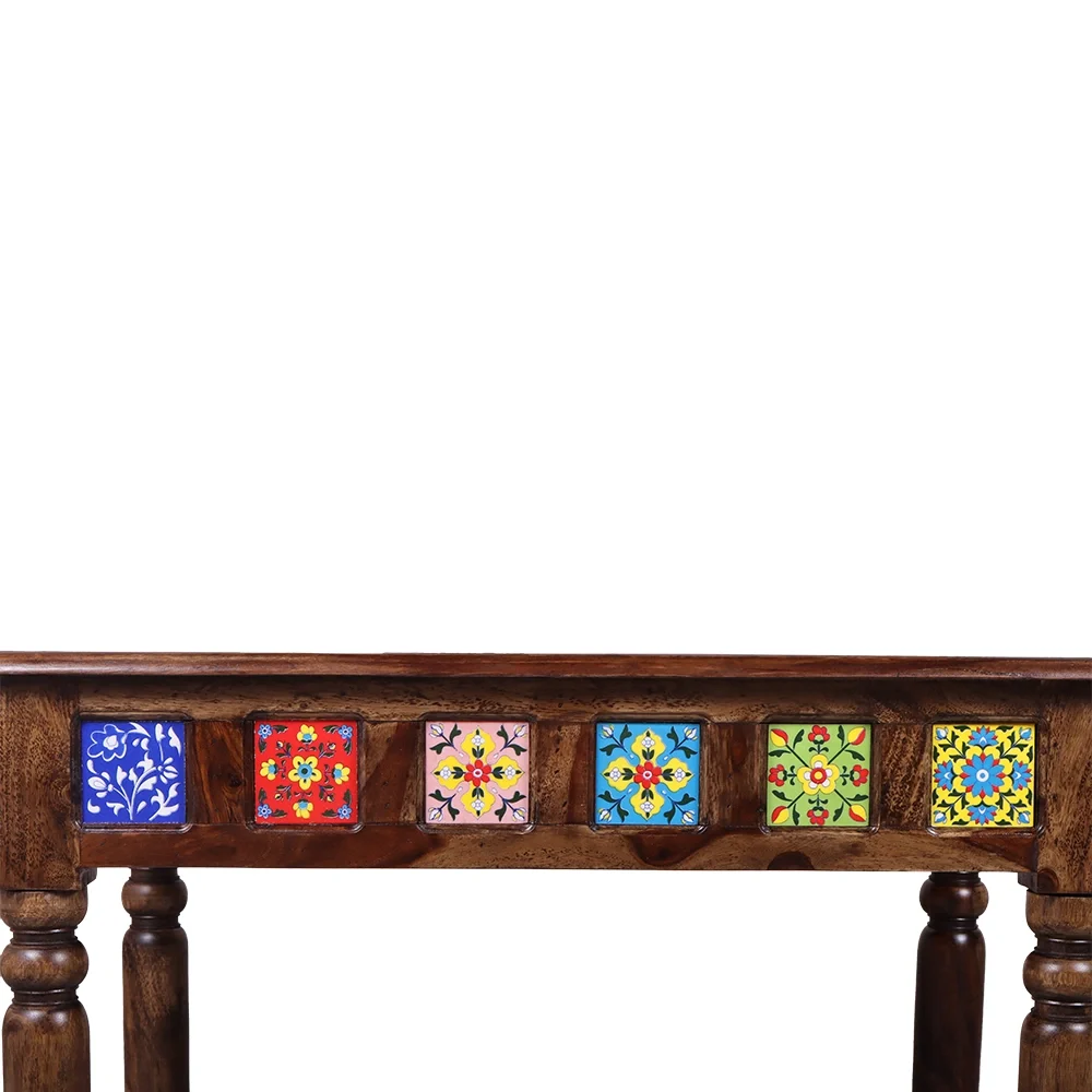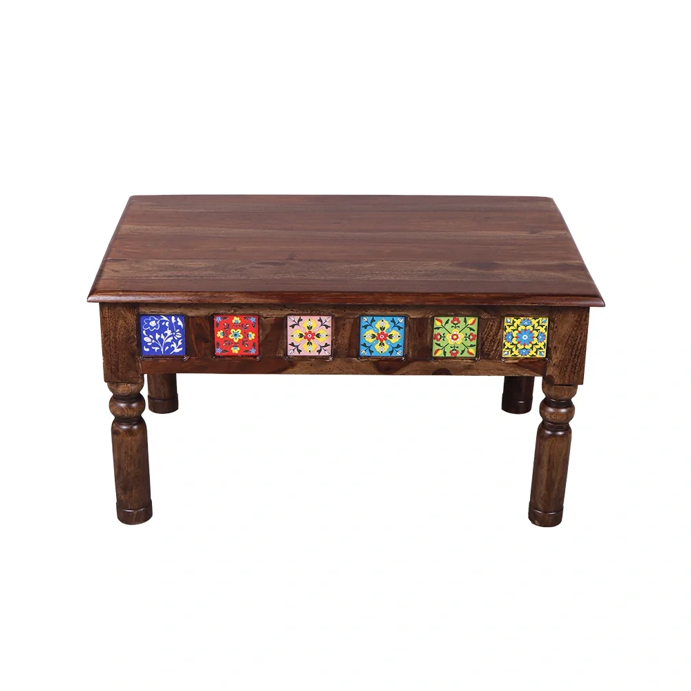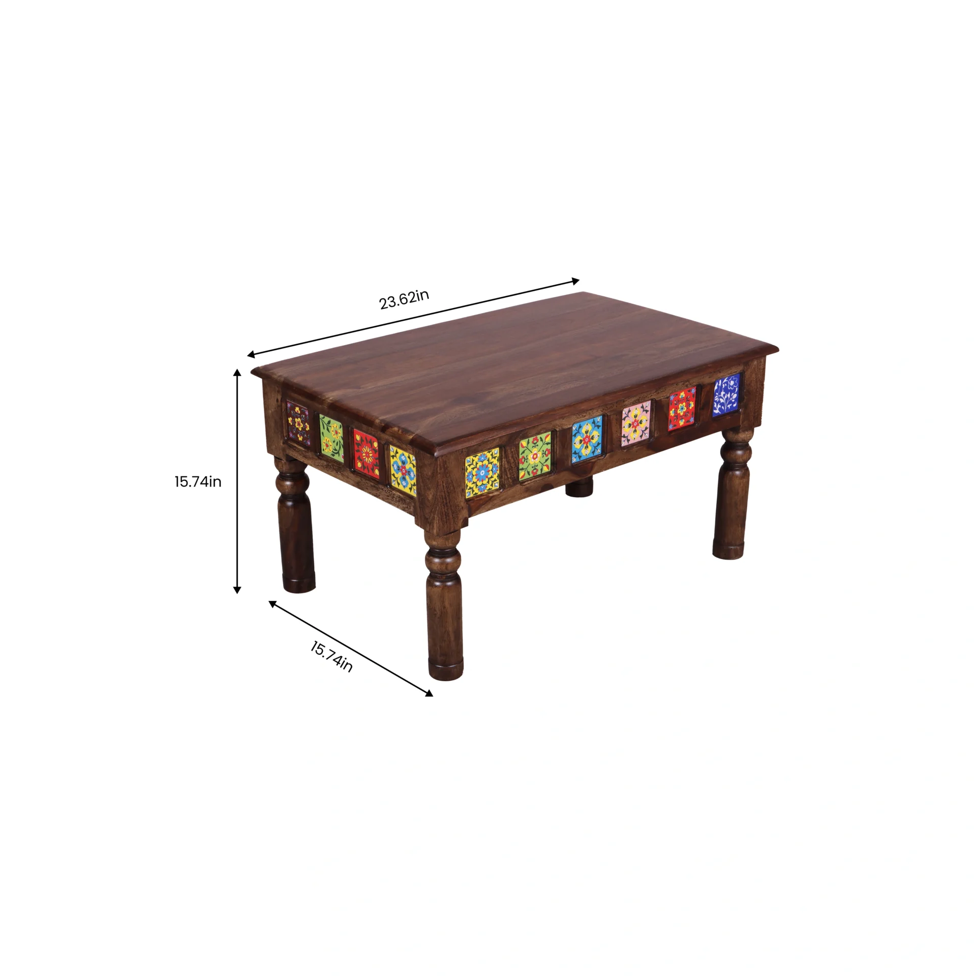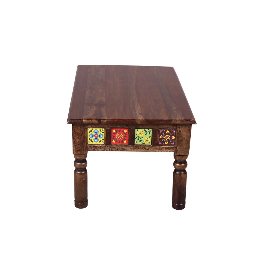 Add a vibrant touch of tradition and artistry to your living space with this handcrafted tile coffee table. Made from premium solid wood, the table features a smooth, rich brown finish that enhances the natural grain of the wood. The standout feature is the row of six hand-painted ceramic tiles embedded along the apron, each showcasing intricate floral and geometric designs in a range of vivid colors.