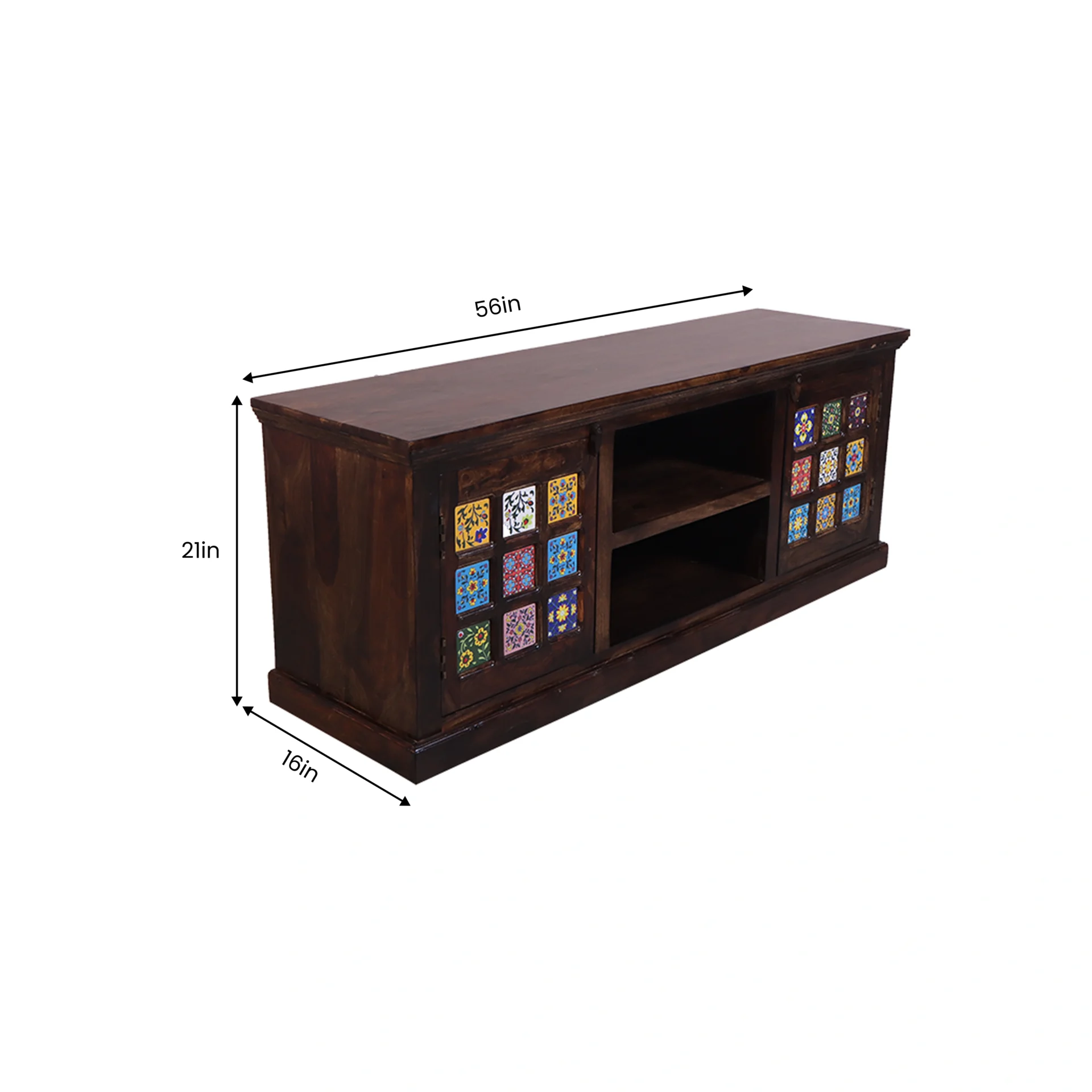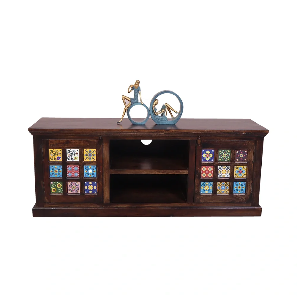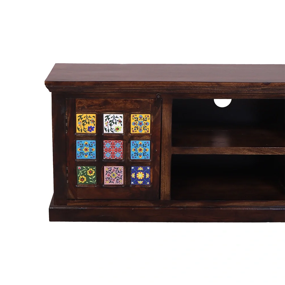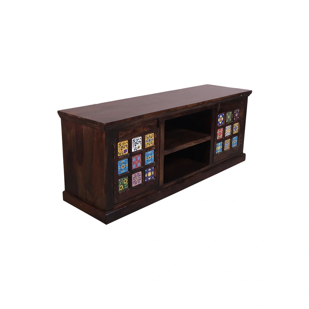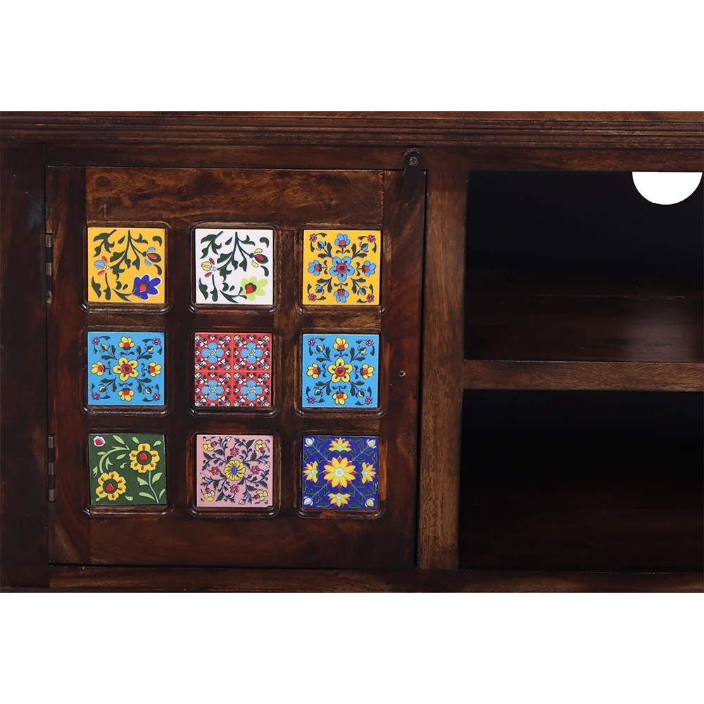 Bring home a vibrant blend of tradition and functionality with this handcrafted Tile TV Unit. Crafted from rich, durable wood, this unit features stunning hand-painted ceramic tiles on both cabinet doors each tile unique in its colorful design, showcasing fine artistry and cultural charm.