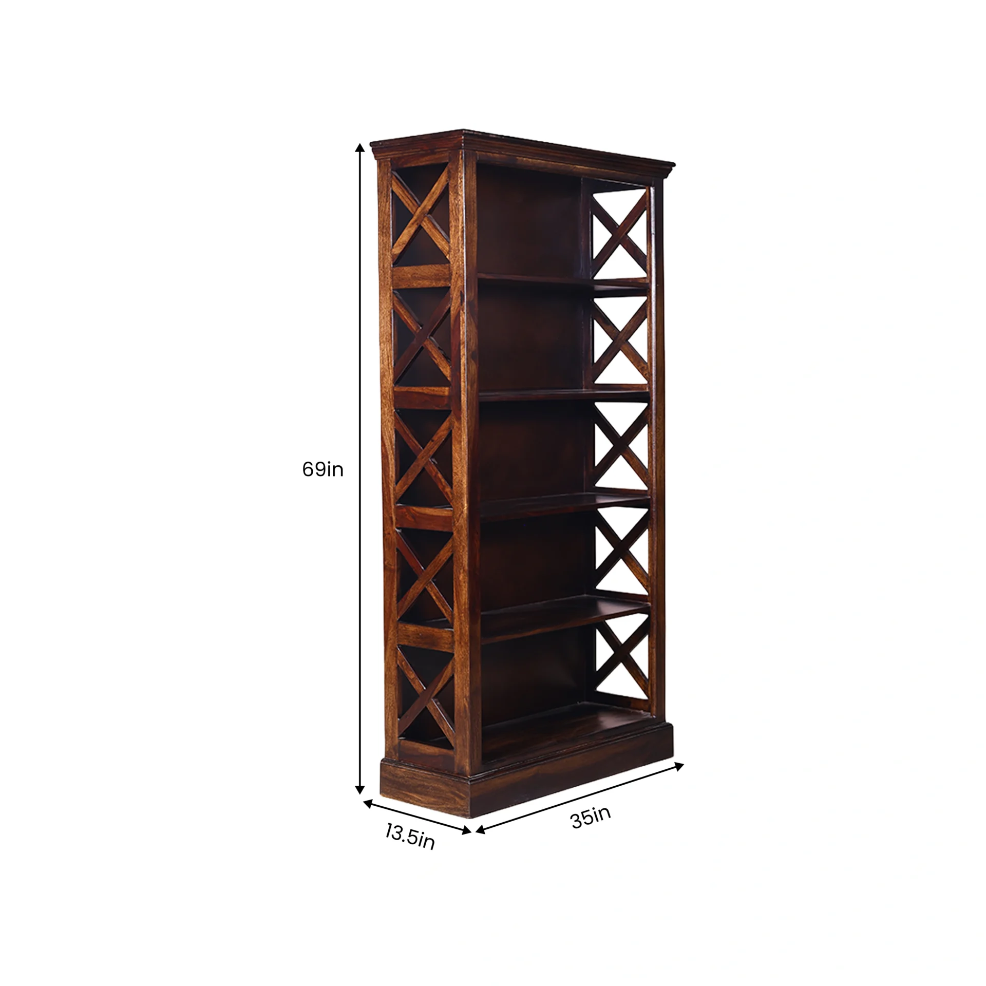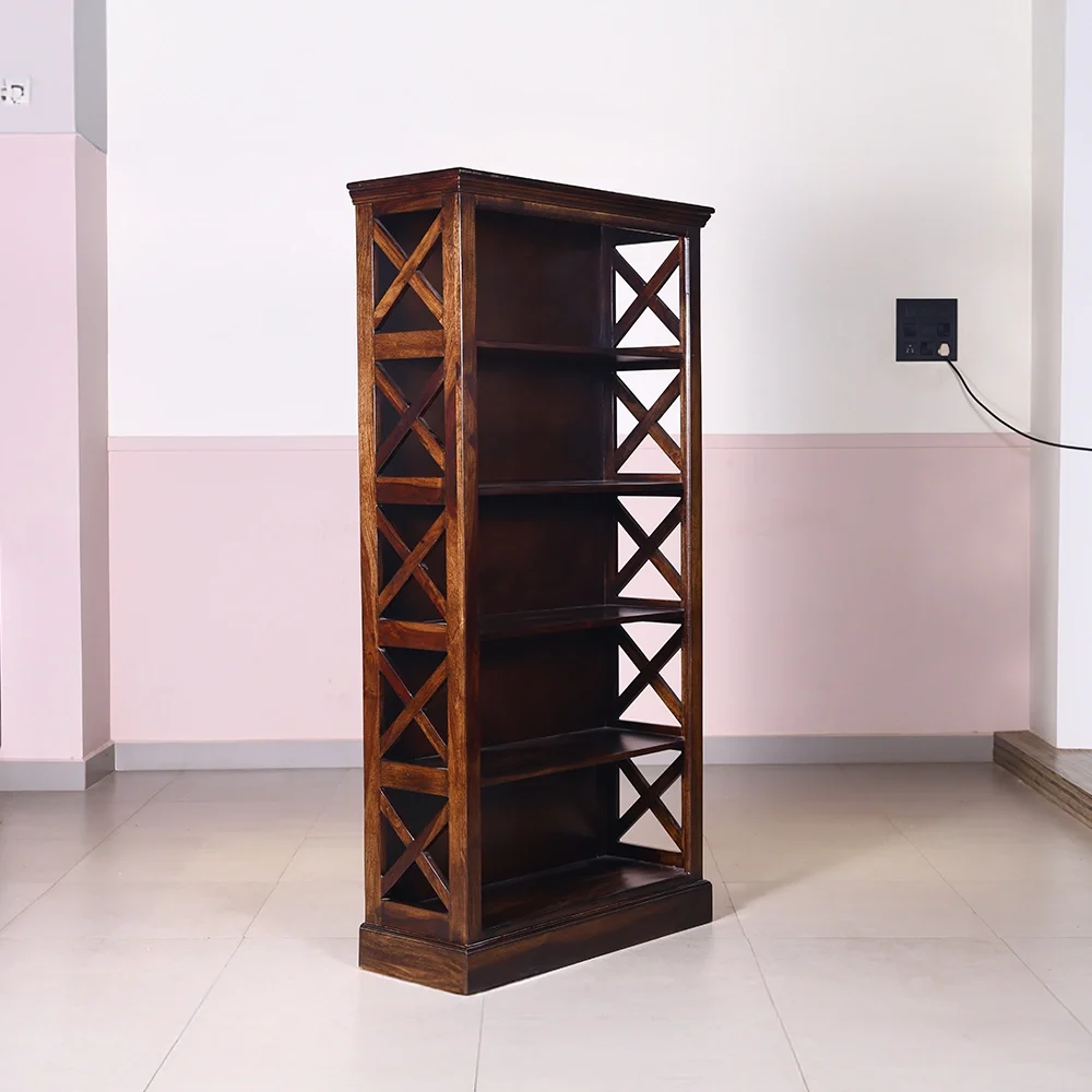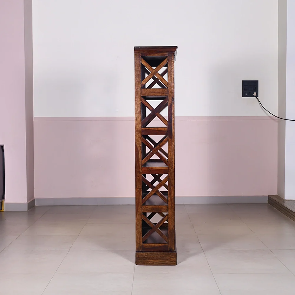 Featuring multiple open shelves and artistic cross-bar side paneling, it provides ample space for books, décor, plants, and collectibles while adding visual interest to any room. Its sturdy construction ensures long-lasting use, and the open design keeps essentials accessible and beautifully displayed.